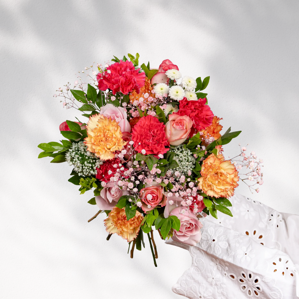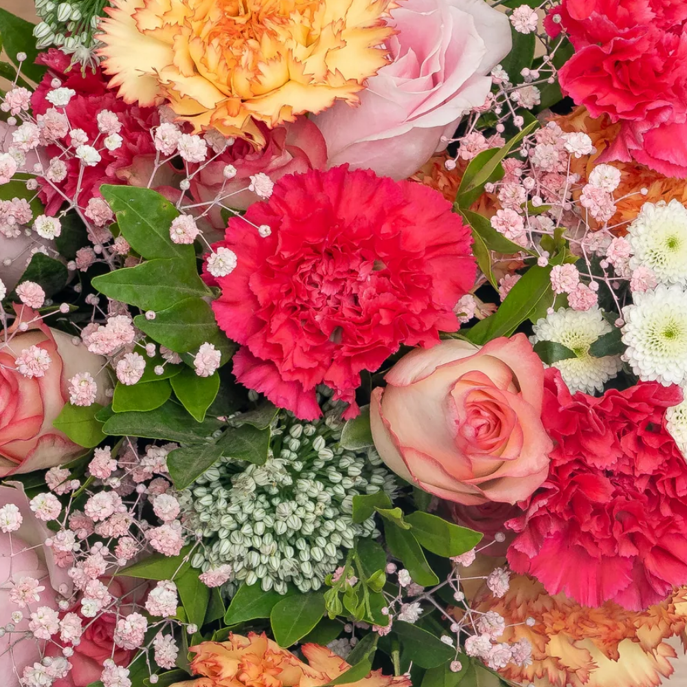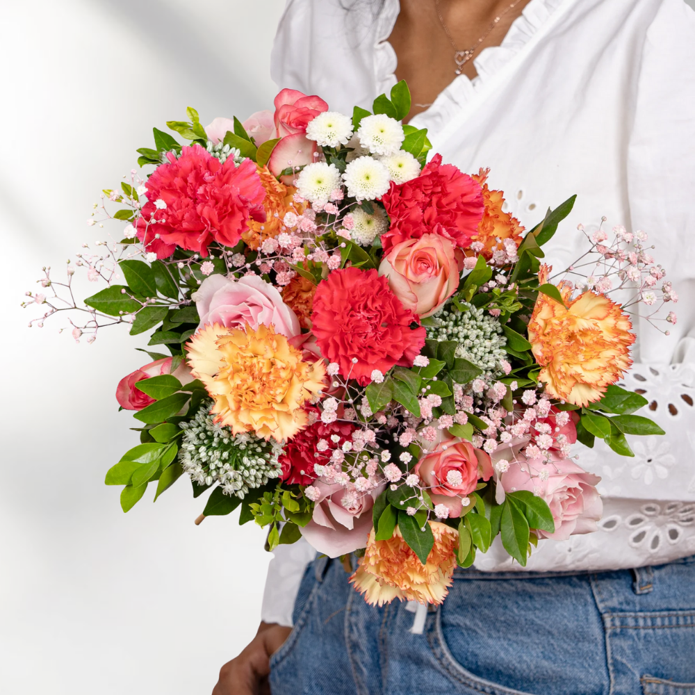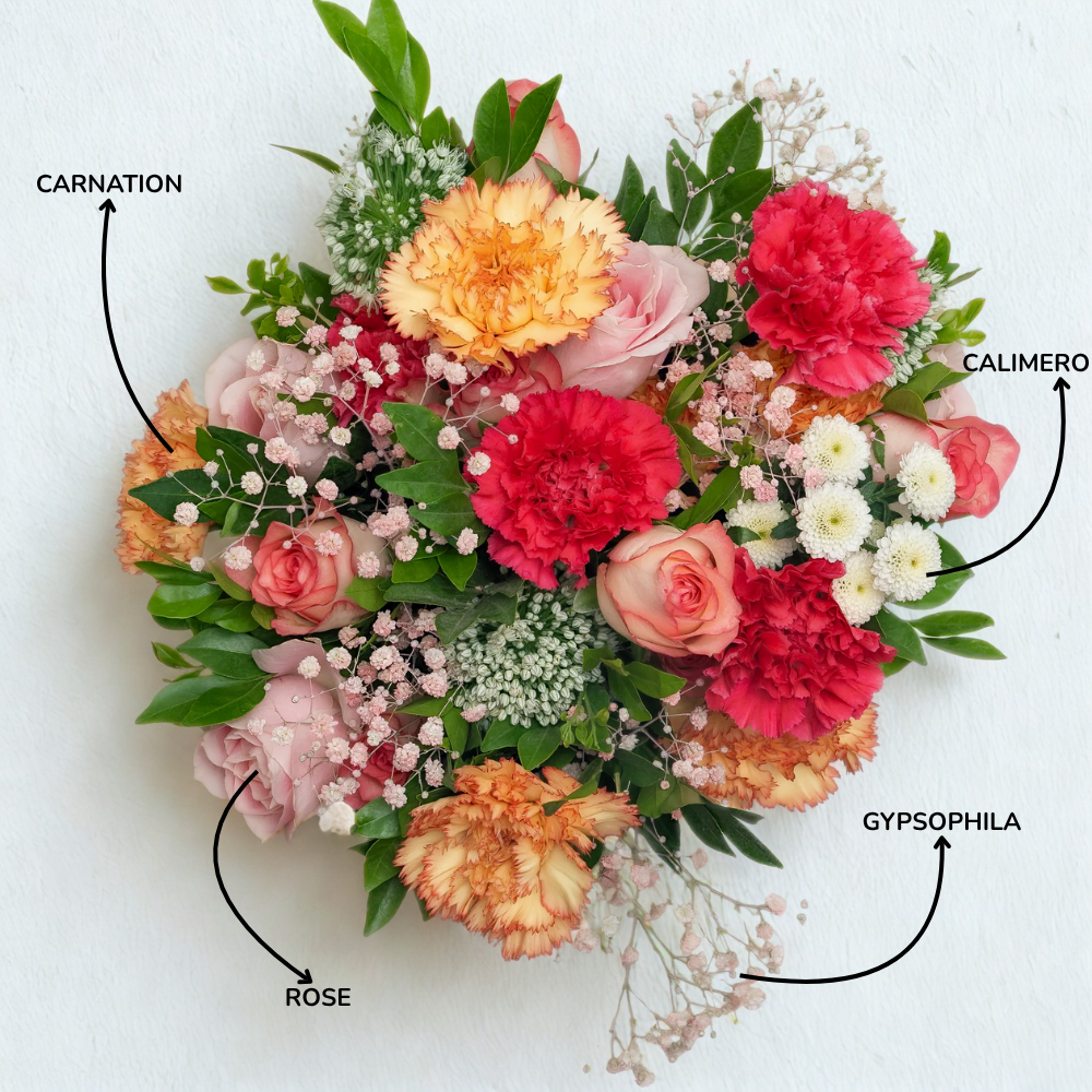 A vibrant blend of Jumilia roses, sweet roses, dark pink and orange carnations, alstroemeria, pink gypsophila, white calimeros, and kamini. A perfect bouquet to celebrate love and joy this Valentine’s Day.