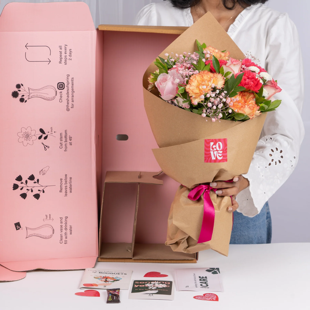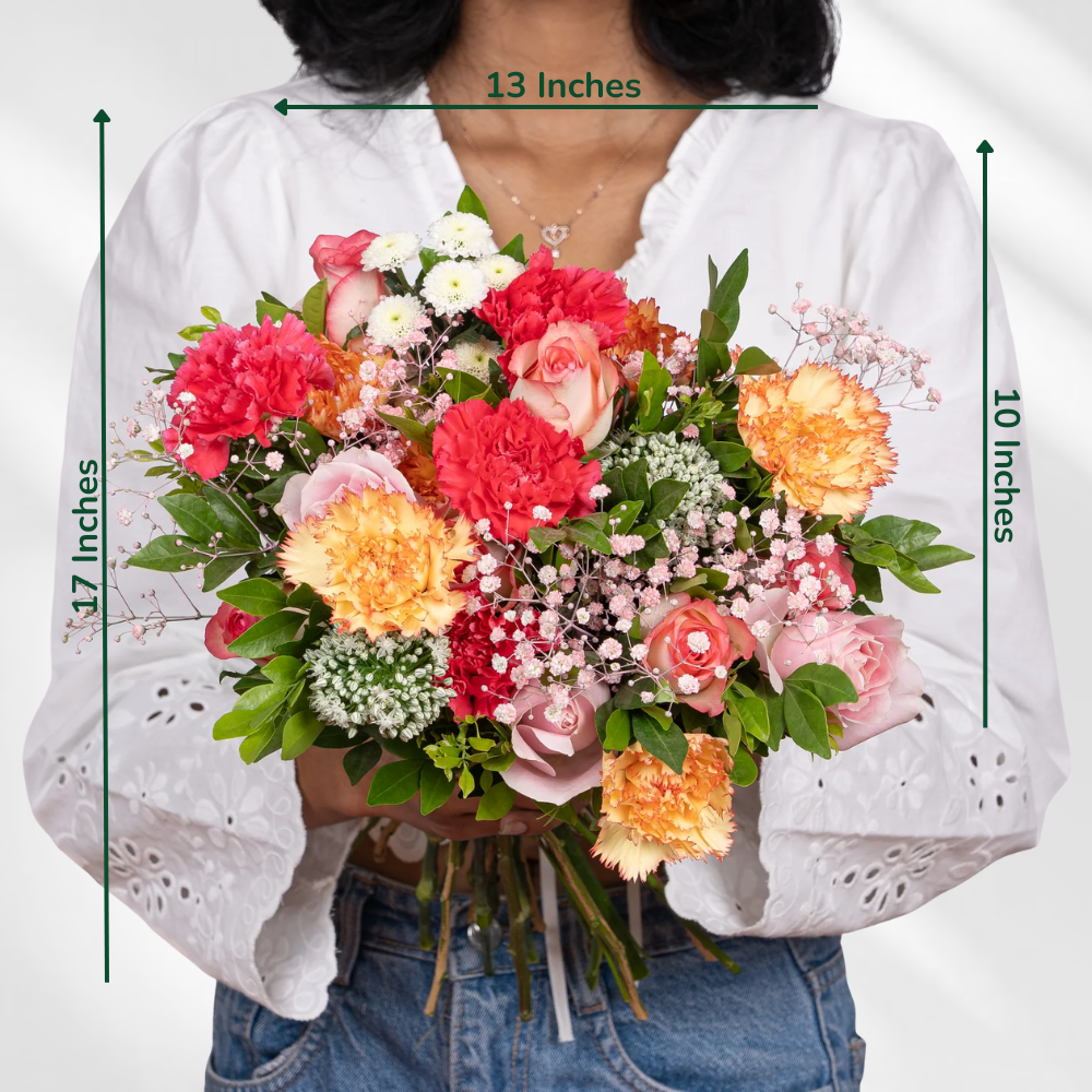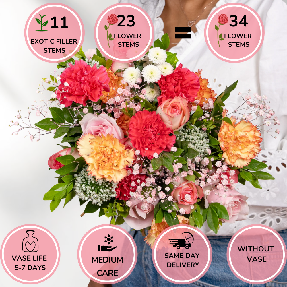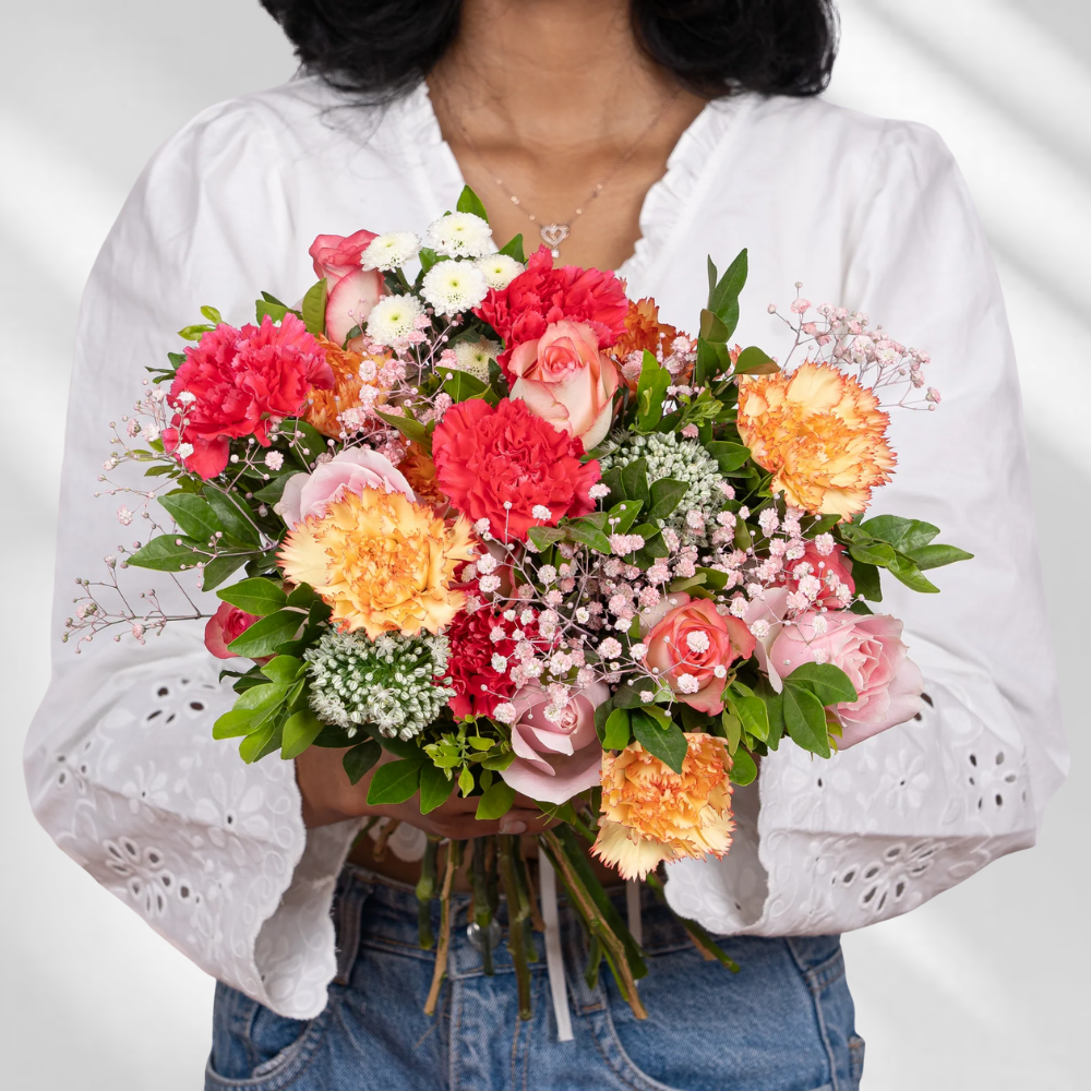 A vibrant blend of Jumilia roses, sweet roses, dark pink and orange carnations, alstroemeria, pink gypsophila, white calimeros, and kamini. A perfect bouquet to celebrate love and joy this Valentine’s Day.