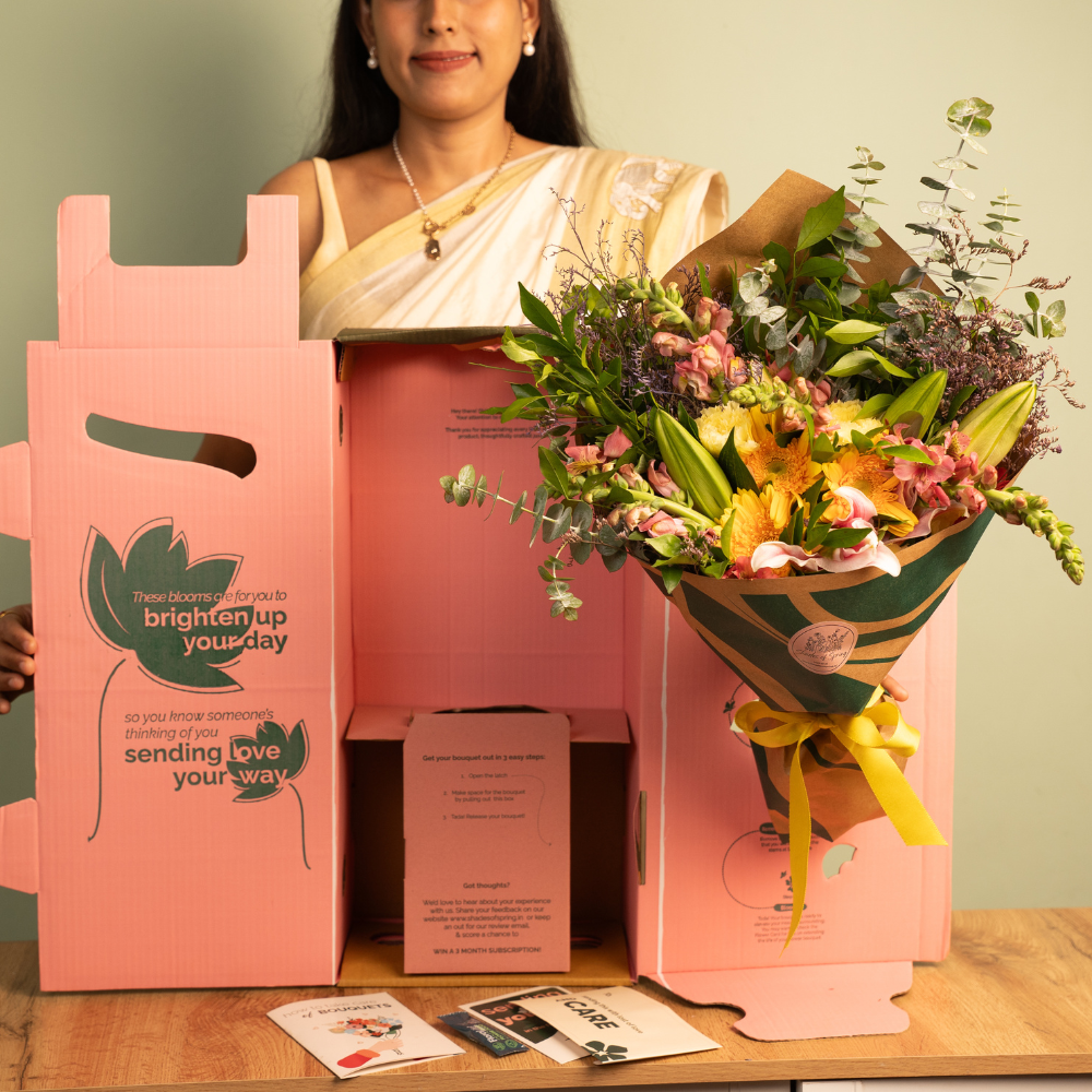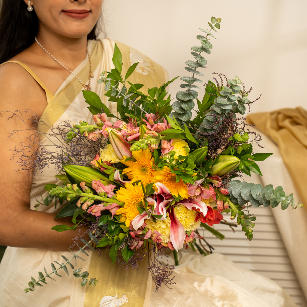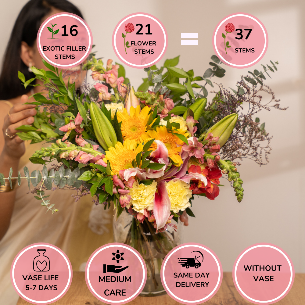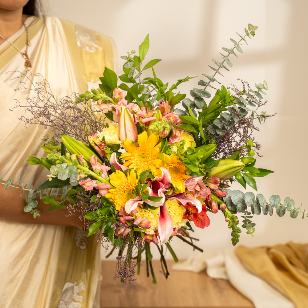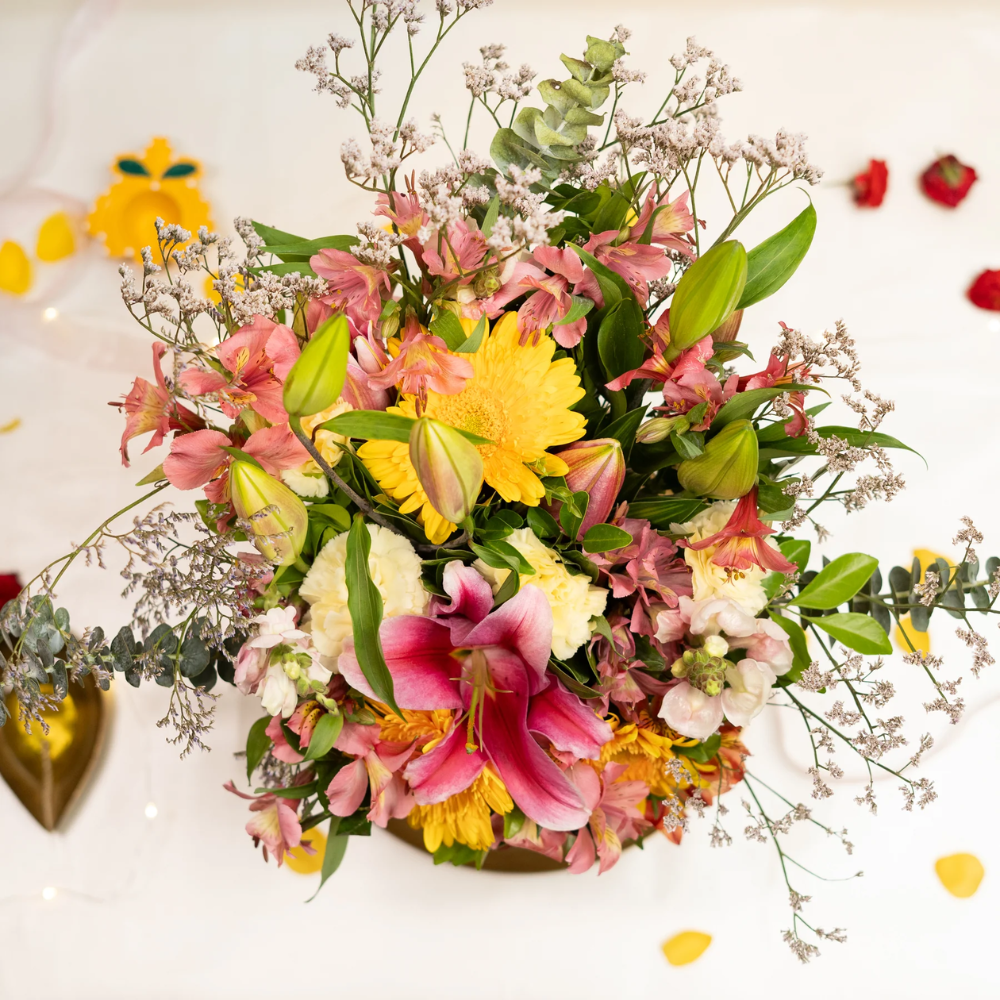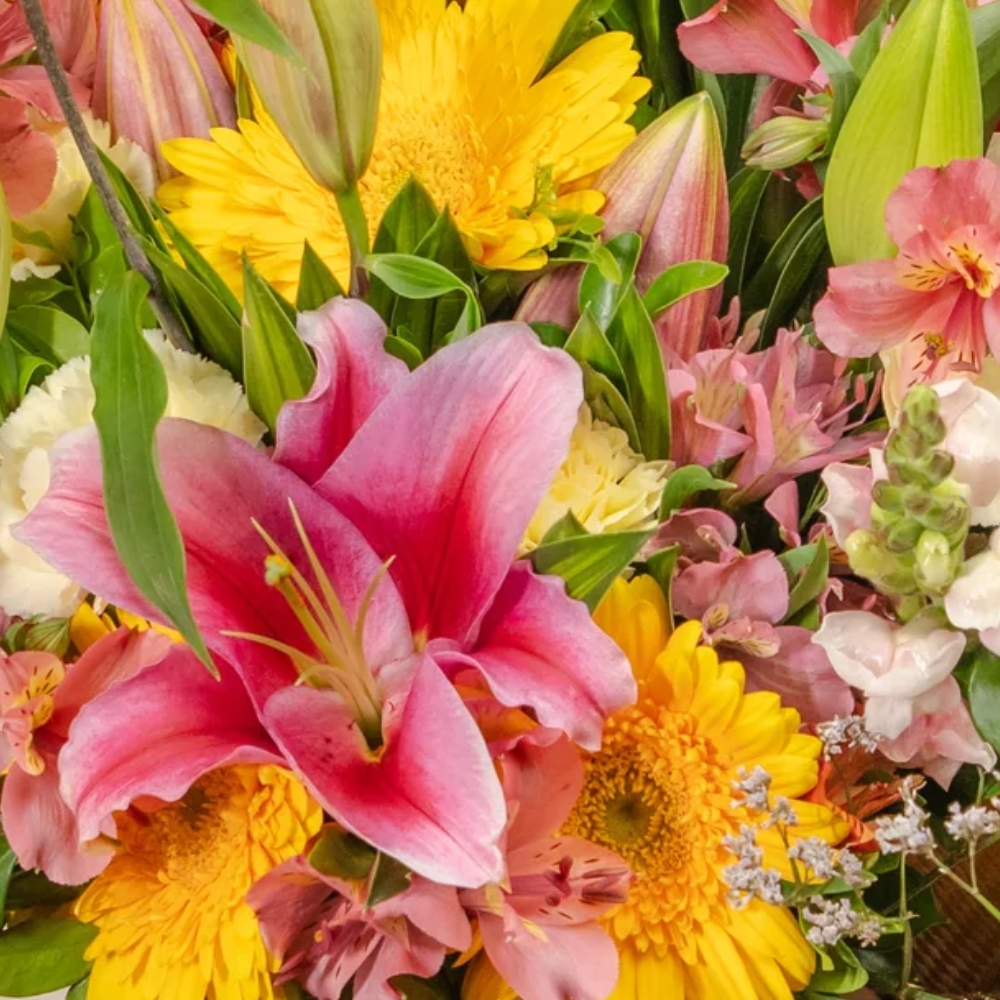 Oriental Lily pink, Snapdragon pink, Carnation yellow, Gerbera yellow, Alstromeria pink, Limonium, Jamaica, Baby doller, Kamini