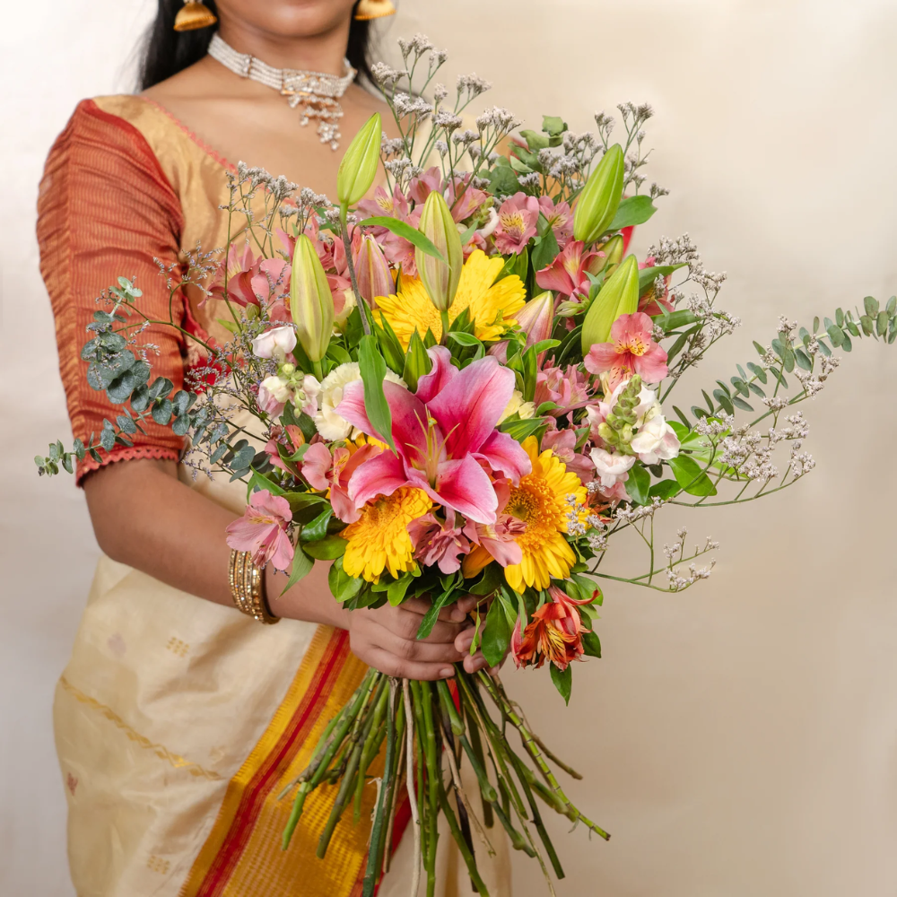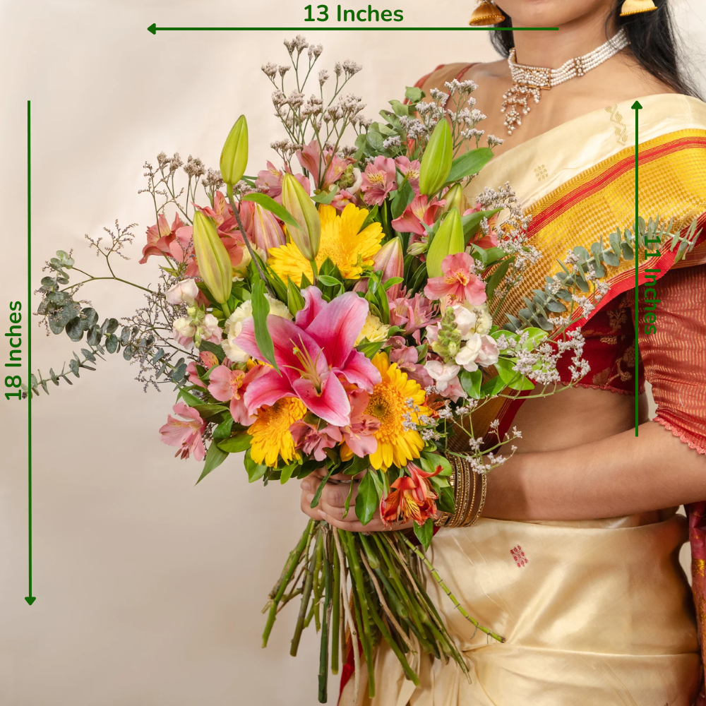 "Brighten any occasion with our Colorful Celebration Bouquet! This vibrant arrangement features sweet purple Roses, elegant pink Oriental Lilies, and cheerful Snapdragons. Accented by sunny yellow Carnations and Gerberas, along with lovely Alstroemeria and Limonium, this bouquet is completed with the charming Baby Doll blooms and the enchanting fragrance of Kamini. A delightful celebration of color and joy!"