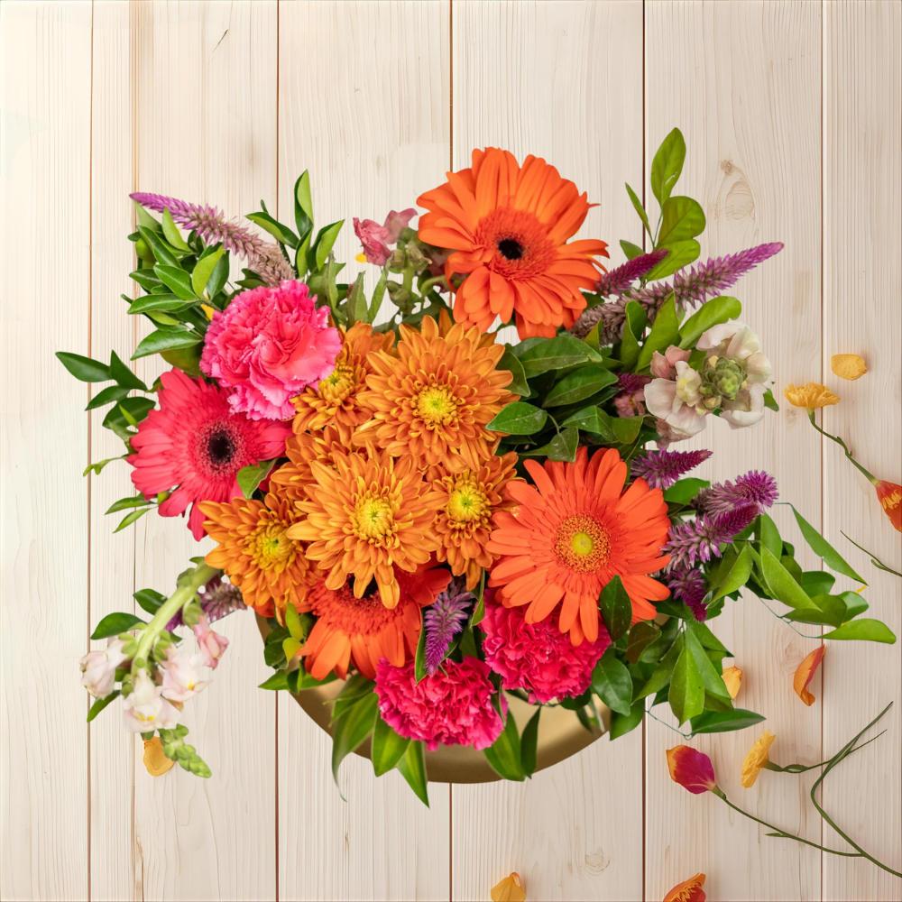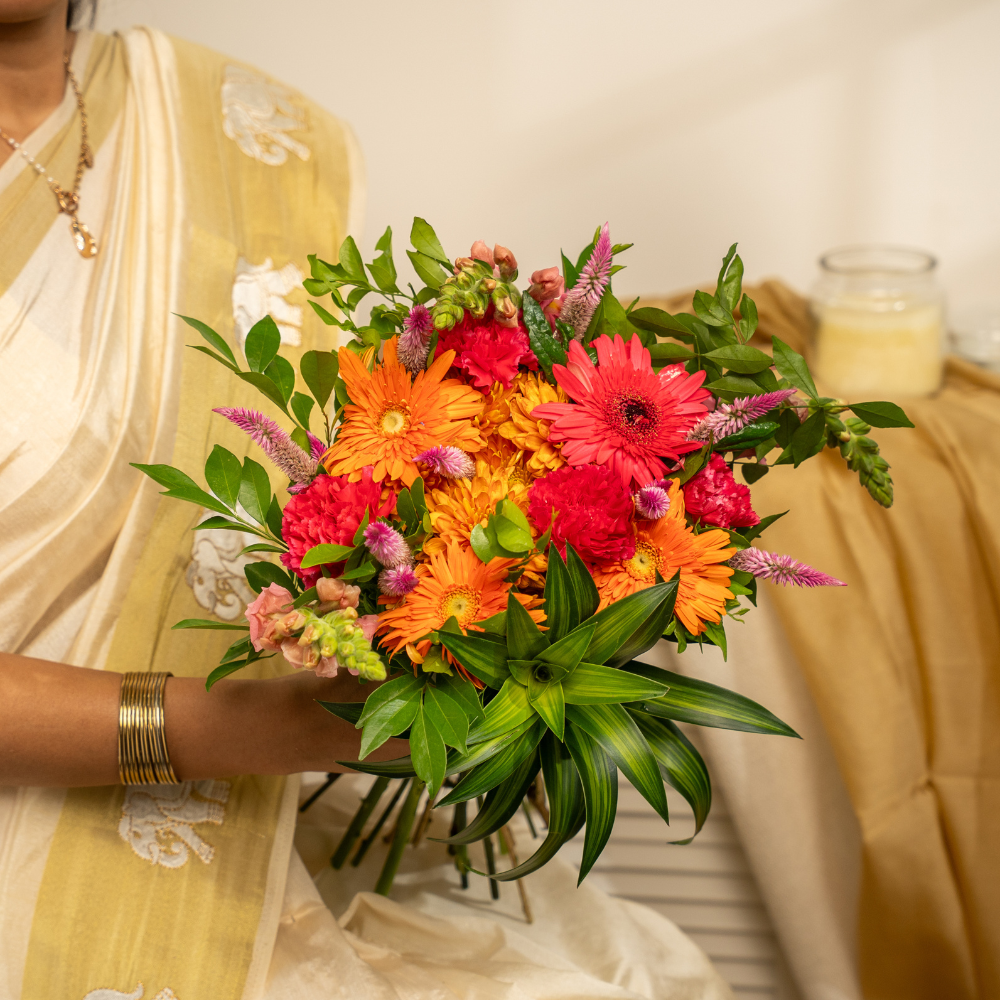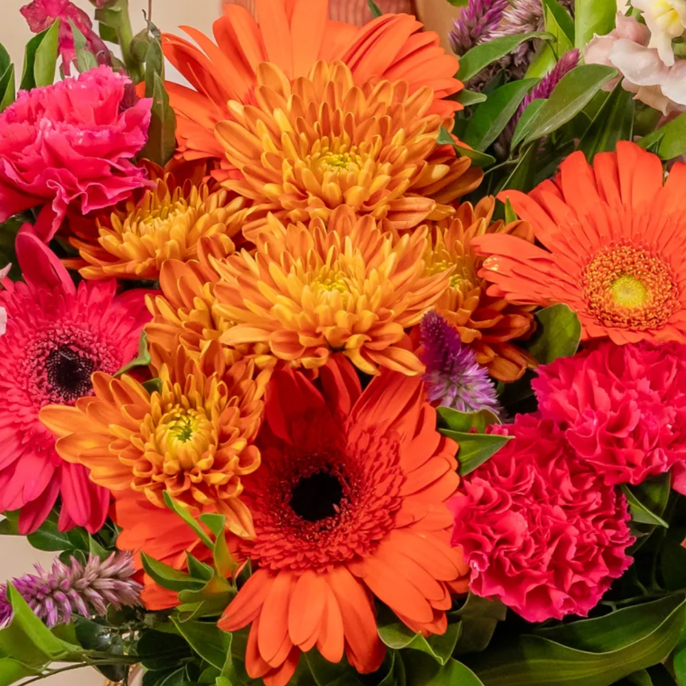 Gerbera orange pink, Chrysanthemum orange, Snapdragon pink, Rocket celocia, Carnation dark pink, Kamini, Jamaica