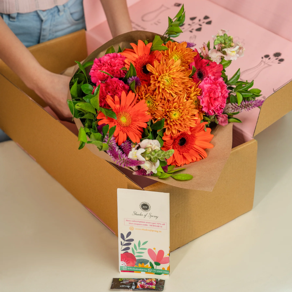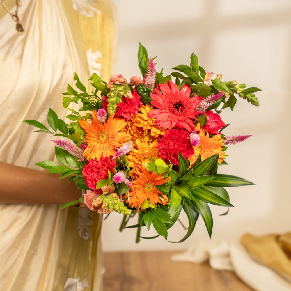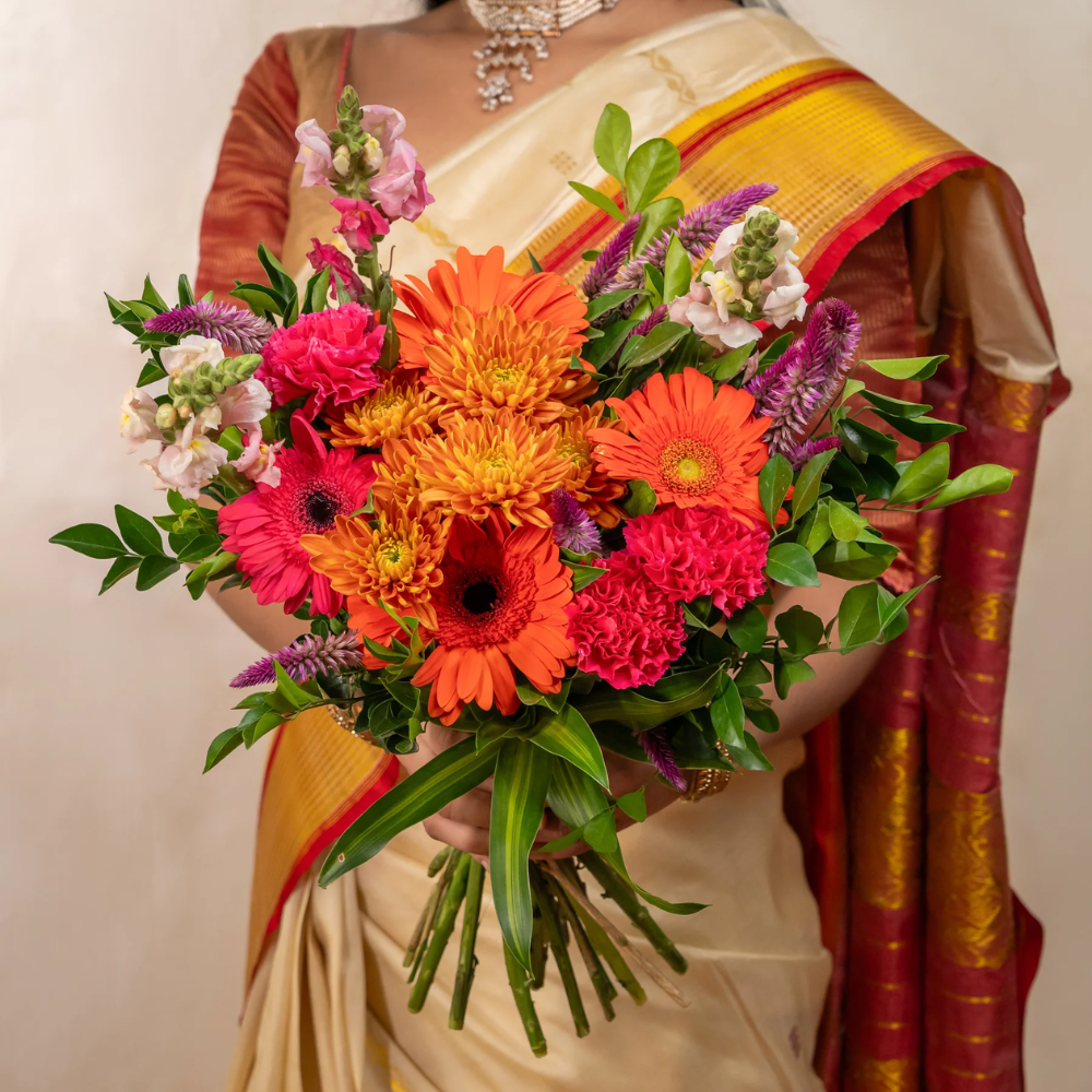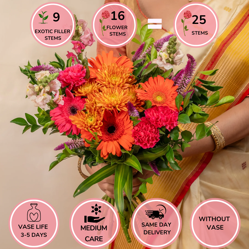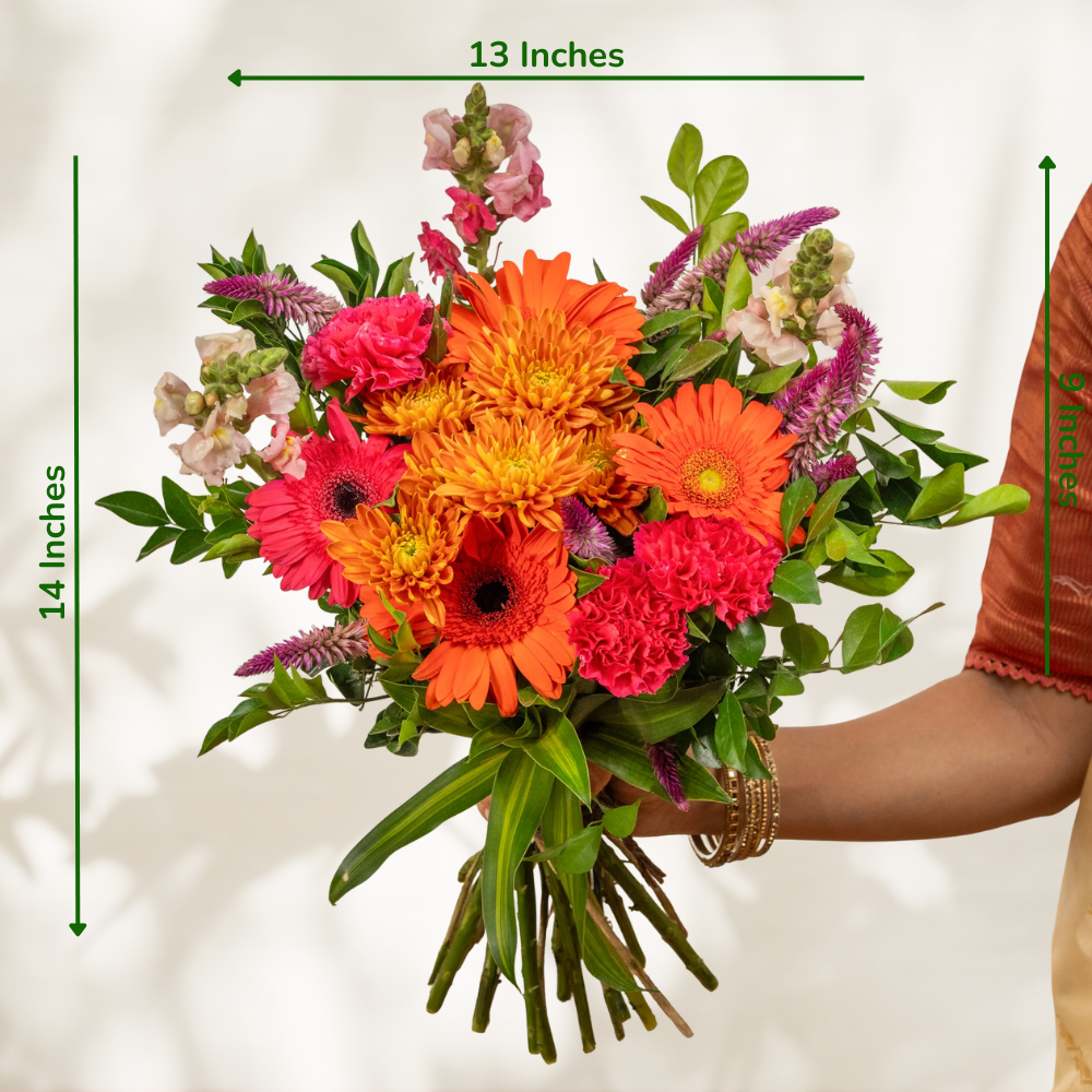 Brighten your day with our Pataka Hand-Tied Bouquet! Featuring cheerful Orange and Pink Gerberas, vibrant Orange Chrysanthemums, playful Pink Snapdragons, unique Rocket Celosia, deep Dark Pink Carnations, fragrant Kamini, and exotic Jamaica flowers, this lively arrangement brings a joyful burst of color to any occasion!