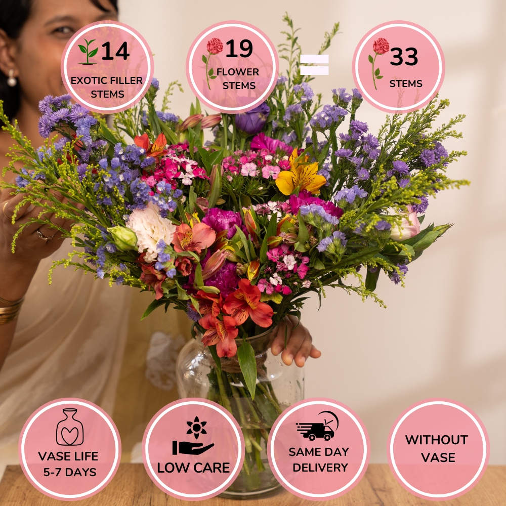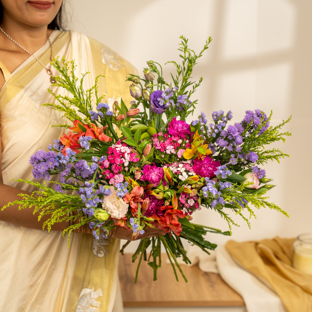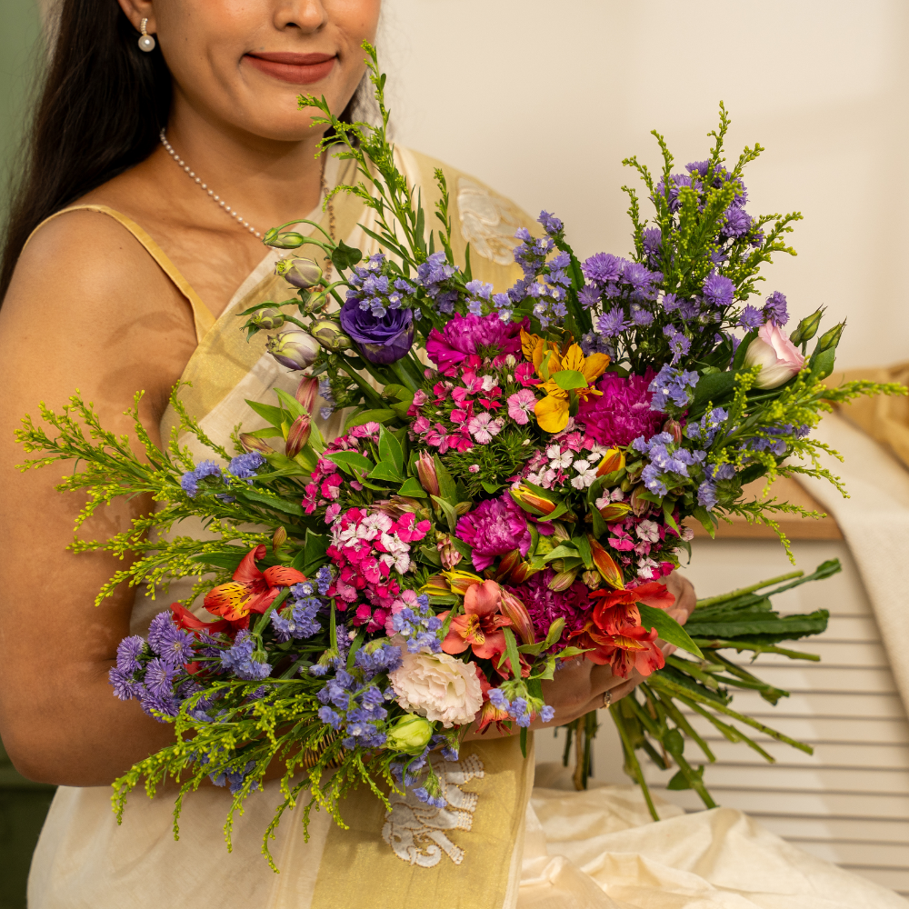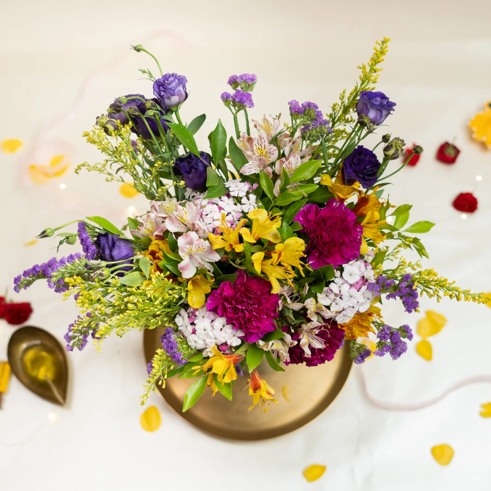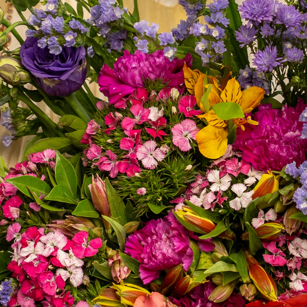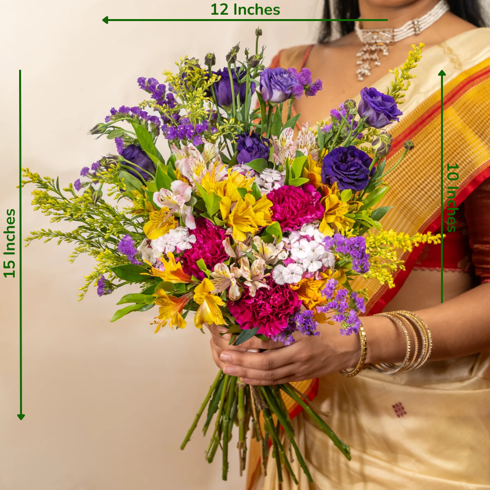 Eustoma purple, Sweet williums, Carnation purple, Alstromeria yellow, Statice purple, Golden, Kamini
