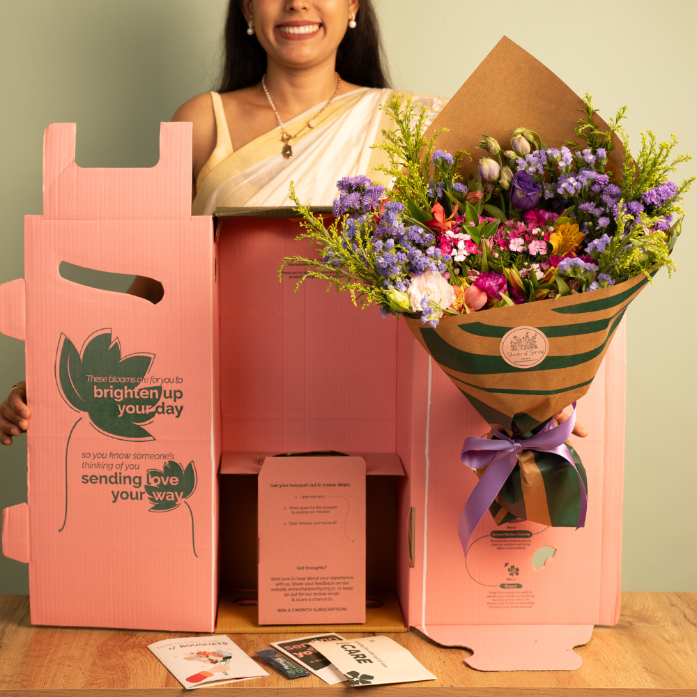 Brighten any space with our stunning bouquet featuring elegant Eustoma in rich purple, cheerful Sweet Williams, and vibrant Carnation. Accented by sunny Alstroemeria yellow, delicate Statice purple, and the warmth of Golden, this arrangement is a perfect blend of color and charm. Topped off with the enchanting Kamini, it’s a delightful celebration of nature’s beauty!