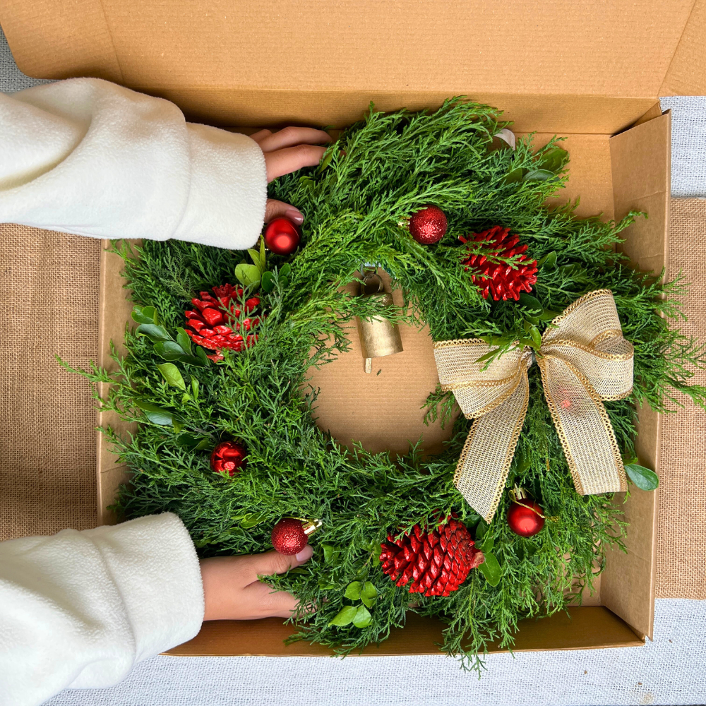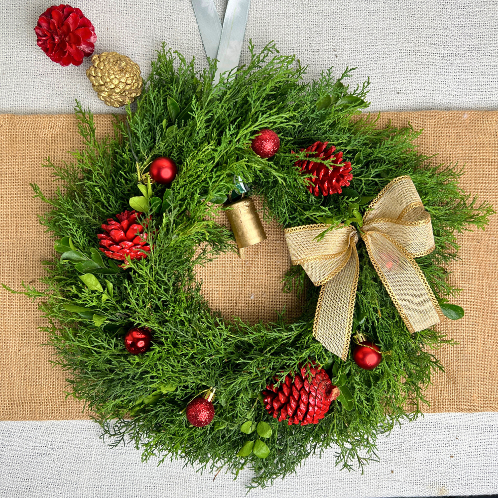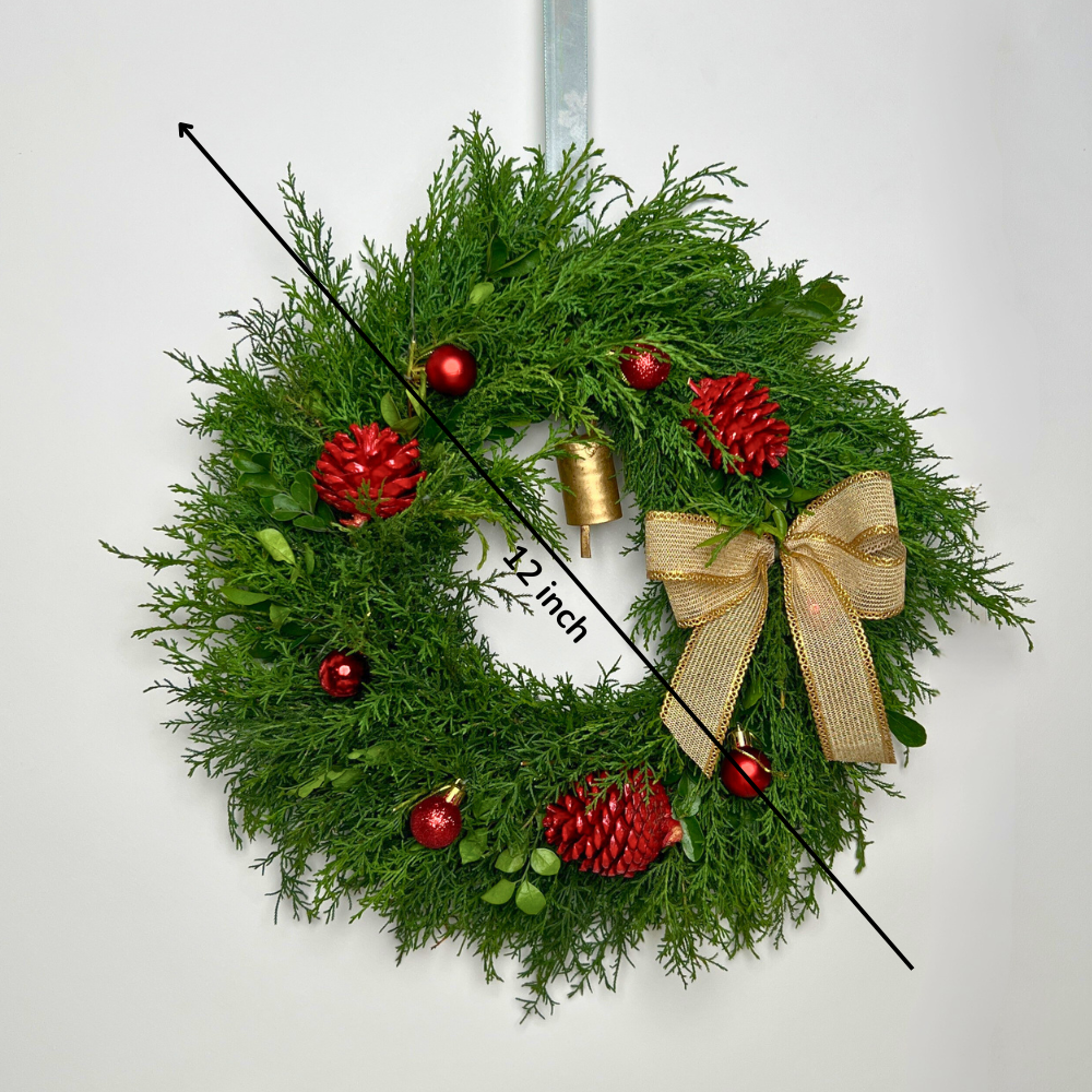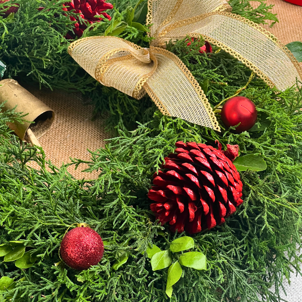 Wreath Contents - 12 Red Bauble, Pine cones & Comes with cow bell