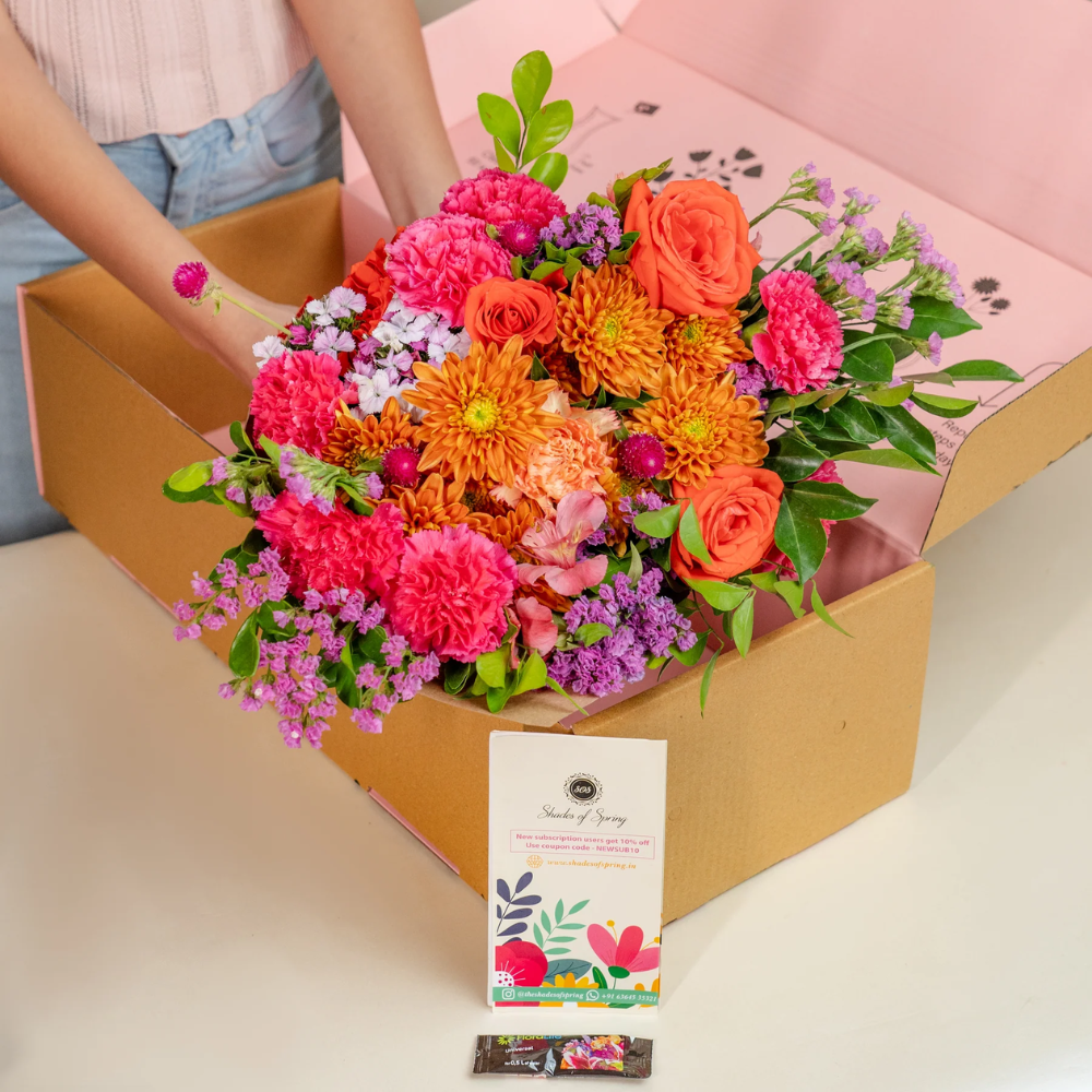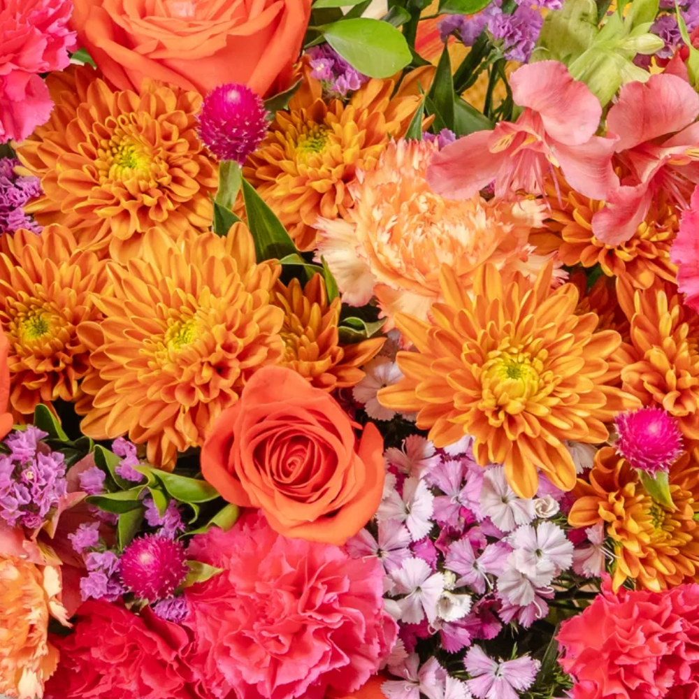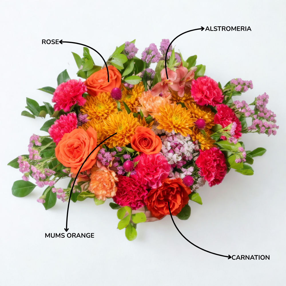 Rose orange, Carnation dark pink, Alstromeria pink, Mums orange, Statice pink, Sweetwilliums, Kamini