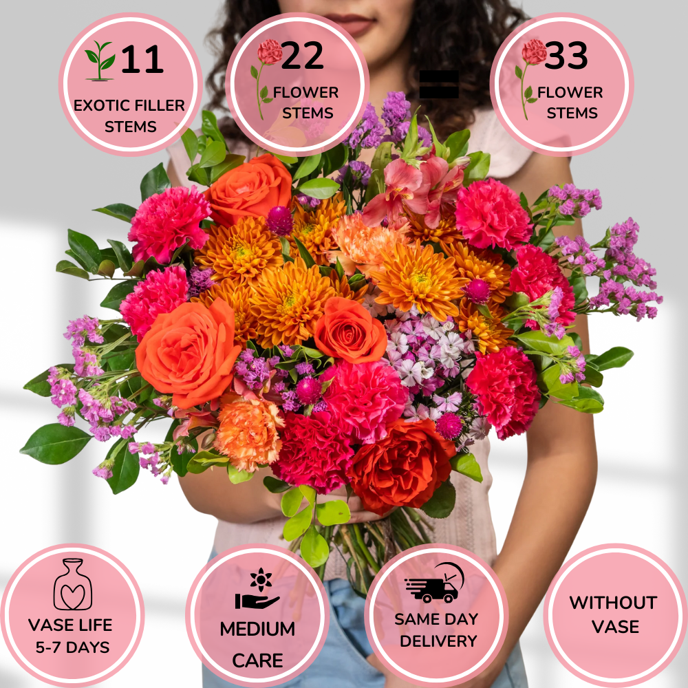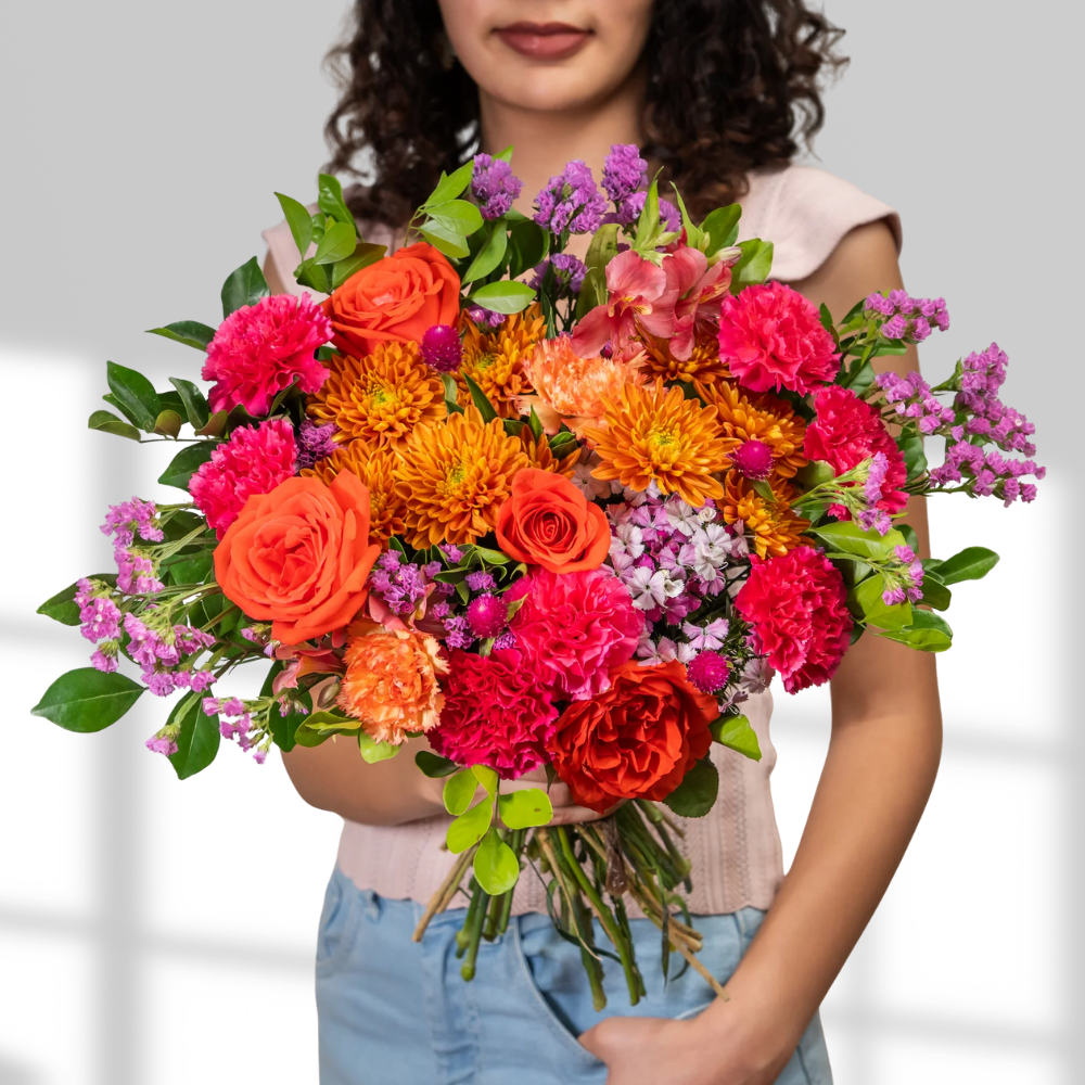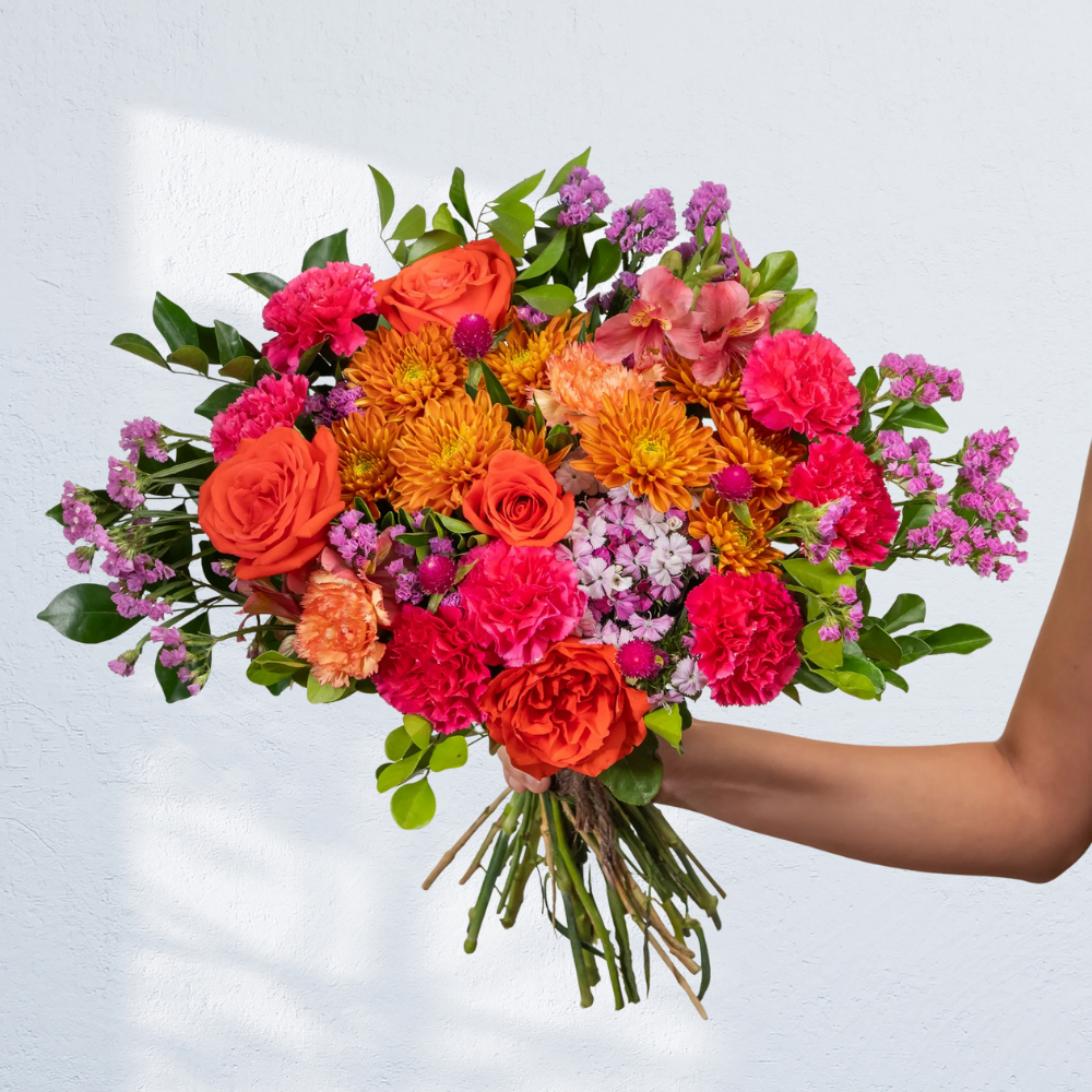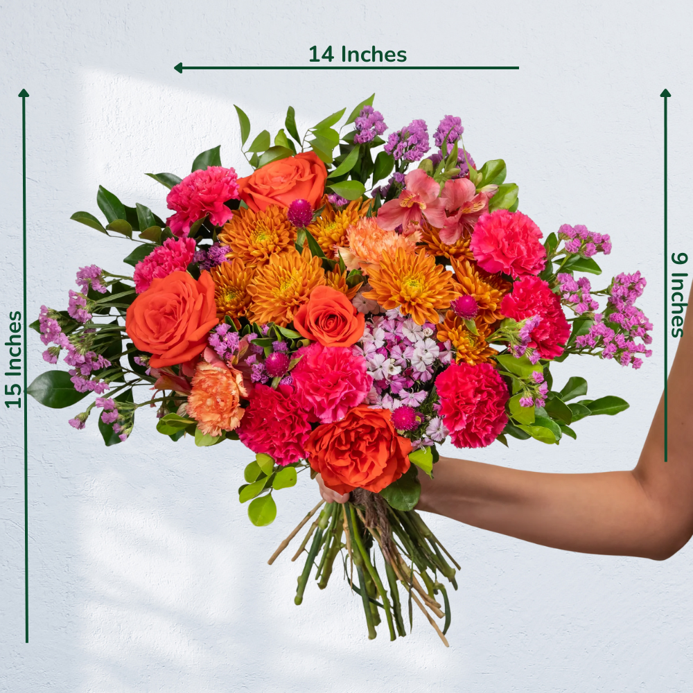 Ignite your senses with our Firecracker Hand-Tied Bouquet! Bursting with vibrant red, orange, and yellow blooms, this lively arrangement captures the essence of celebration.