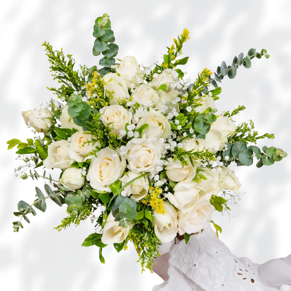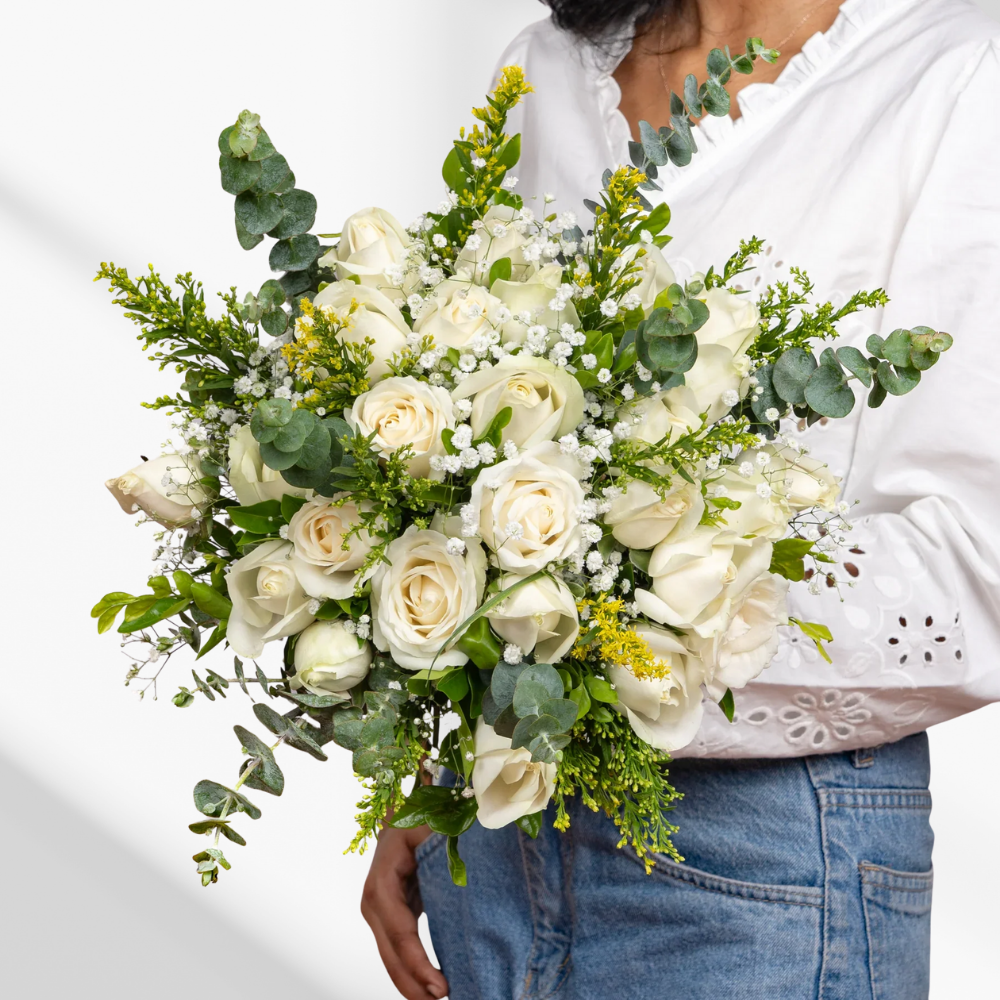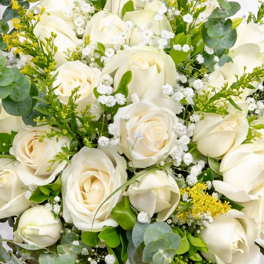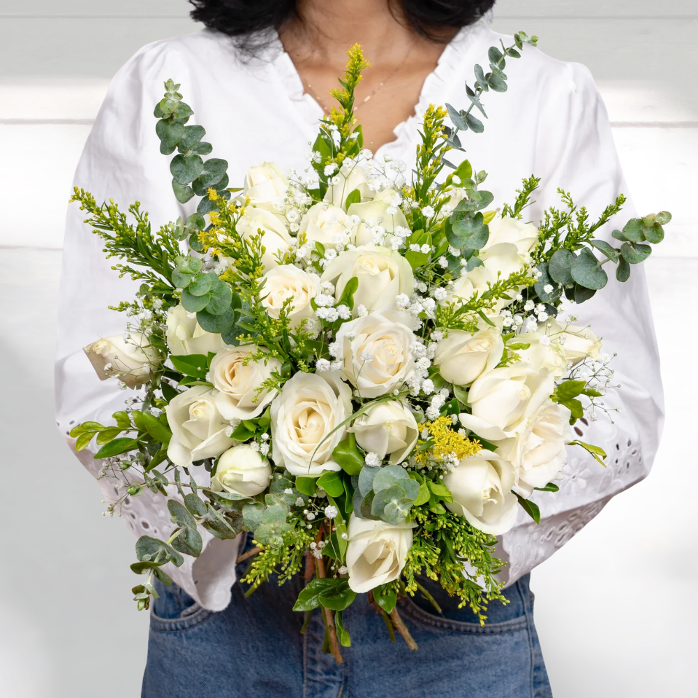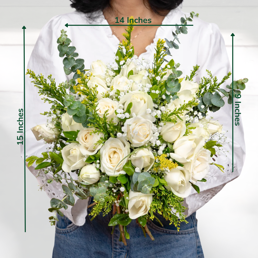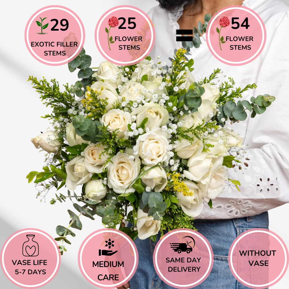 No. of stems: 25 White Roses, 30 Exotic Leaves and Fillers