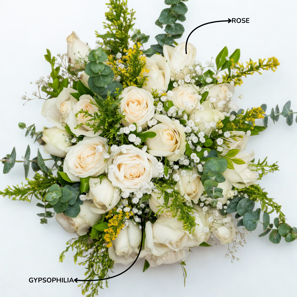 Types of flowers: White Roses, Ivy leaves, eucalyptus leaves and gypsophila.