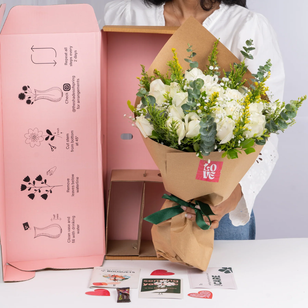 The chic combination of roses and baby's breath has always been the people's favourite choice of bouquet, if ever there was an award for that. It is the perfect anniversary gift or birthday present for your dearly loved ones.