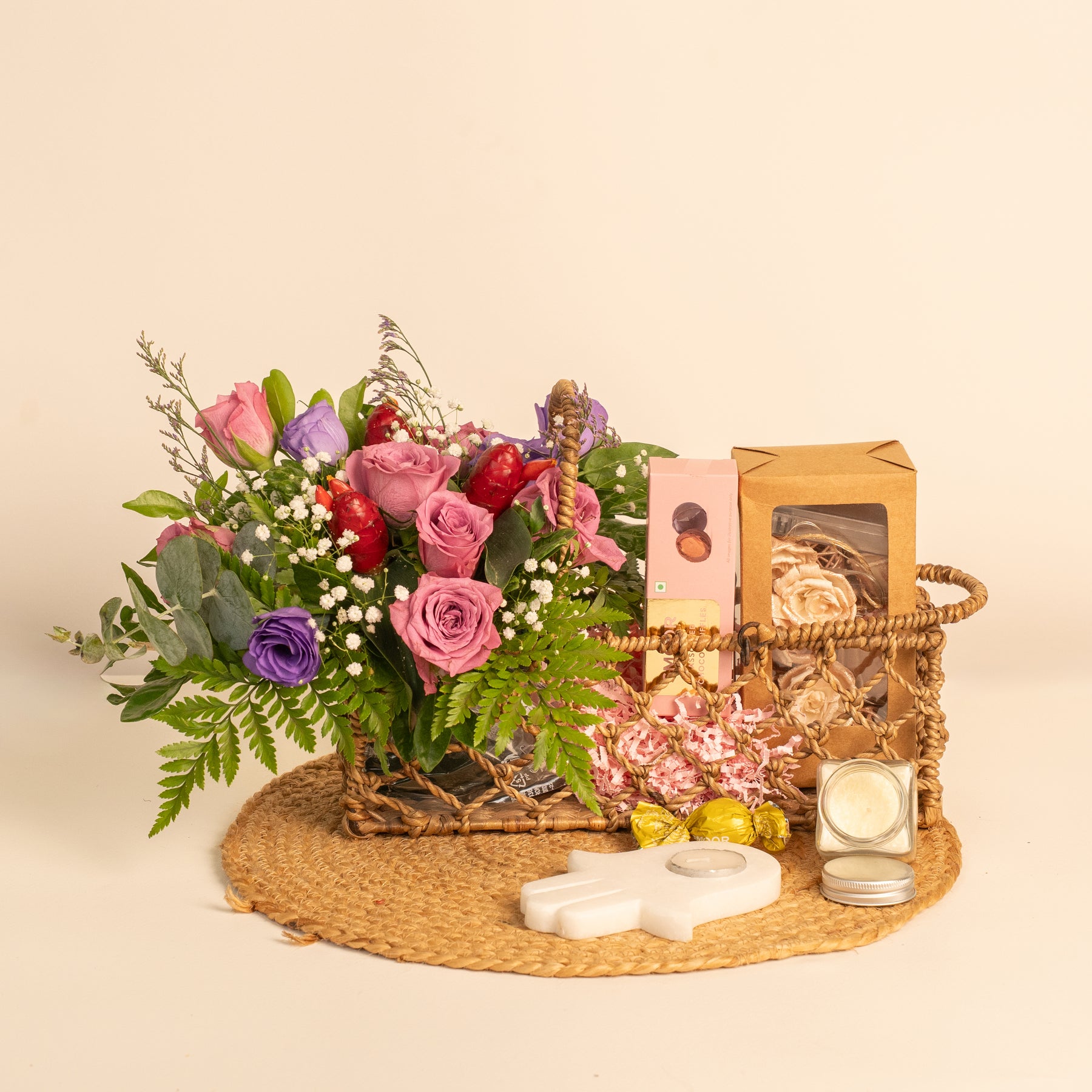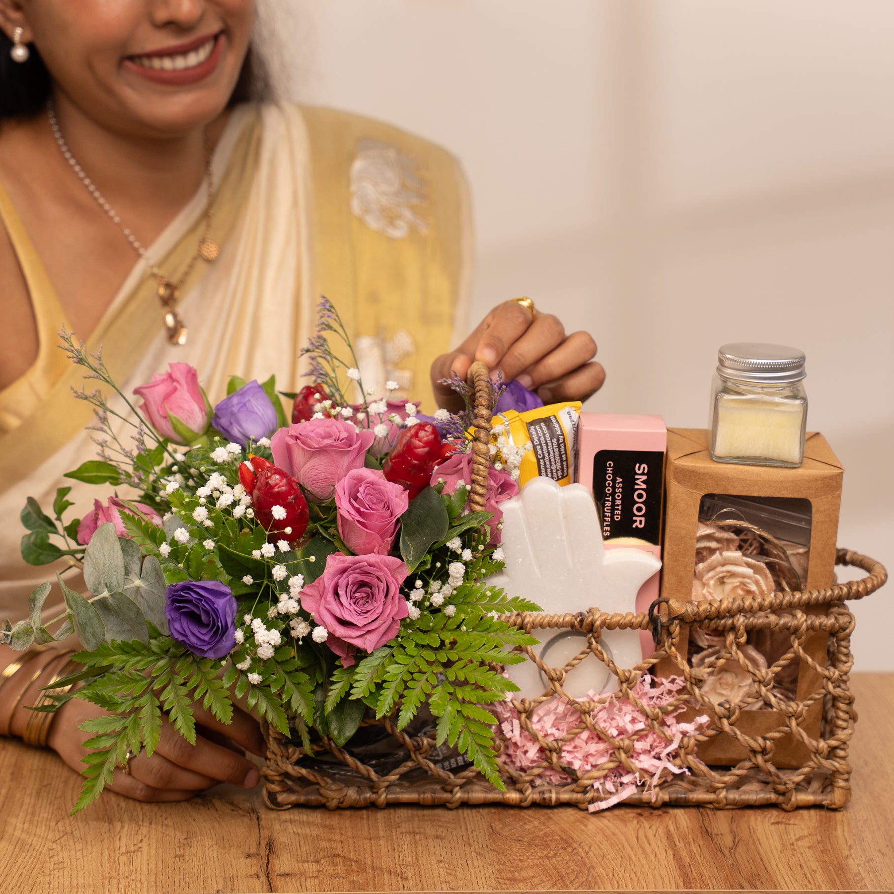 Our Rose Essence Elixir Basket has the most striking colour palette that has the power to become the highlight of this joyous occasion by encapsulating everyone's attention in a second. The exotic collection of Rose purple, Eustoma, Gypso and Baby doller makes the arrangement captivating and make all occasion sparkle with unique baskets for everyone on your wish list!