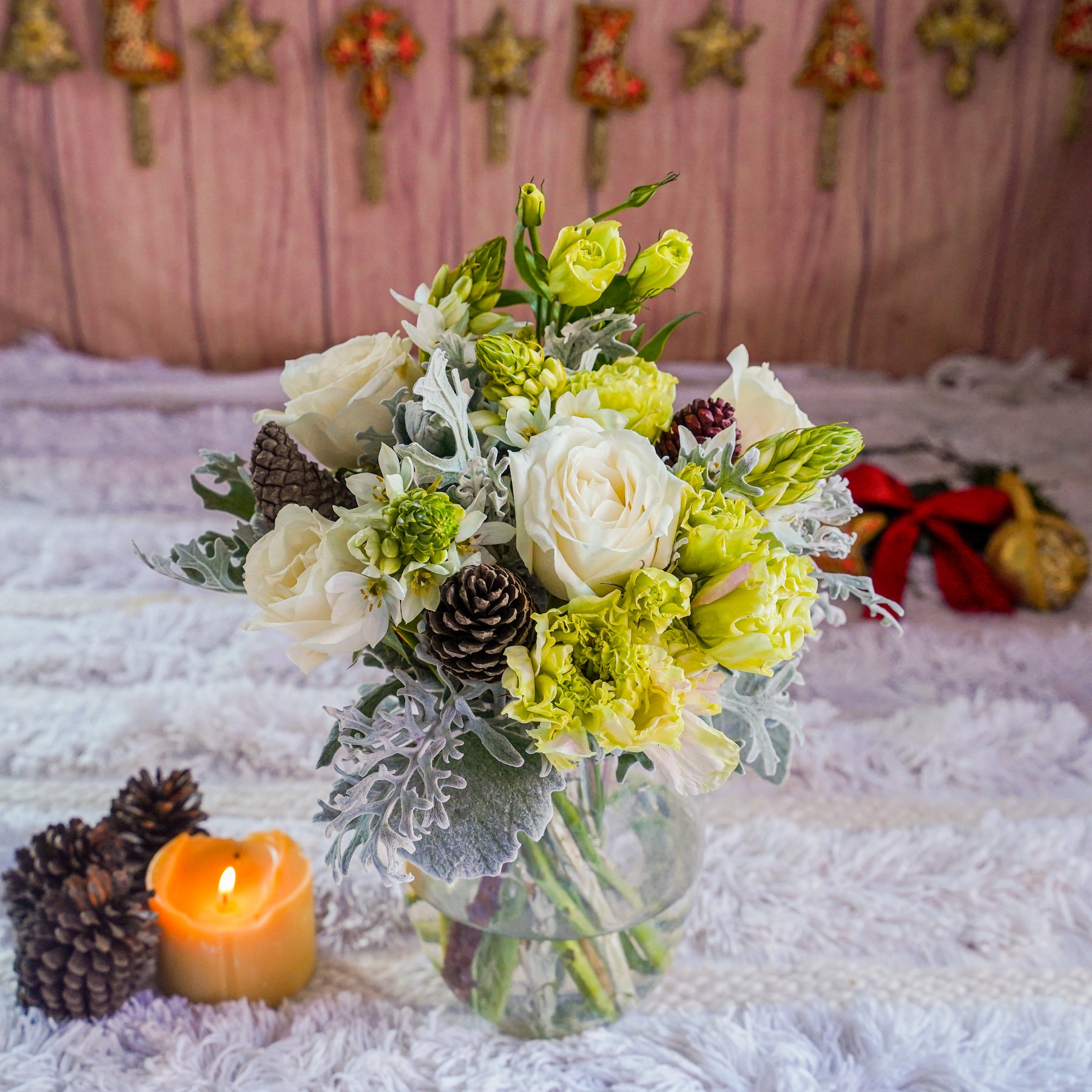 The white floral beauty is a Christmas showstopper,  with snow dusted green fillers our mini bouquet embodies the spirit of winter and Christmas celebrations .