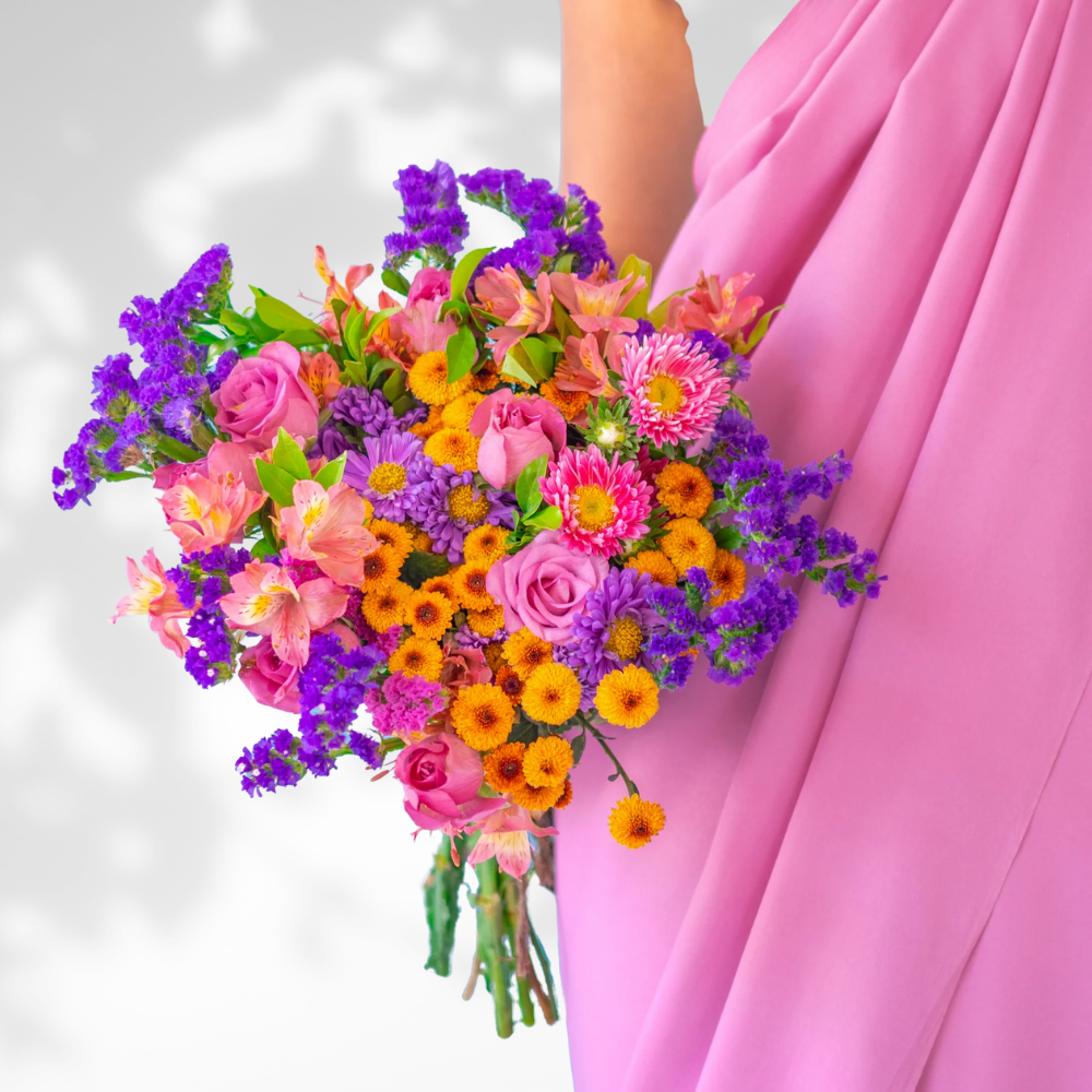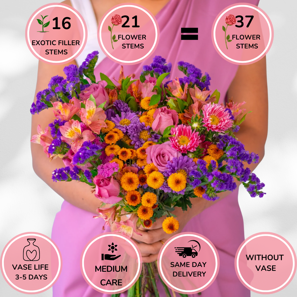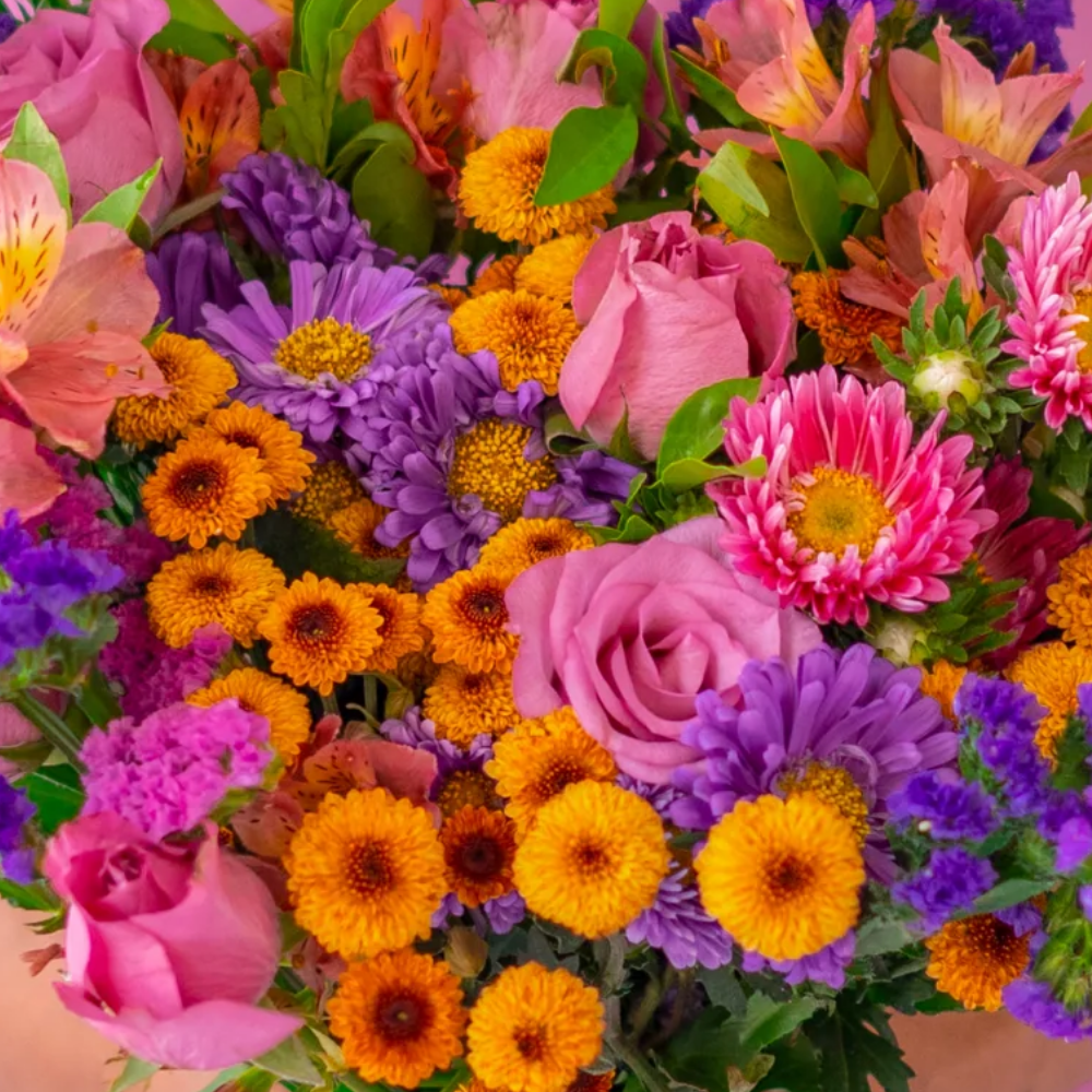 A colorful bouquet featuring shades of purple, pink with orange tones creating a bold and striking contrast. It is a perfect combination of passion and devotion and is a perfect gift for her.