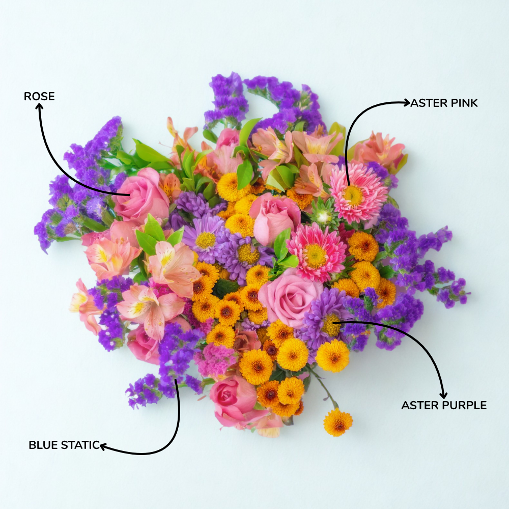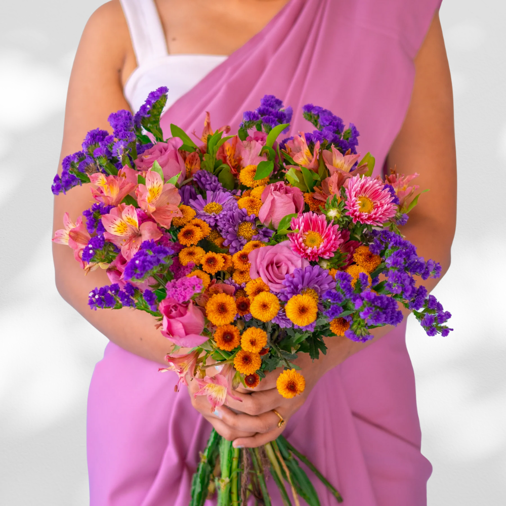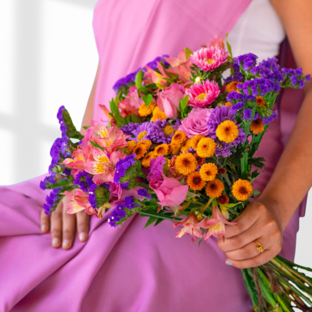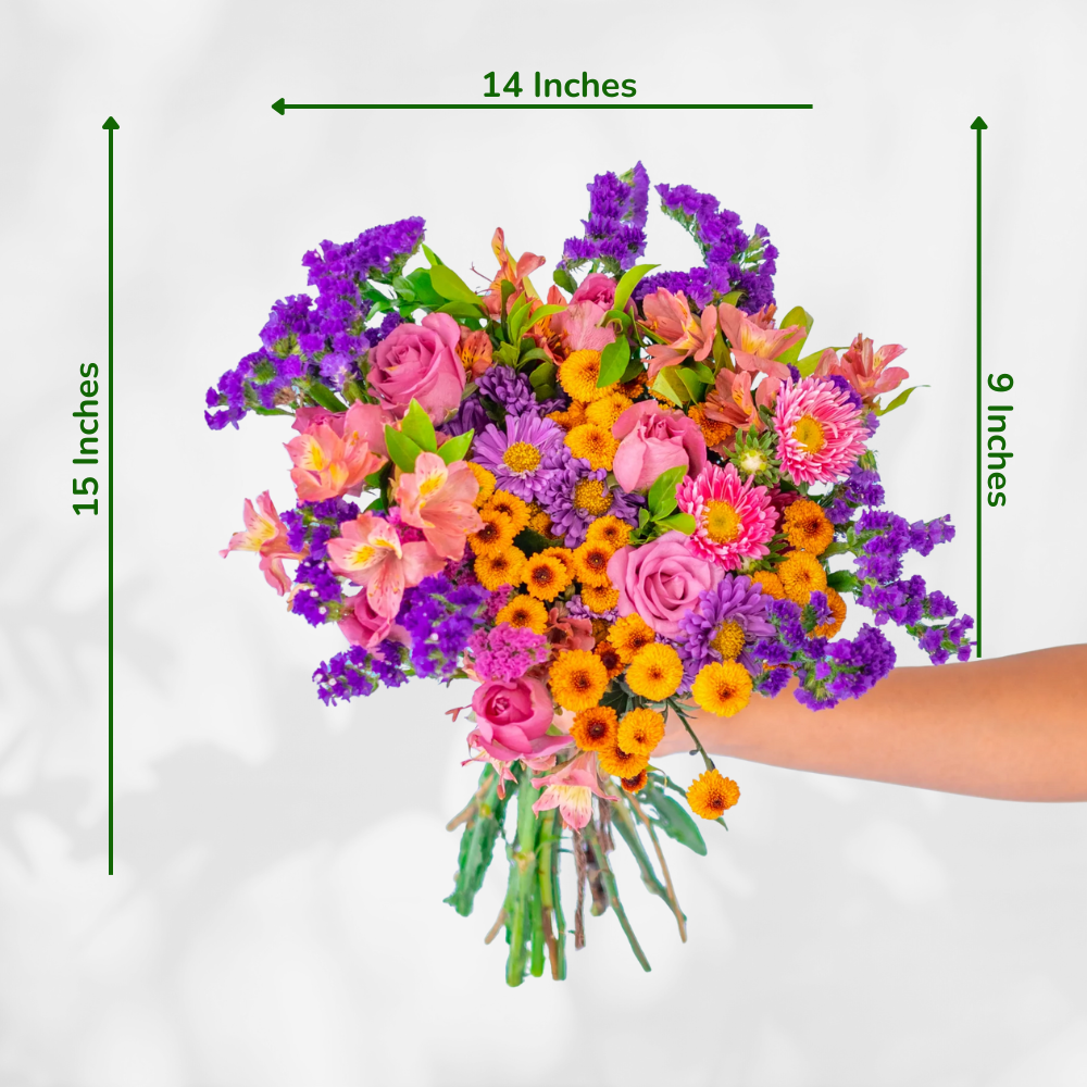 A colorful bouquet featuring shades of purple, pink with orange tones creating a bold and striking contrast. It is a perfect combination of passion and devotion and is a perfect gift for her.