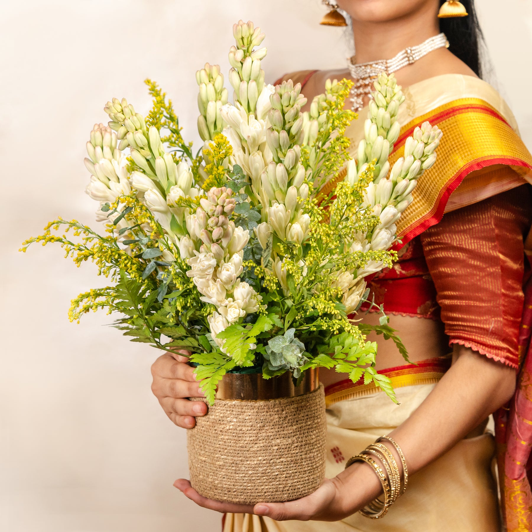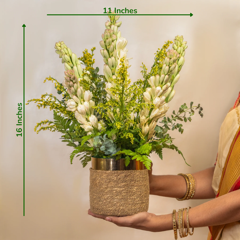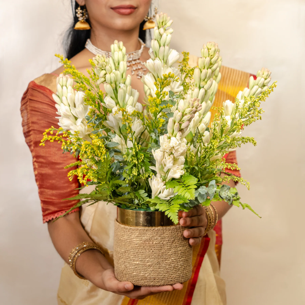 "Immerse yourself in tranquility with our Oasis Bliss Bouquet. Featuring fragrant Tuberose, vibrant Golden blooms, and charming Baby Doll flowers, this arrangement is beautifully accented by stylish Leather details.