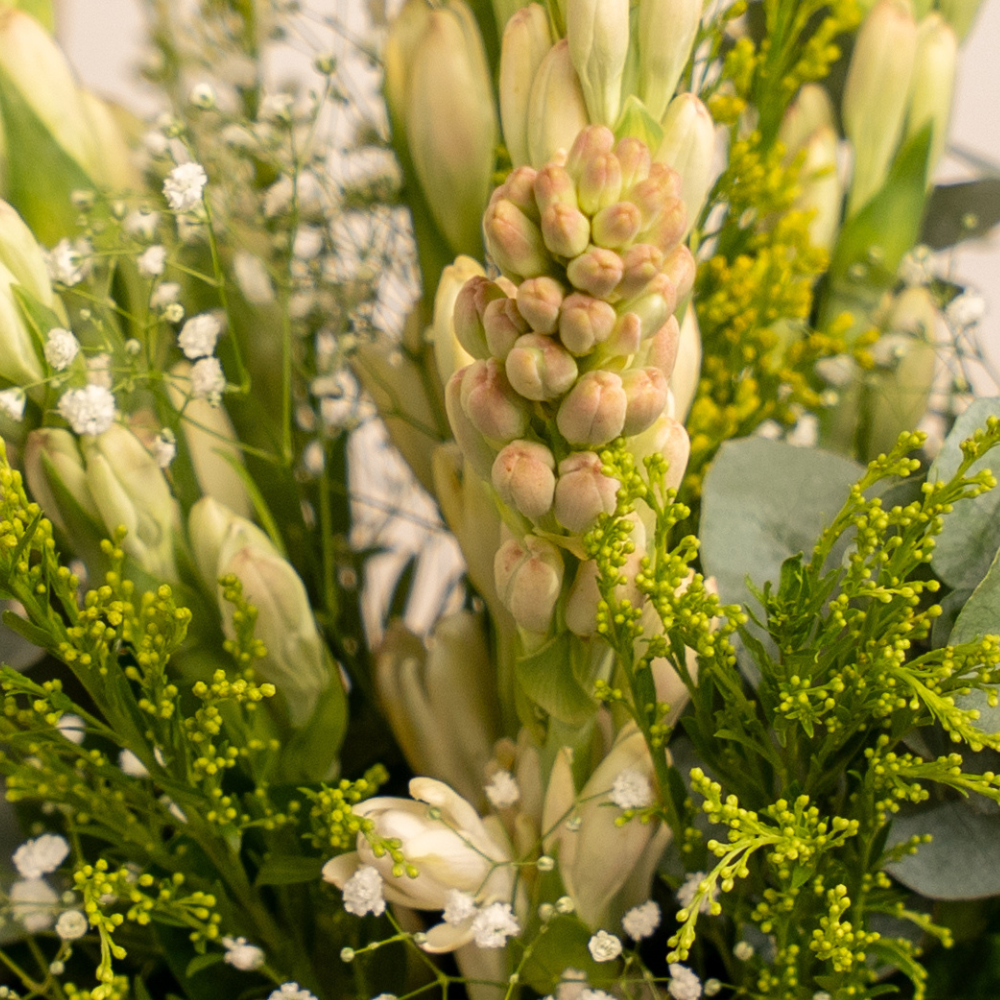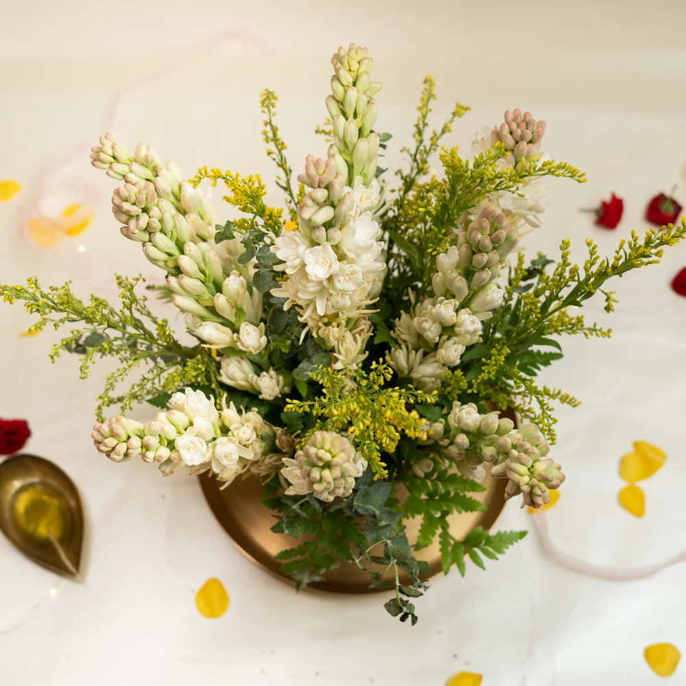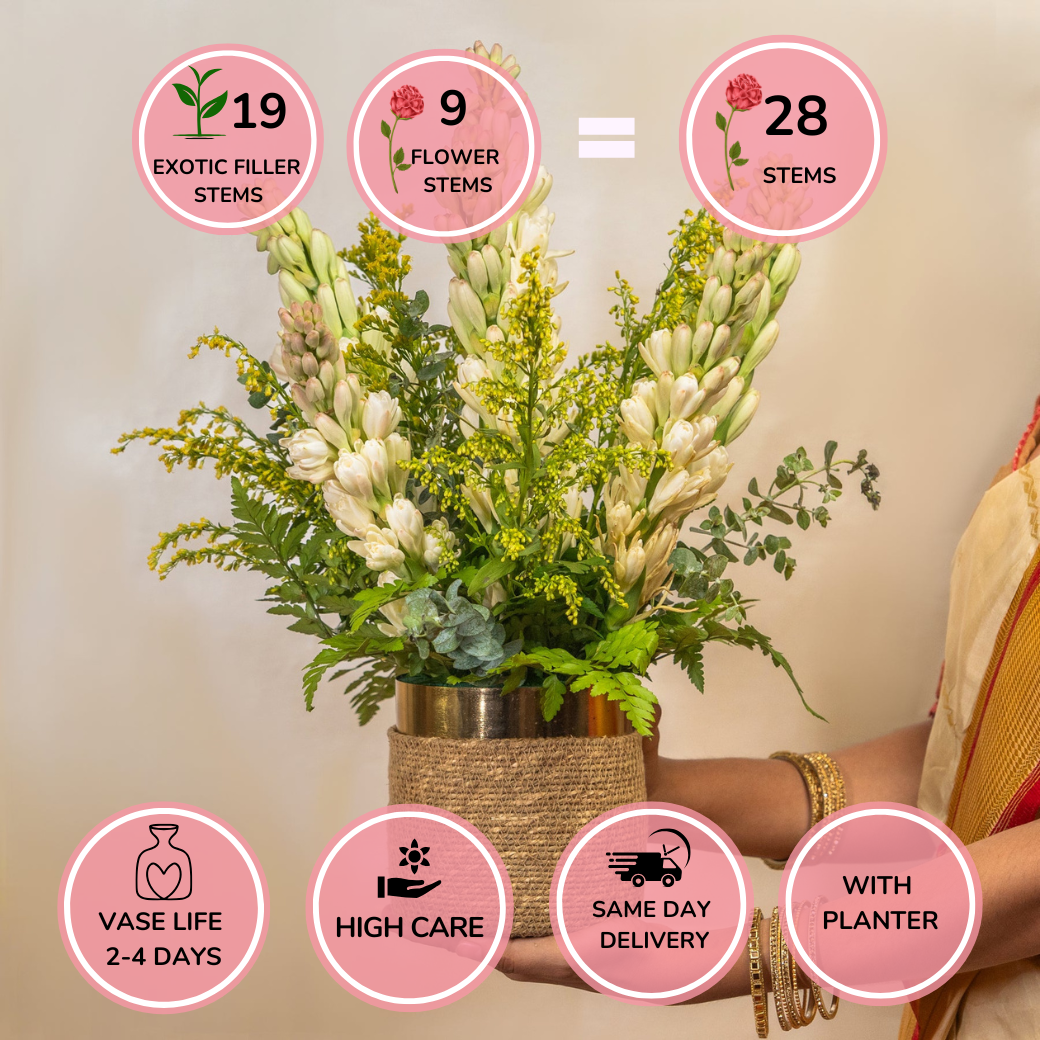 "Immerse yourself in tranquility with our Oasis Bliss Bouquet. Featuring fragrant Tuberose, vibrant Golden blooms, and charming Baby Doll flowers, this arrangement is beautifully accented by stylish Leather details.