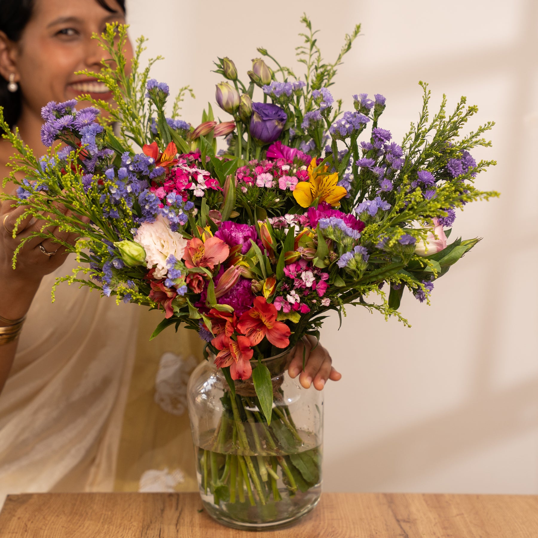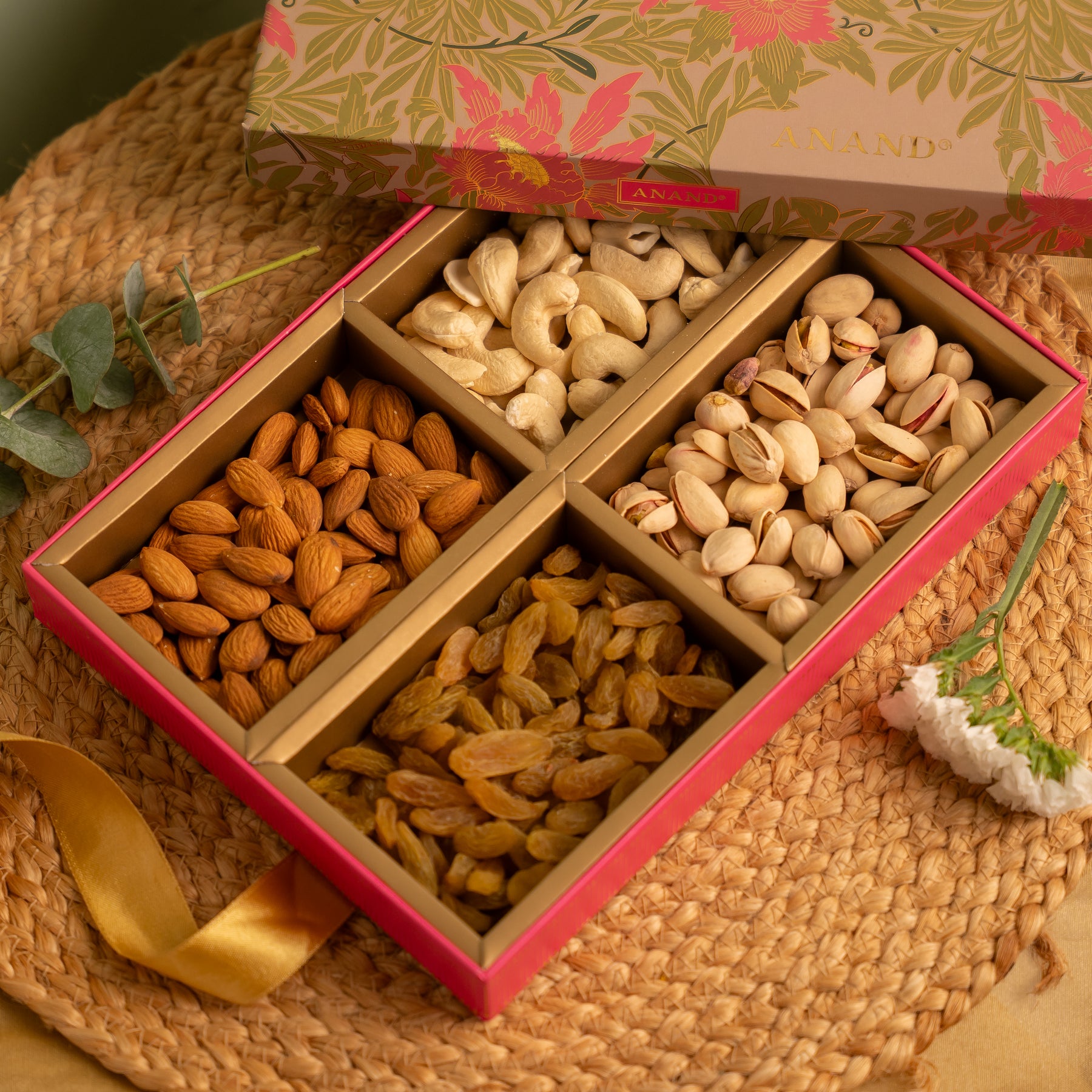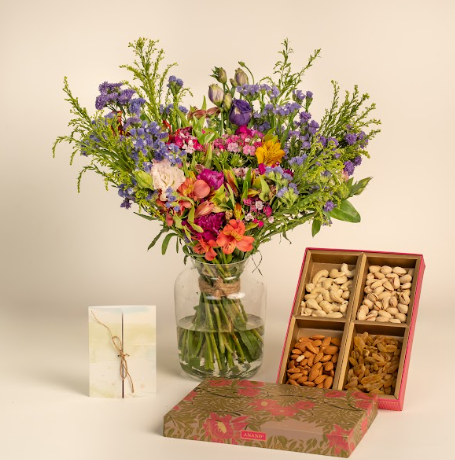 Includes: Fresh bouquet, Dry nuts & Greetings