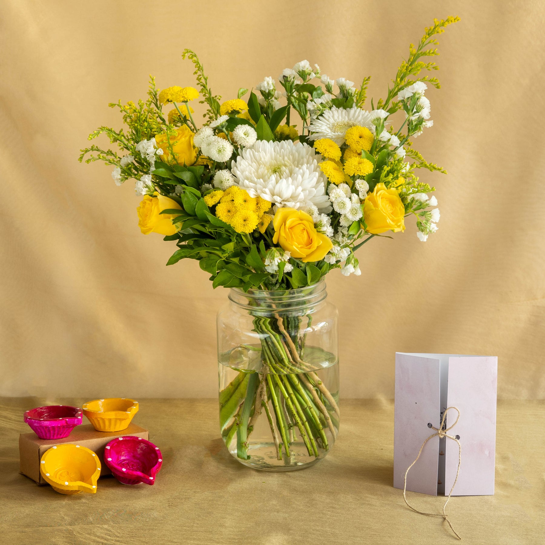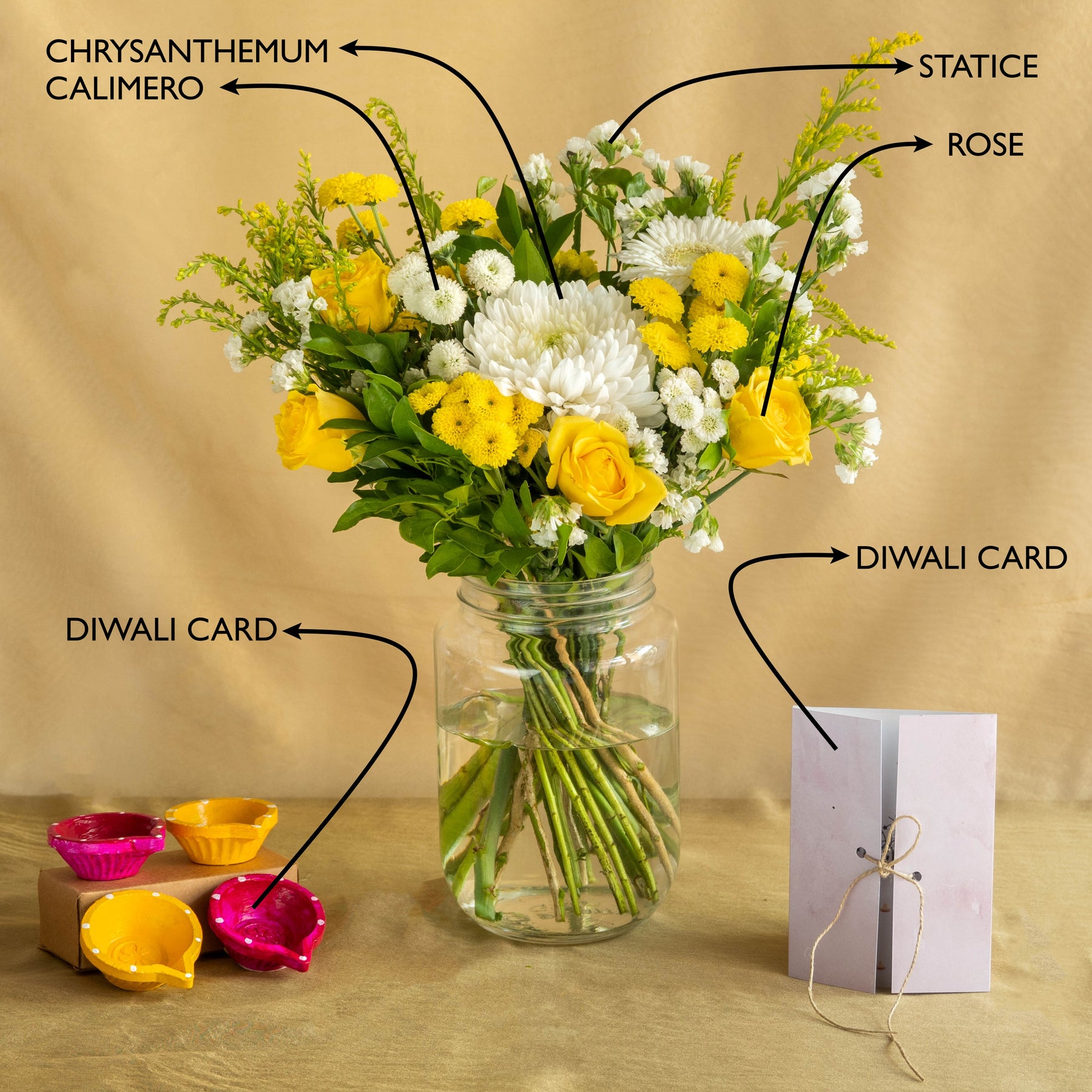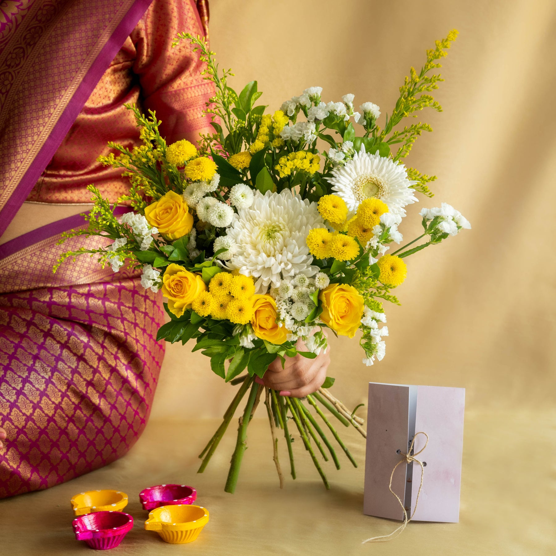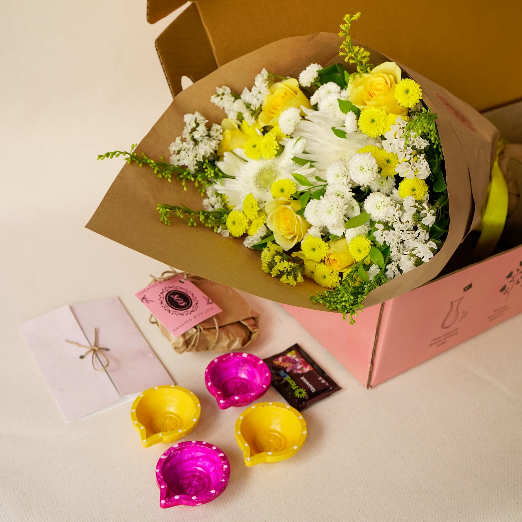 1 Fresh Flower Bouquet with Mums, Roses and Wild Greens, 4 Hand-painted traditional Diyas by Local Artisans, 1 Happy Diwali Greeting Card & 100% eco-friendly packaging