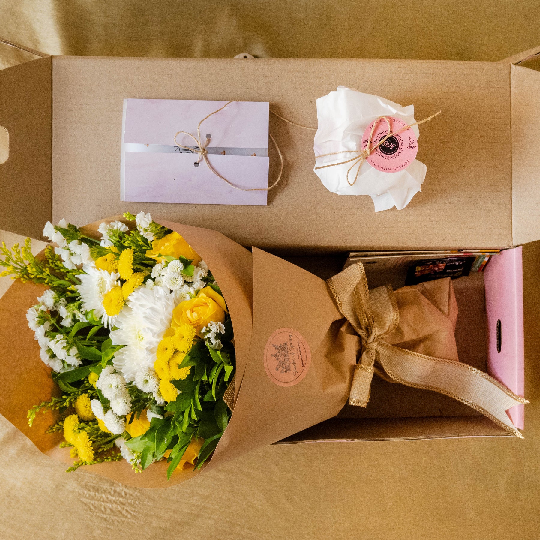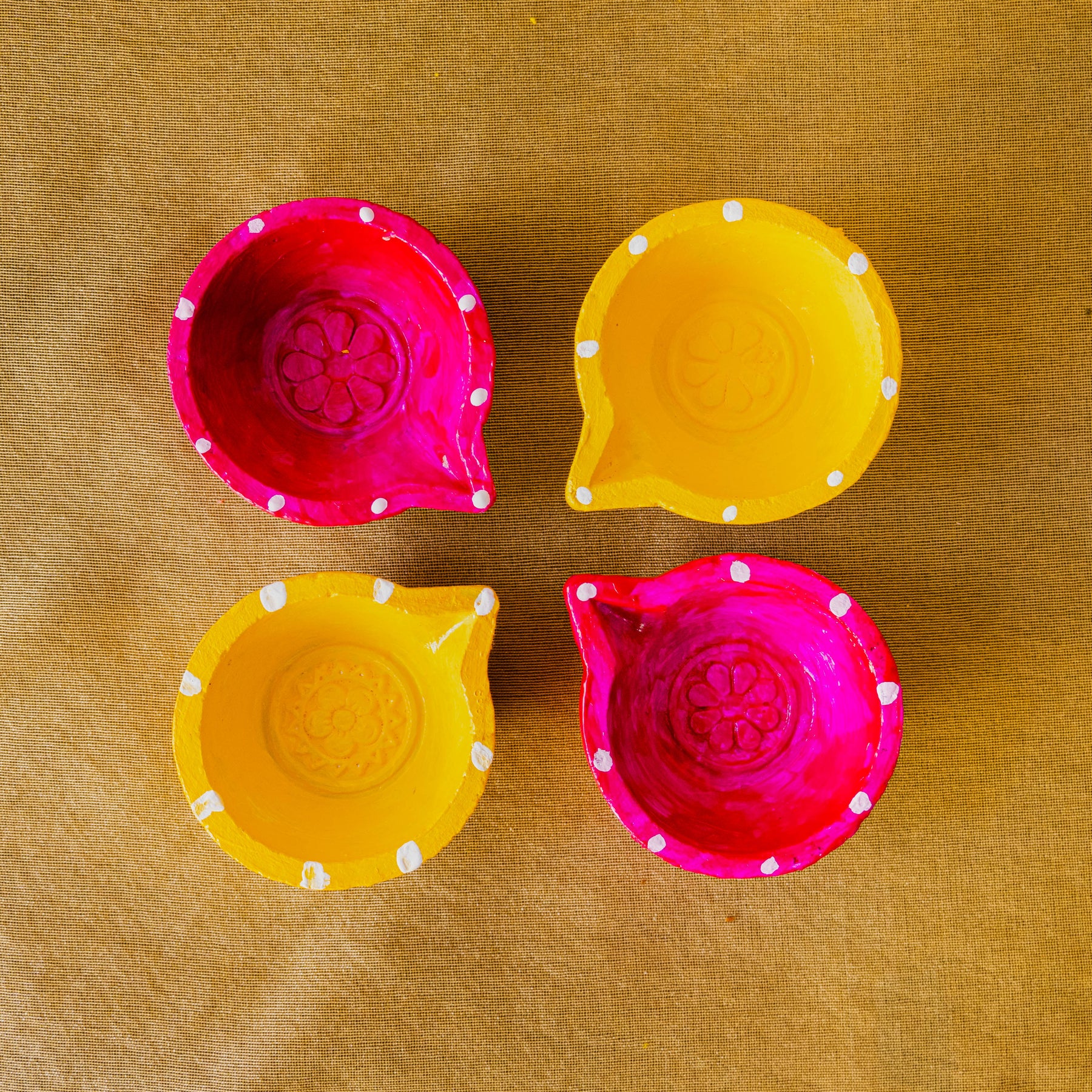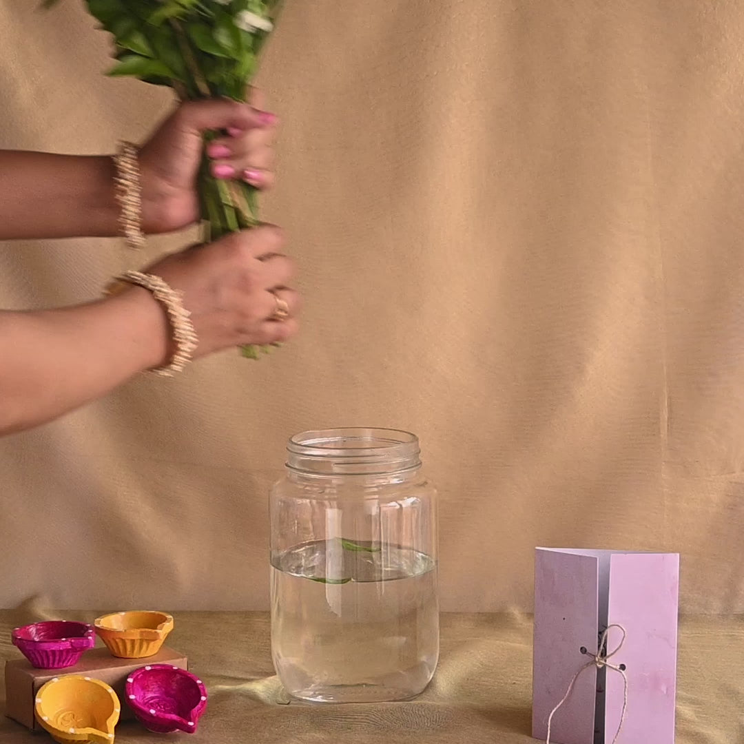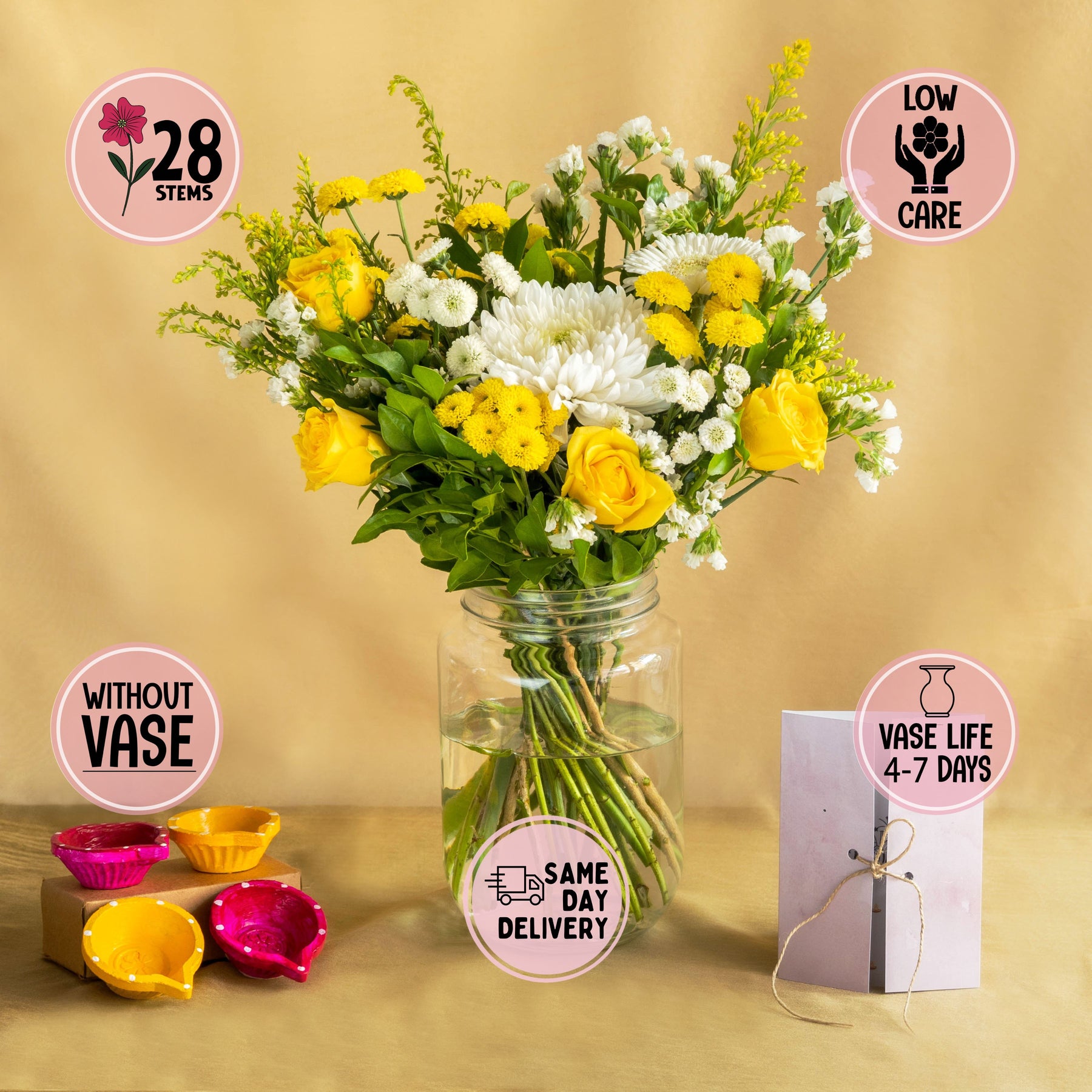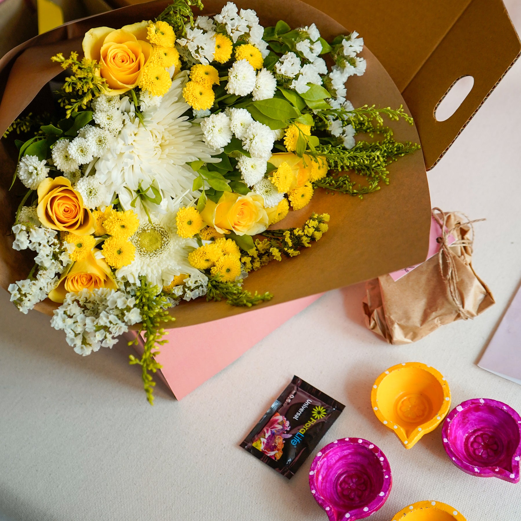 1 Fresh Flower Bouquet with Mums, Roses and Wild Greens, 4 Hand-painted traditional Diyas by Local Artisans, 1 Happy Diwali Greeting Card & 100% eco-friendly packaging