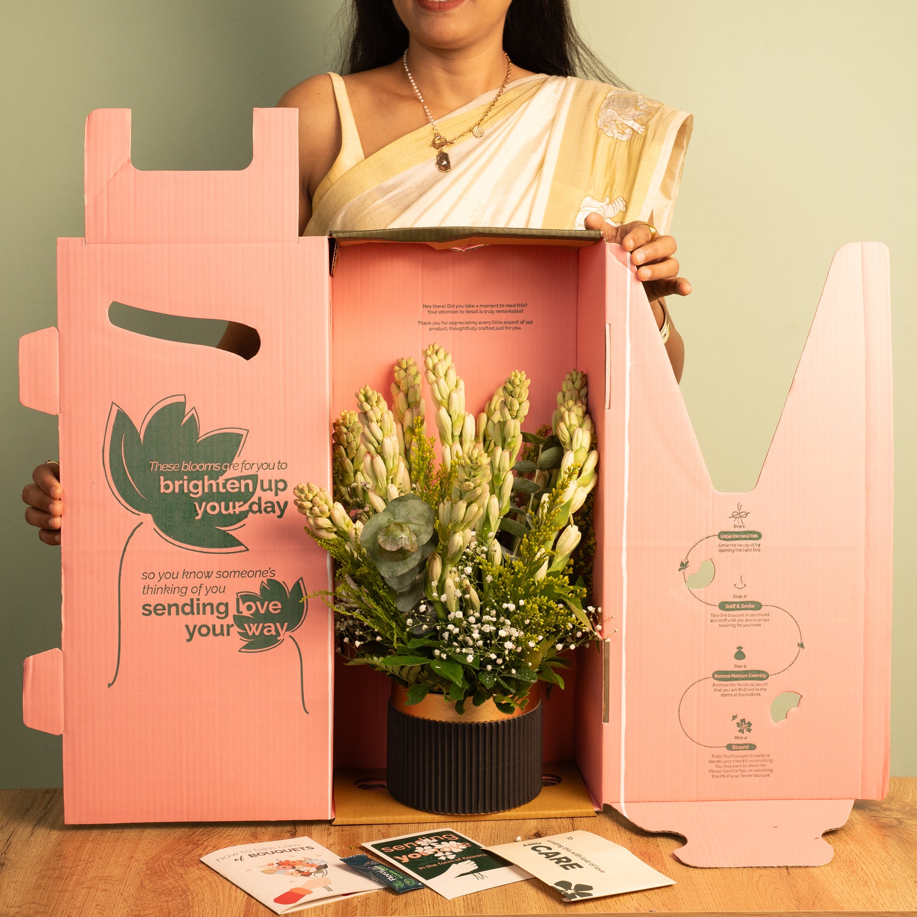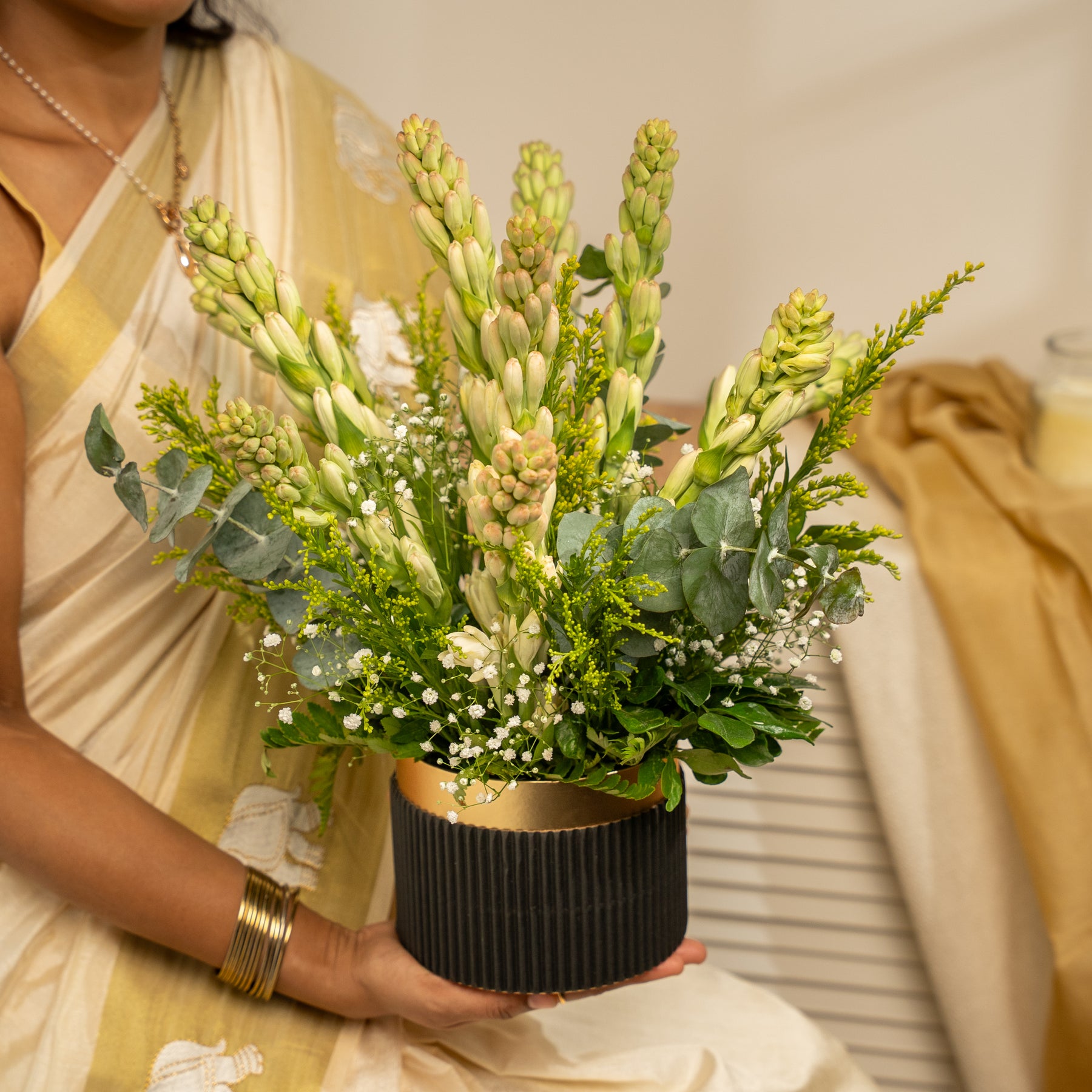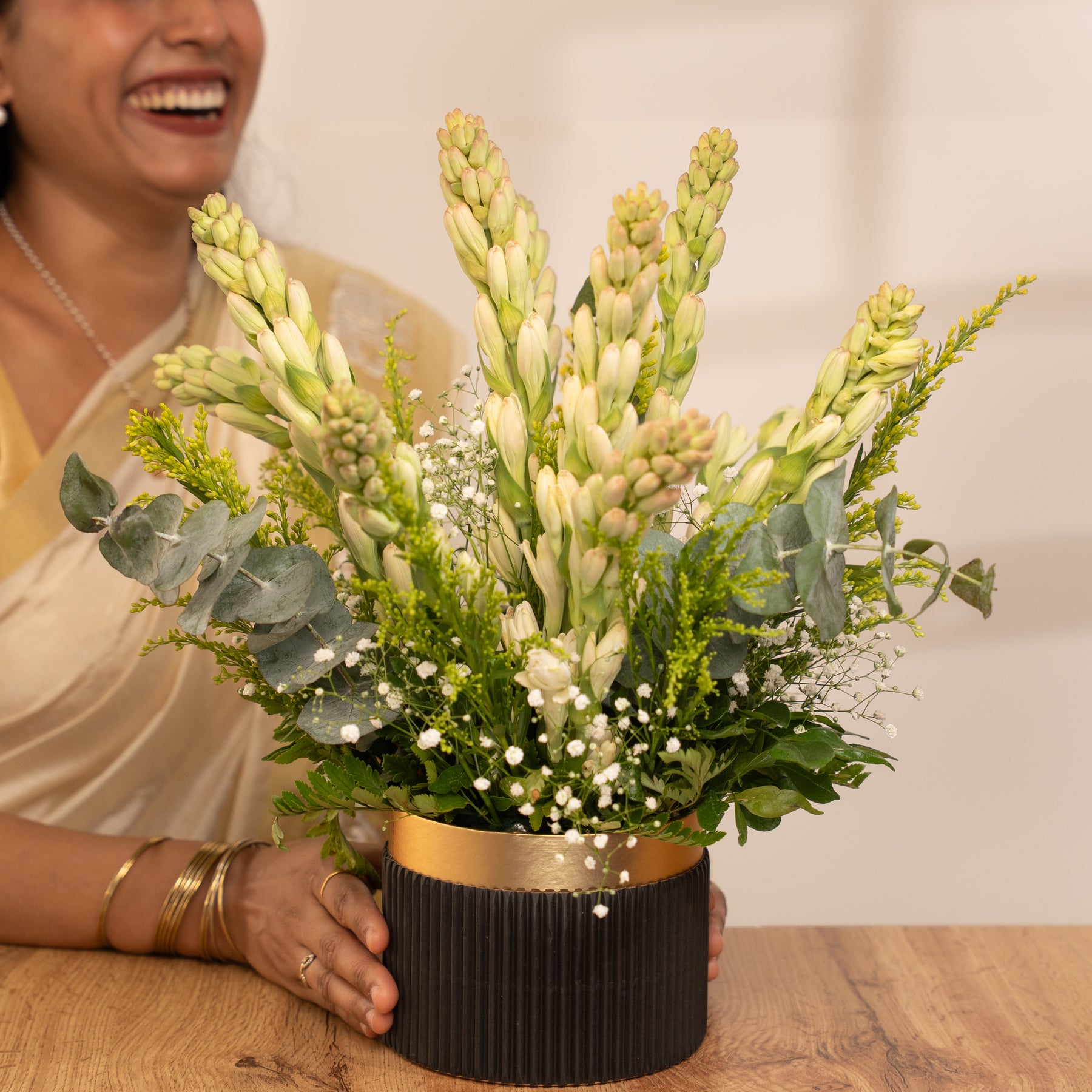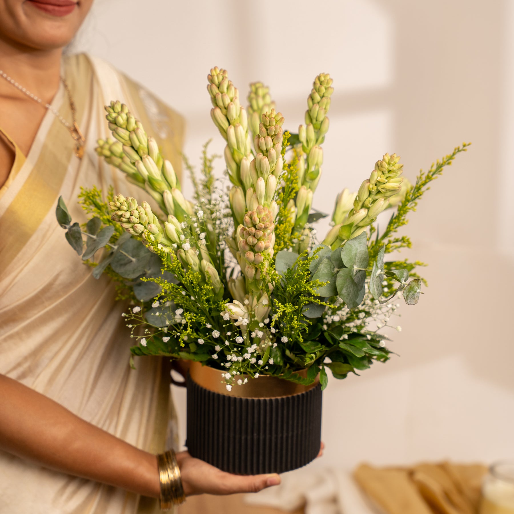 Celebrate purity and elegance with Rajnigandha Shubhra — a bouquet that captures the timeless charm of the night-blooming jasmine. Adorned with fragrant white Rajnigandha blooms, this arrangement exudes serenity and grace, making it perfect for gifting or elevating your special moments. Its delicate scent and pristine beauty bring a sense of peace and celebration to every space.