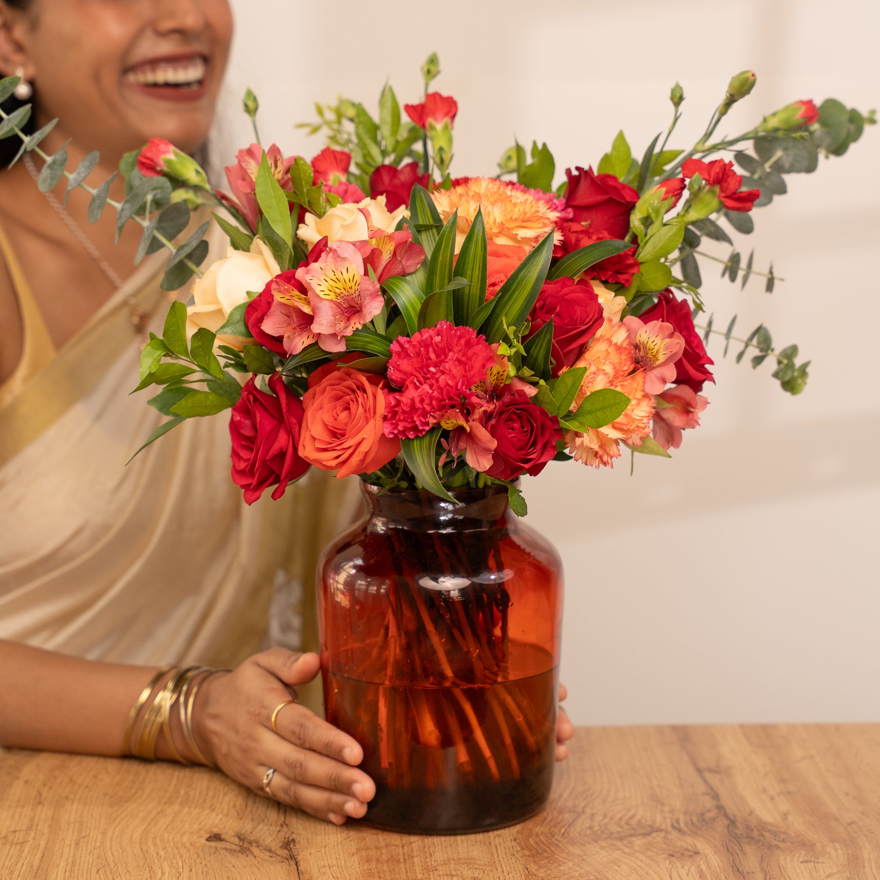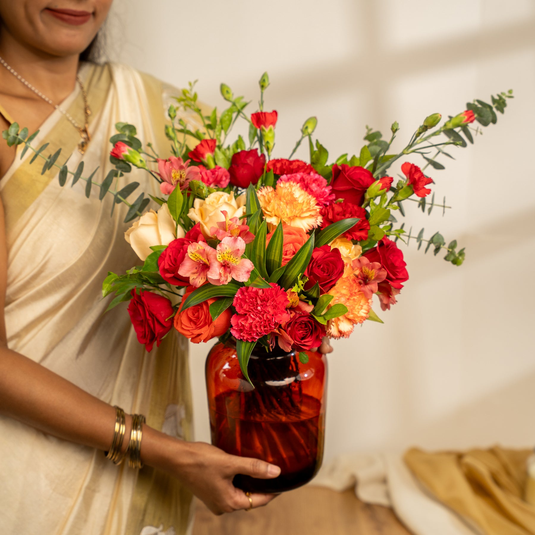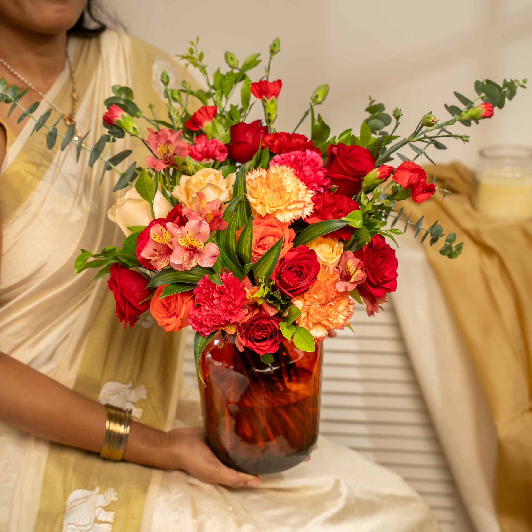 This bouquet radiates festive elegance and is perfect for adorning your puja space, dining table, or gifting to loved ones. The vibrant hues symbolize love, prosperity, and new beginnings, making it a radiant centerpiece for the Festival of Lights.
