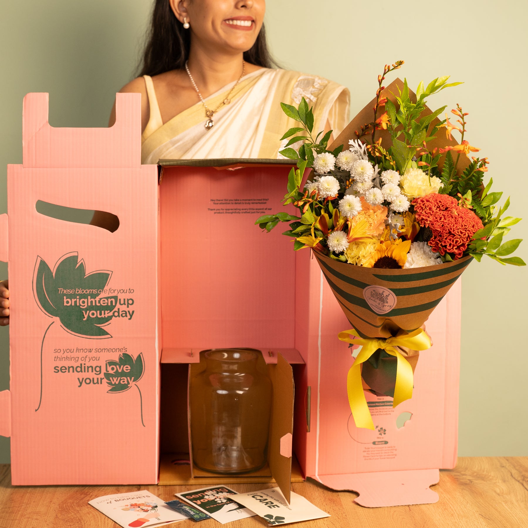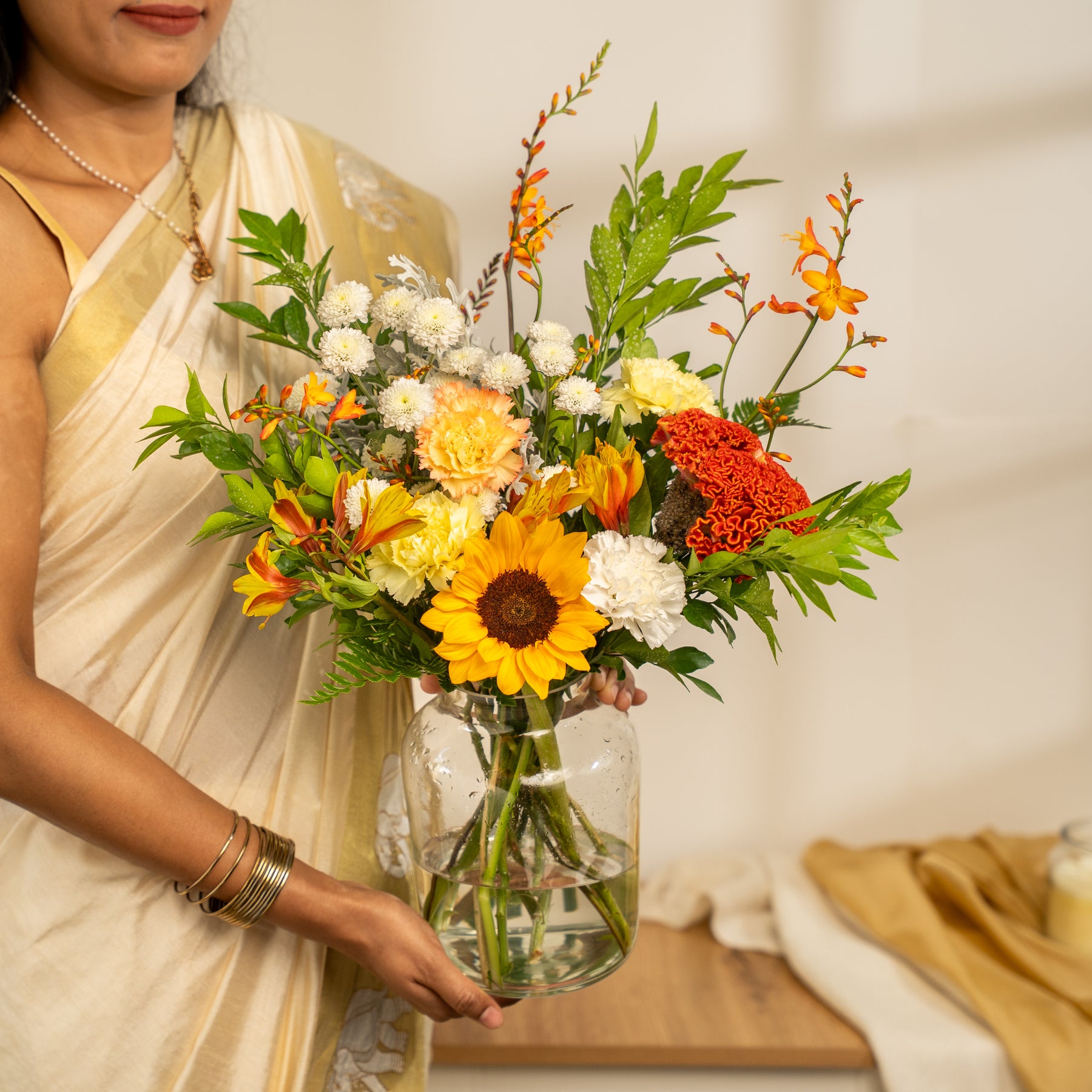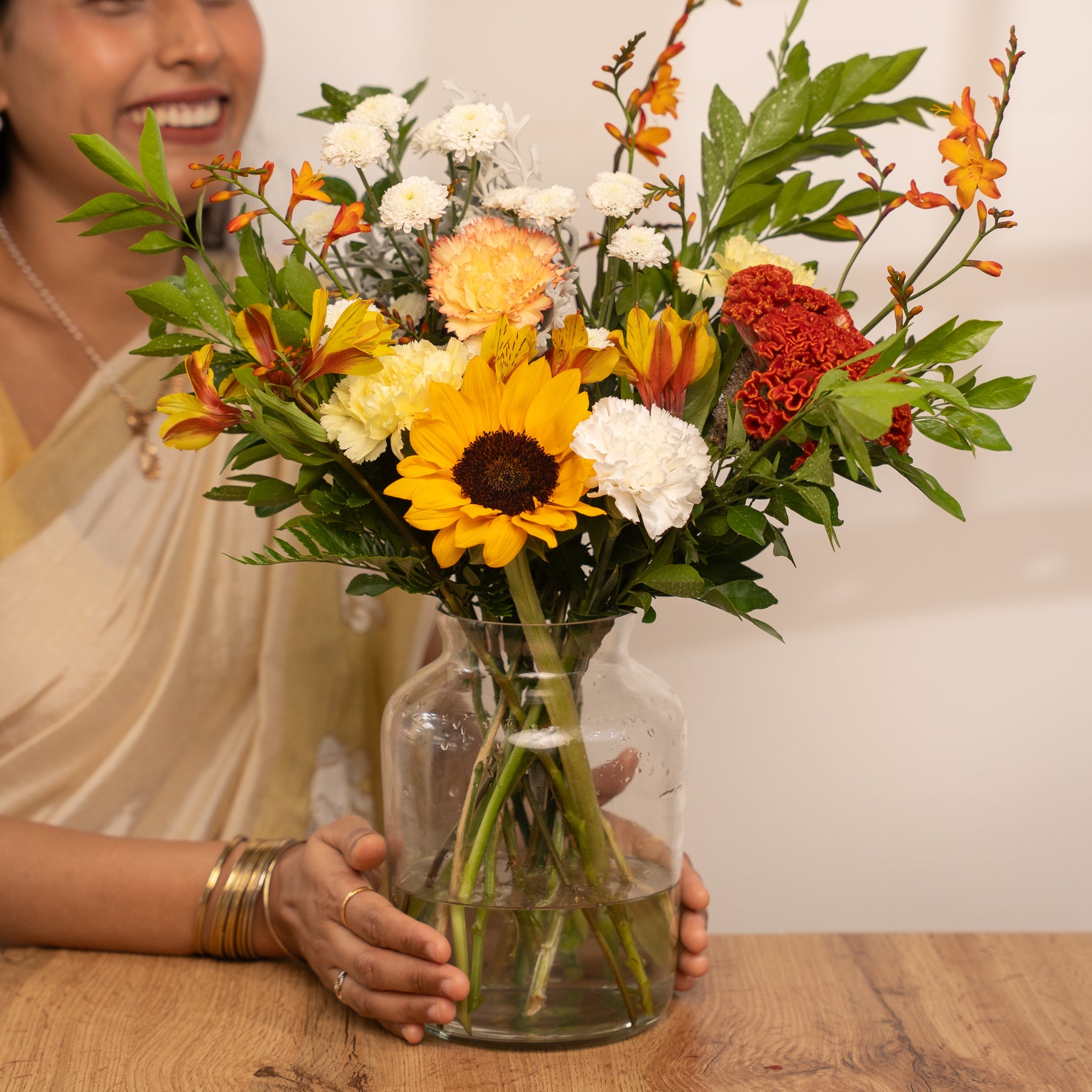 Types of flowers: Sunflower, White Calimero, White Carnation, Yellow Carnation, Orange Carnation, Yellow Alstroemeria, Crocosmia, Orange Celosia, Dusty Miller, Leather Fern, and Kamini.