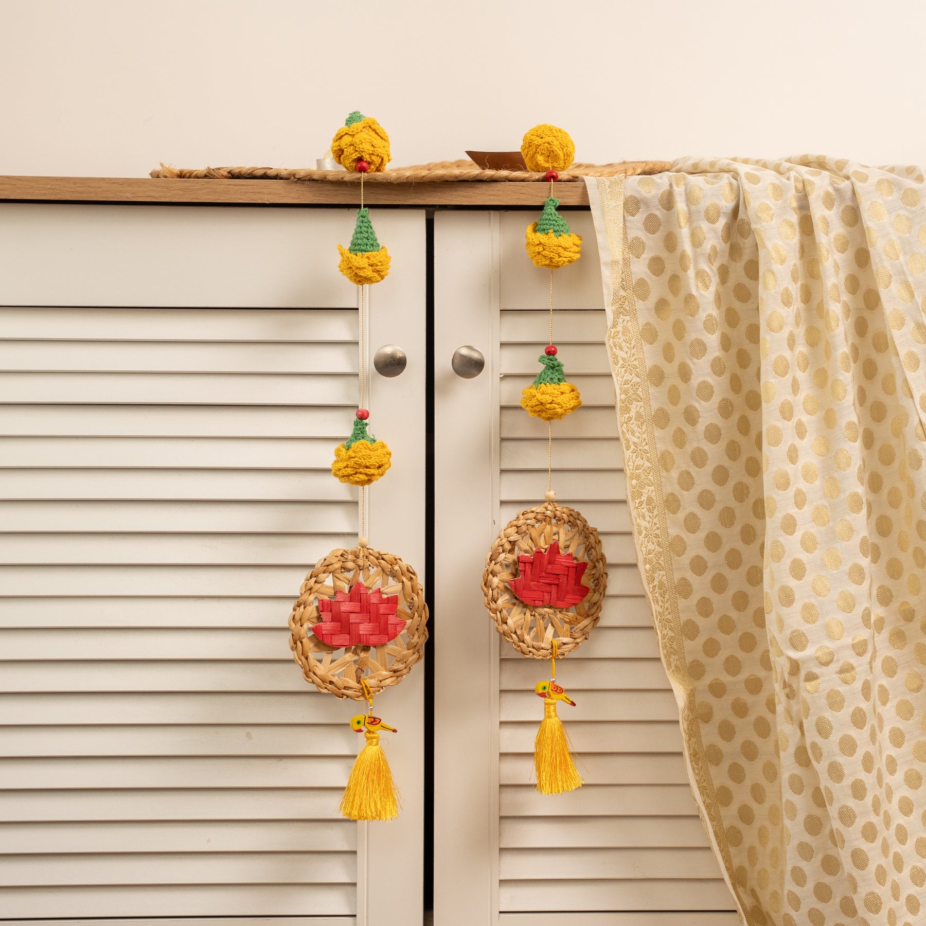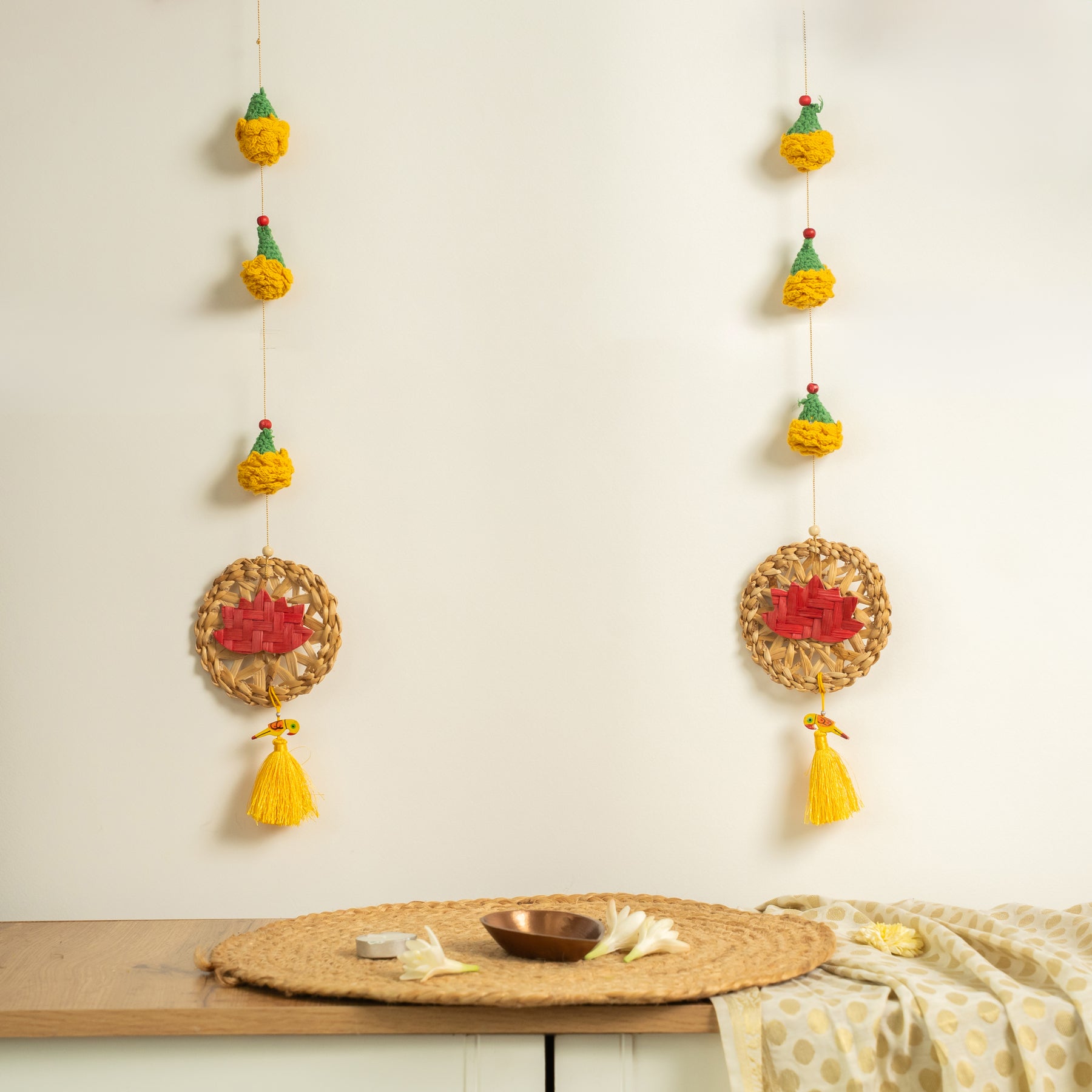 The strings predominantly feature the vibrant colors of marigold flowers, which symbolize auspiciousness, happiness, and vitality in Indian culture. The lotus symbolizes purity, divine grace, and spiritual awakening, adding a sacred and elegant touch to the decoration.