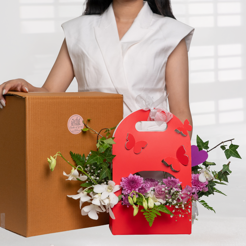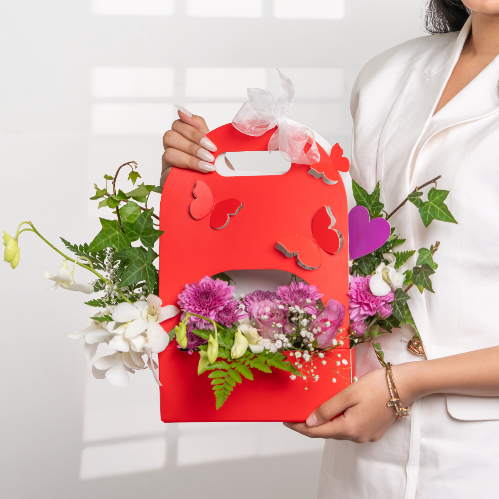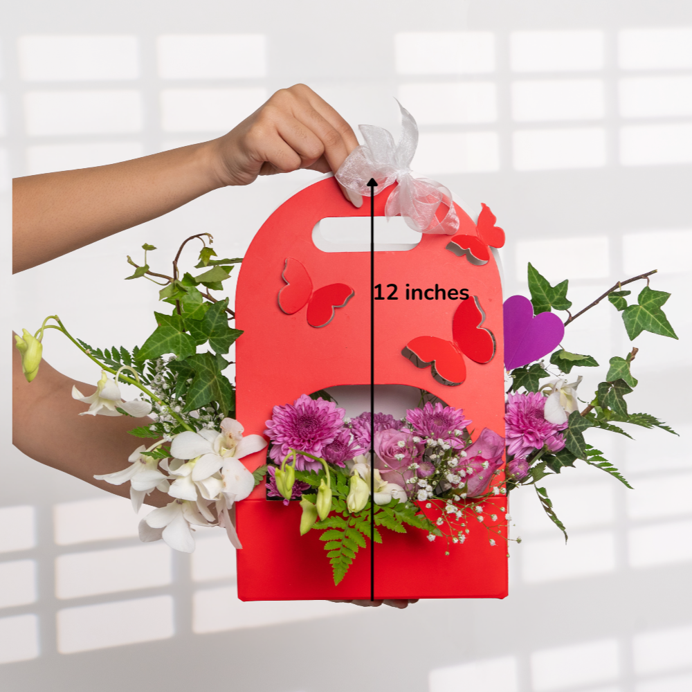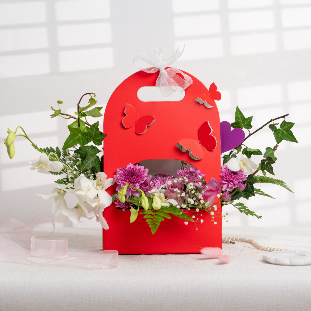 A celebration of elegance and creativity, the Butterfly Bloom Bag transforms a vibrant red gift bag into a blooming masterpiece. Adorned with butterfly cutouts and a delicate white ribbon, it holds a lush arrangement of fresh orchids, chrysanthemums, baby’s breath, and playful heart accents. Perfect for Valentine’s Day, birthdays, or heartfelt surprises, this floral gift merges charm with craftsmanship — a beautiful way to say “you’re special.”