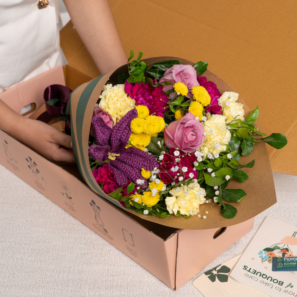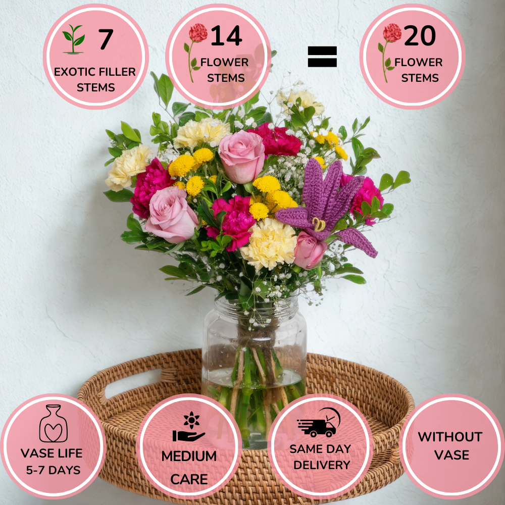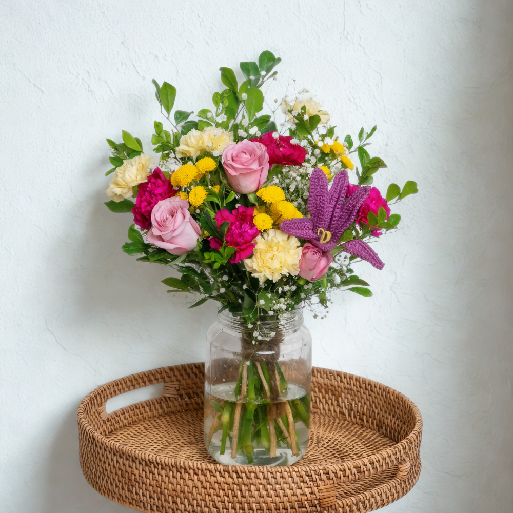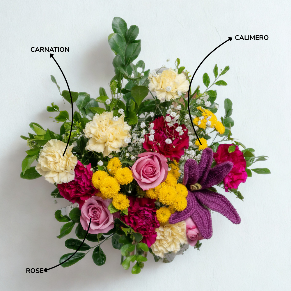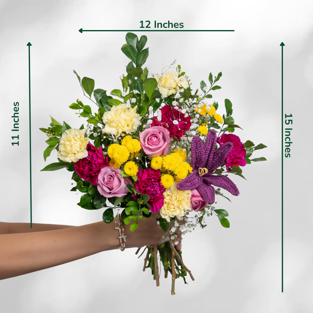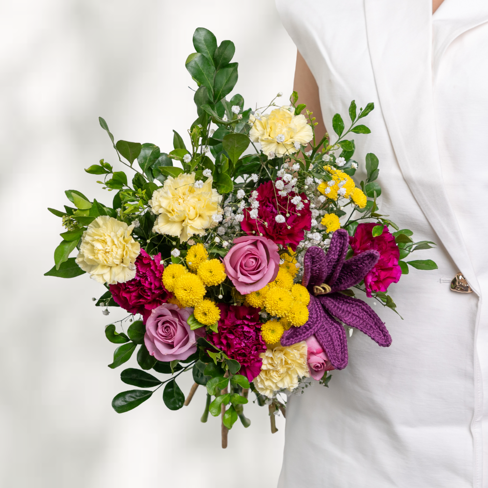 This is a bouquet that celebrates love in vibrant hues. With deep magenta, pink roses, chrysanthemums, and a striking purple lily, this arrangement is a symphony of color and emotion. Accented with lush greens and delicate fillers, it evokes passion, creativity, and heartfelt affection , a perfect gift for Valentine’s Day or any moment that deserves a muse.