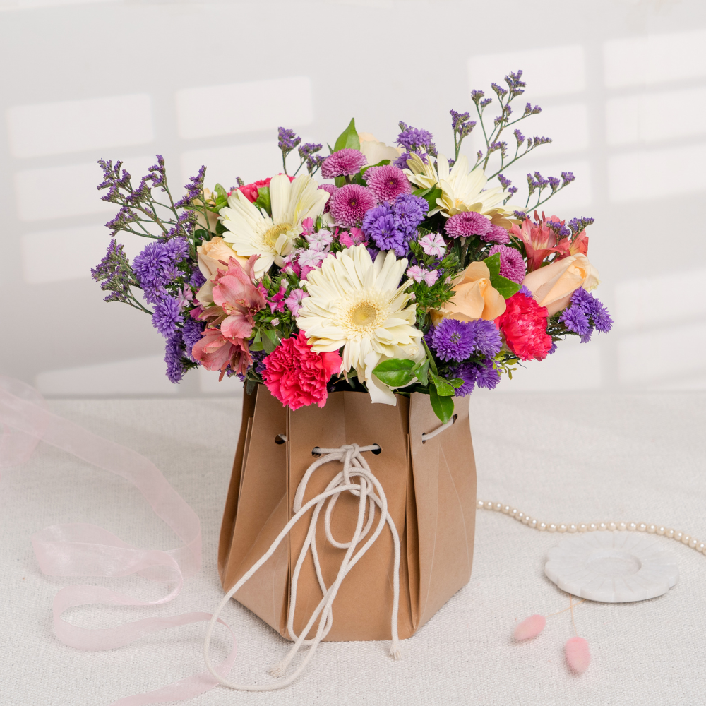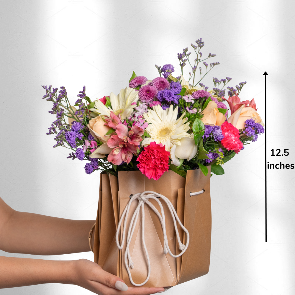 A charming bundle of affection, Bag of LOVE is a rustic sack overflowing with joyful blooms and heartfelt color. Tied with a simple drawstring and wrapped in cozy charm, it’s perfect for Valentine’s Day, spontaneous surprises, or sending a smile to someone special.