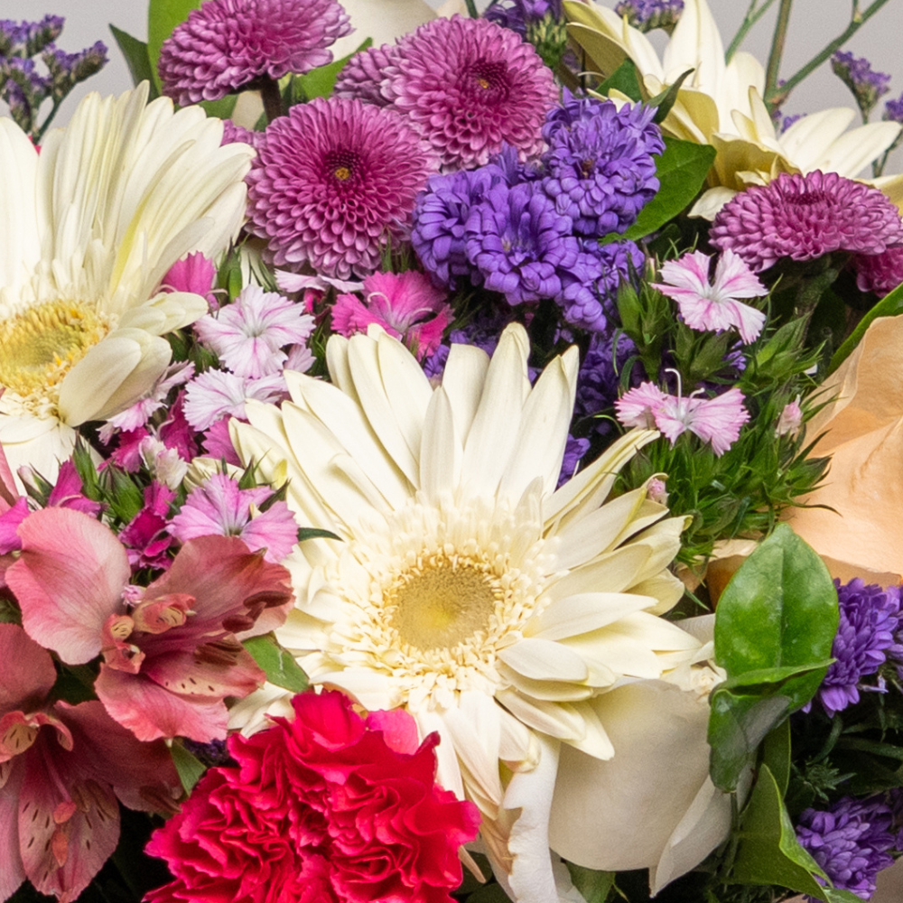 Calimero, White Gerberas, Peach Roses, Dark Pink Carnations, Pink Alstroemeria, Sweet William Roses, Blue Daisies, Limonium, and Kamini