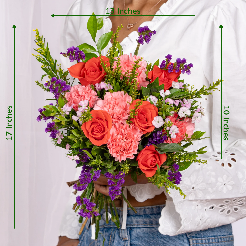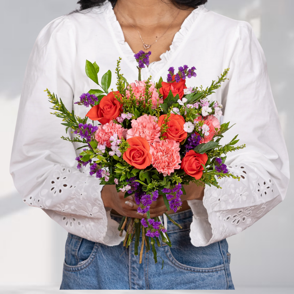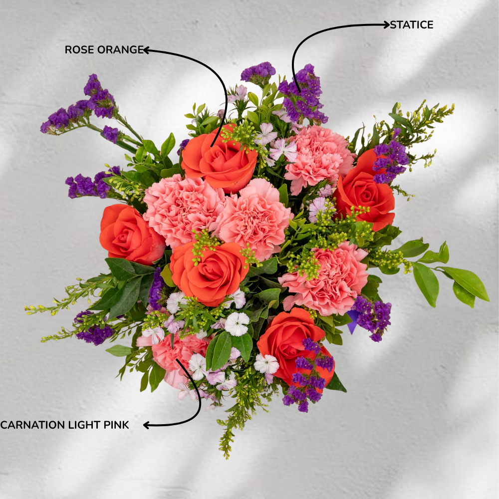 A vibrant blend of orange roses, light pink carnations, sweet williams, purple statice, golden rod, and kamini. A beautiful bouquet that radiates warmth and affection, perfect for Valentine’s Day.