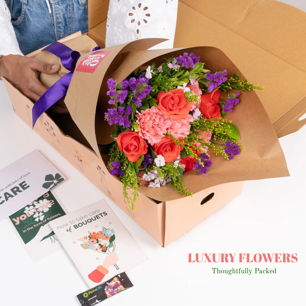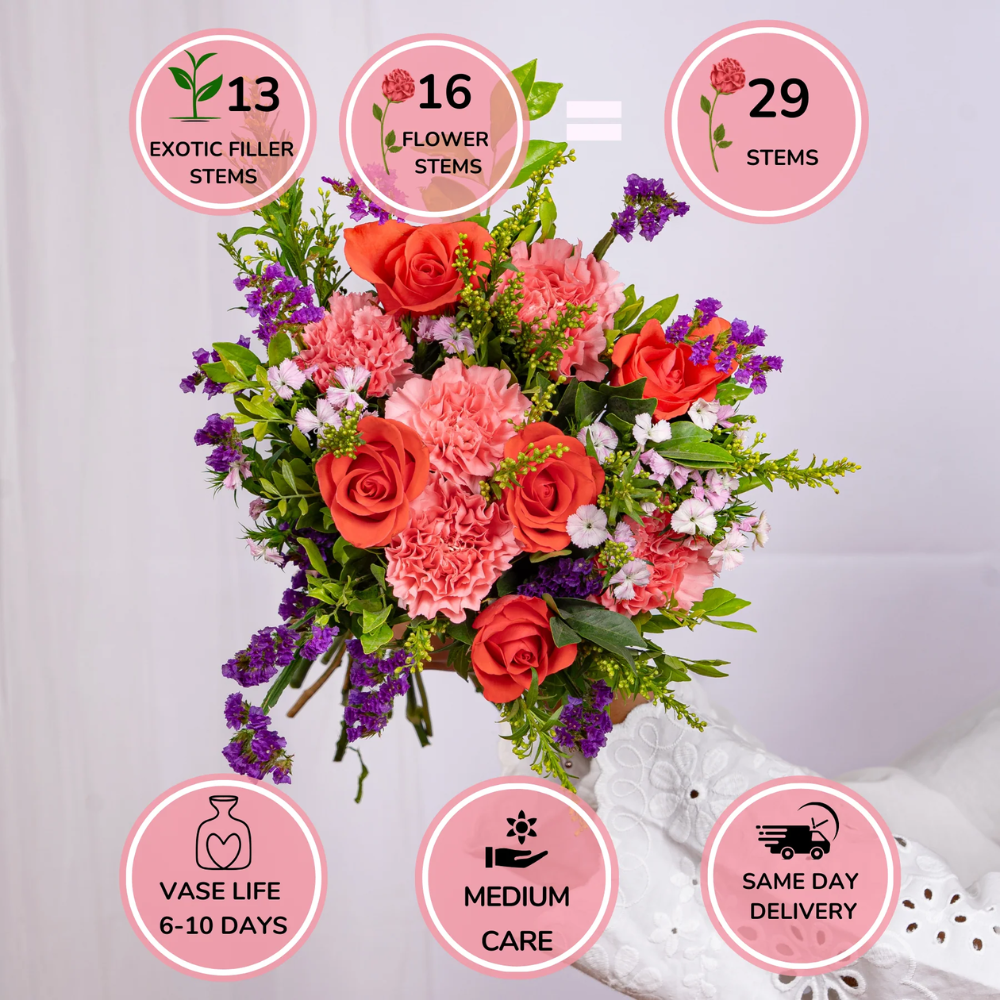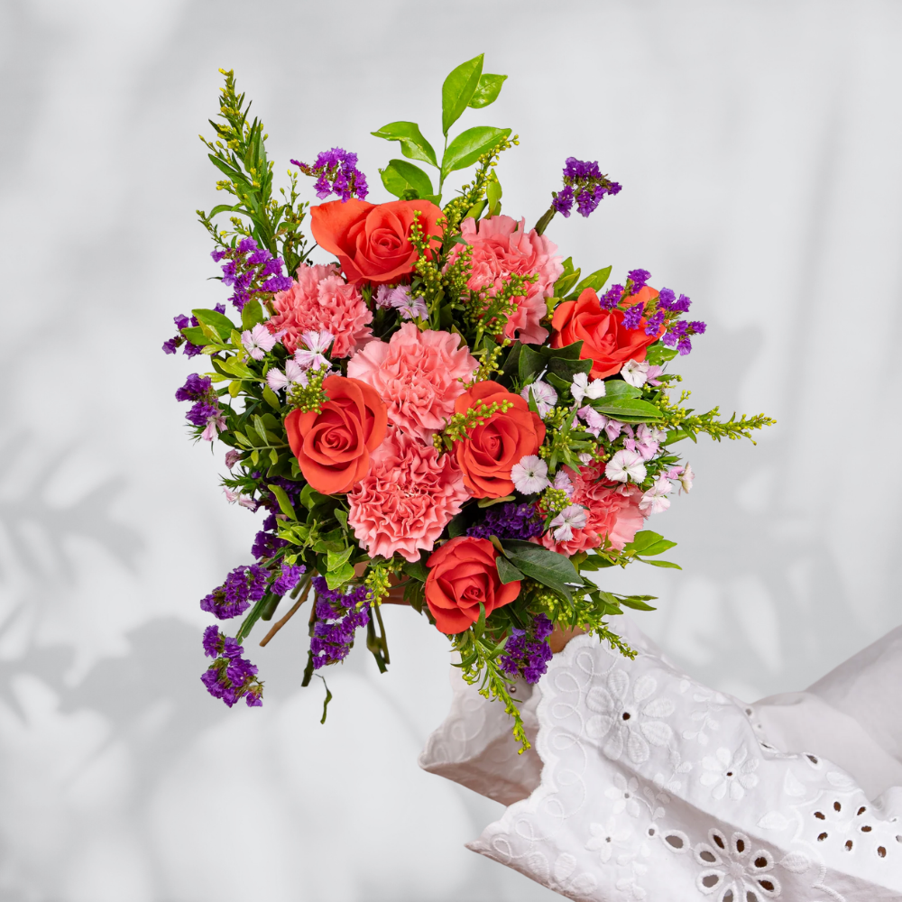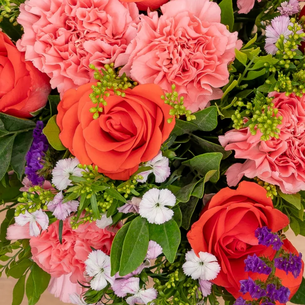 A vibrant blend of orange roses, light pink carnations, sweet williams, purple statice, golden rod, and kamini. A beautiful bouquet that radiates warmth and affection, perfect for Valentine’s Day.