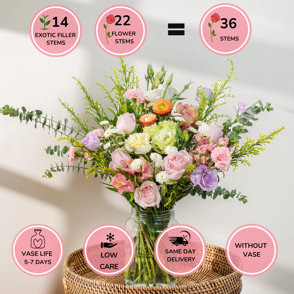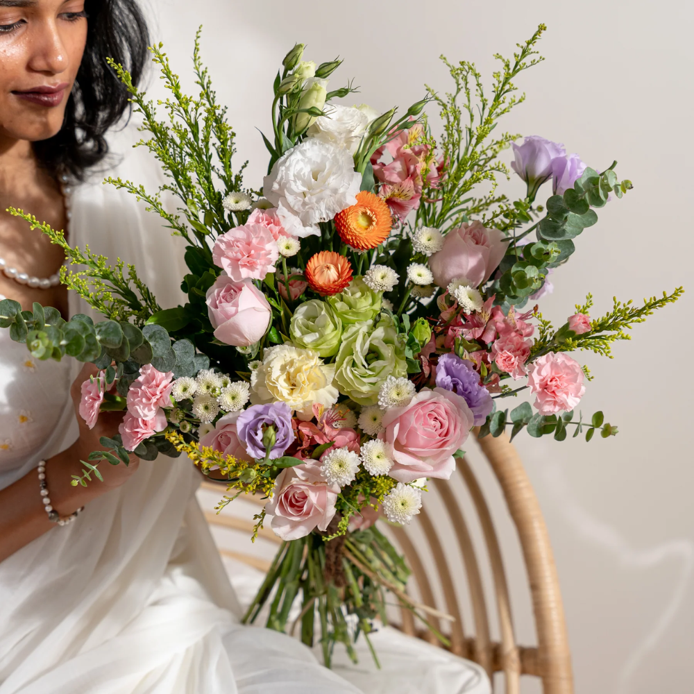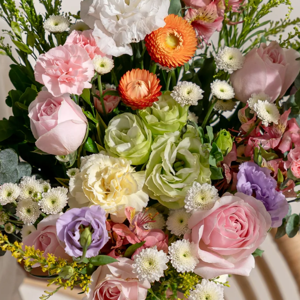 "A joyful burst of summer in every stem — this pastel bouquet blends soft roses, lisianthus, and daisies with sunny pops of color to bring warmth, cheer, and a breath of fresh air to any space." ☀️🌸