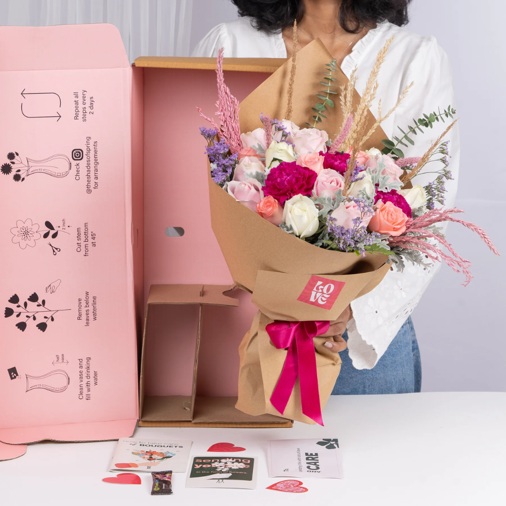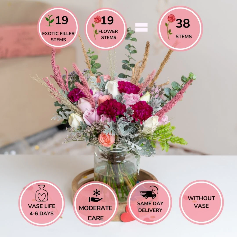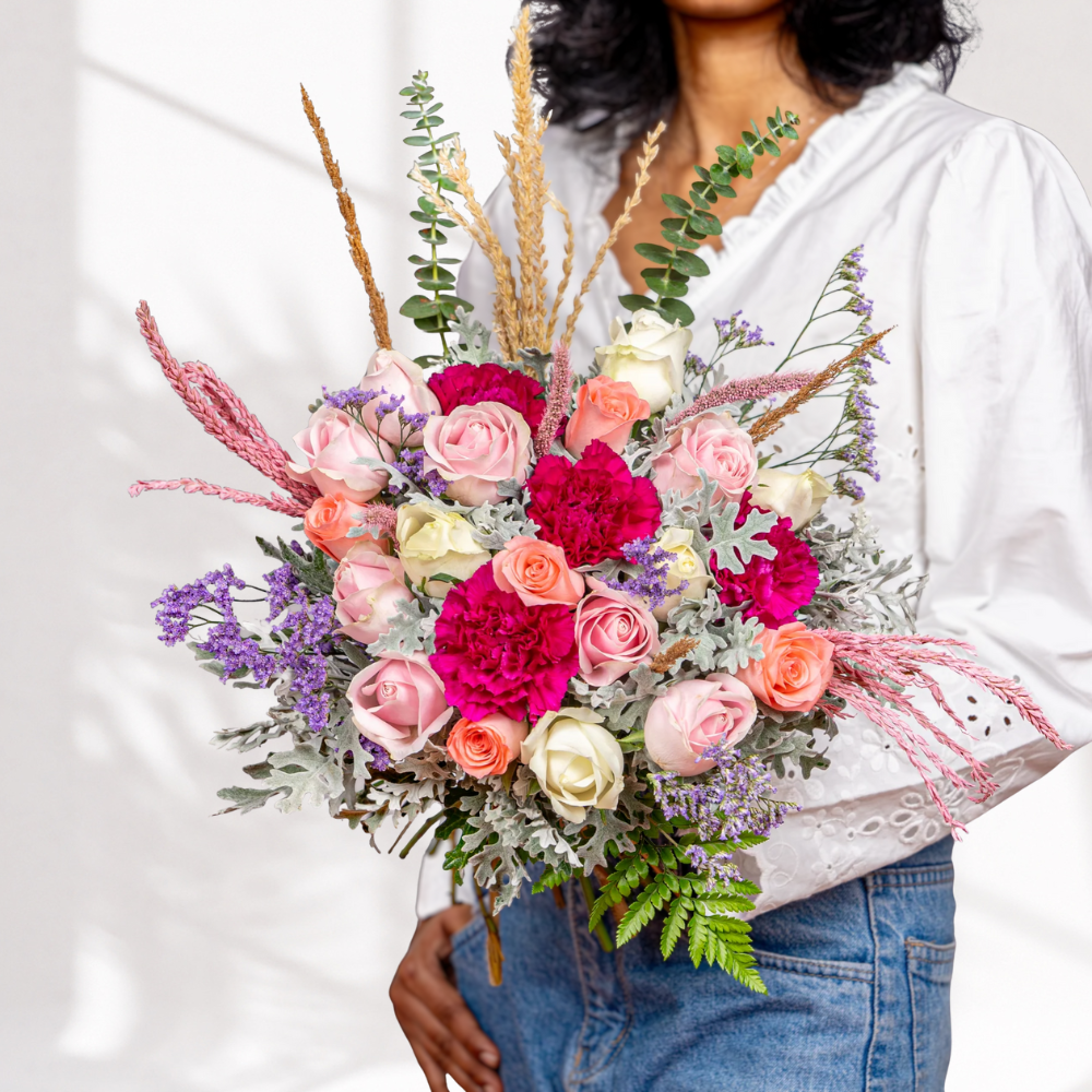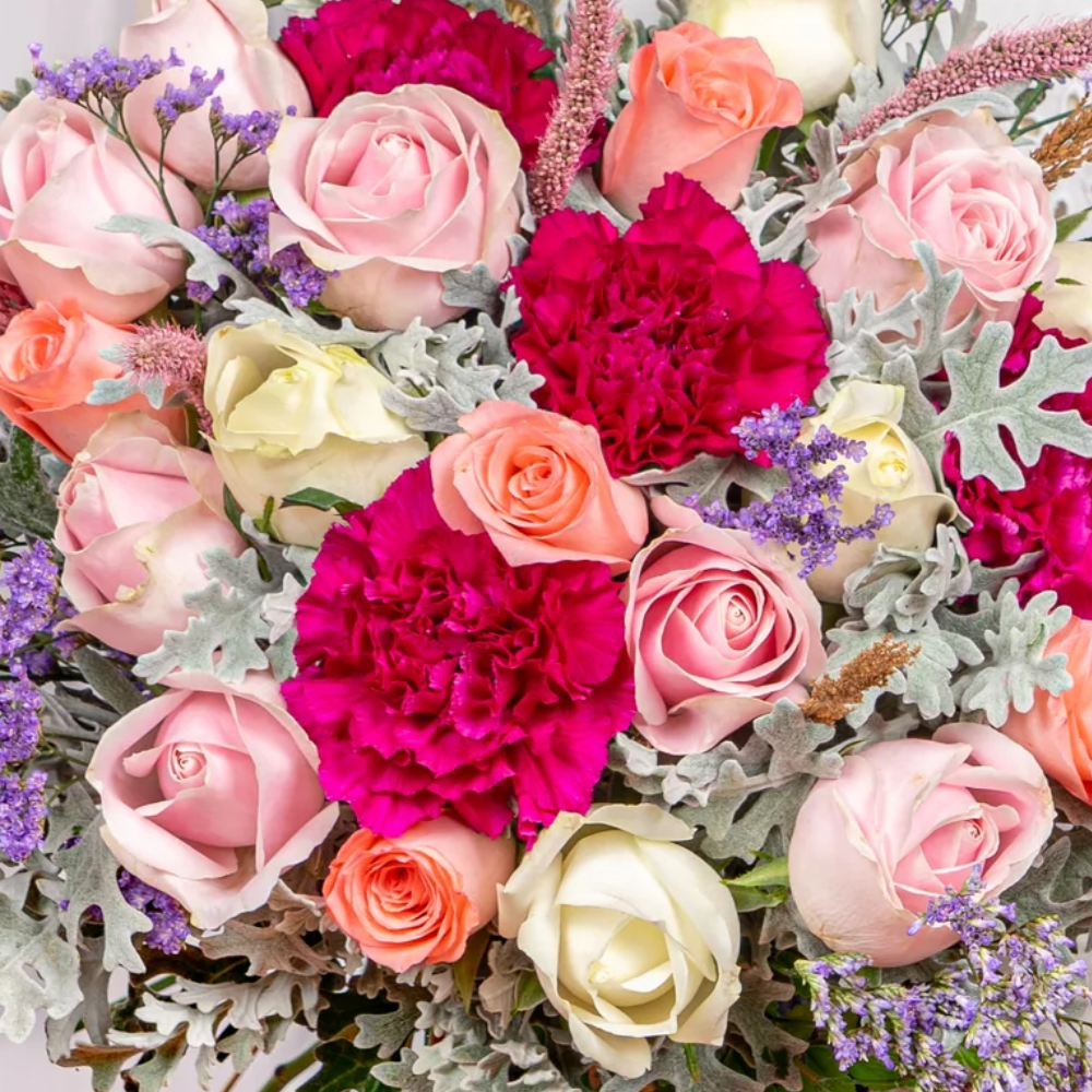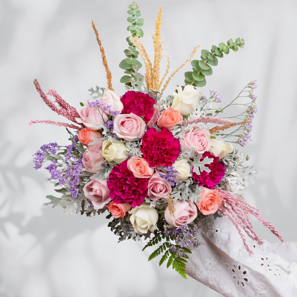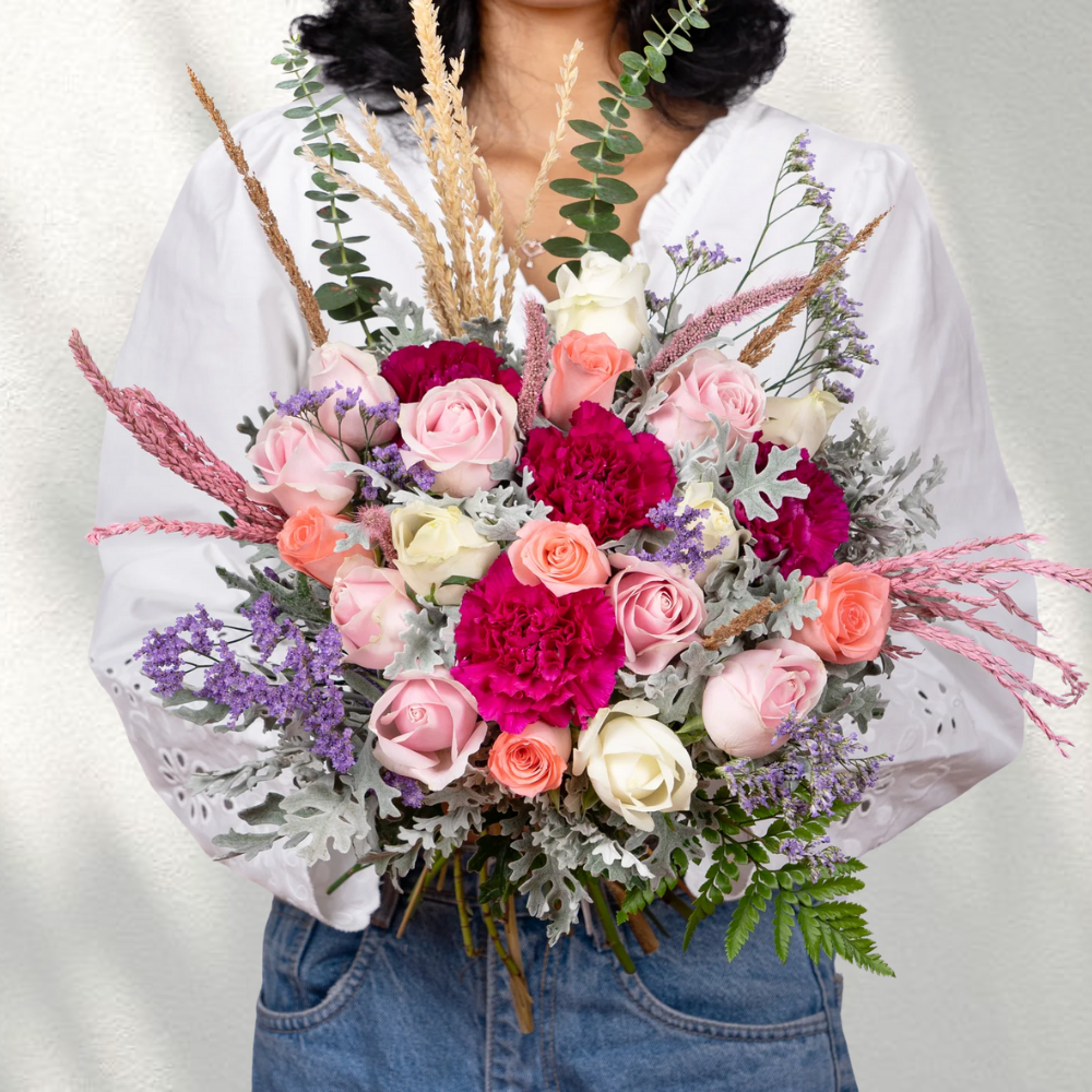 Celebrate this Valentine's season with your loved ones with our luxurious new mixed bouquet featuring Carnation purple with Rose Sweet Avalanch. So make sure to surprise your loved one with this floral extravaganza.