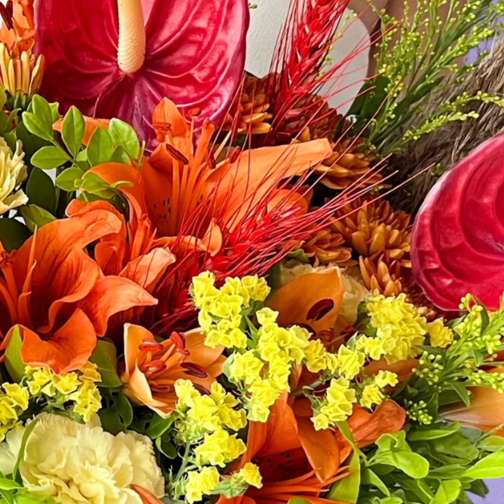 Asatic Lily Orange, Anthurium Red, Carnation Yellow, Chrysanthemum Yellow, Statice Yelow
