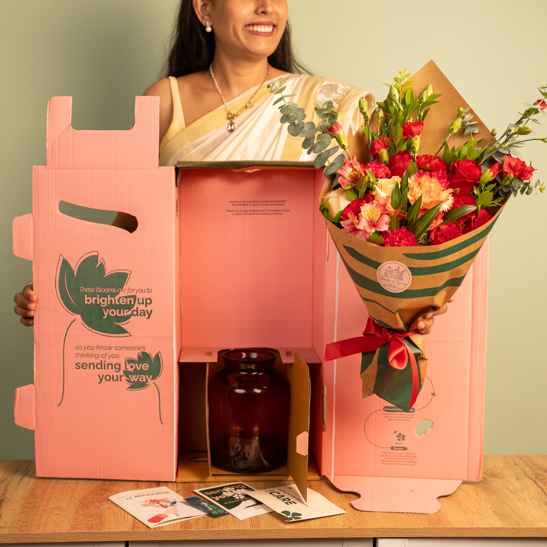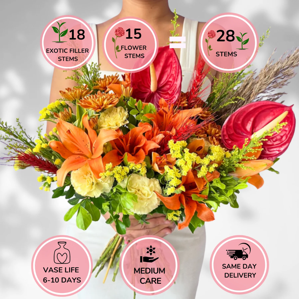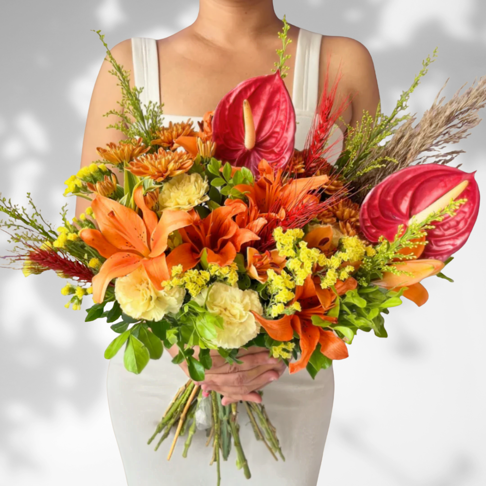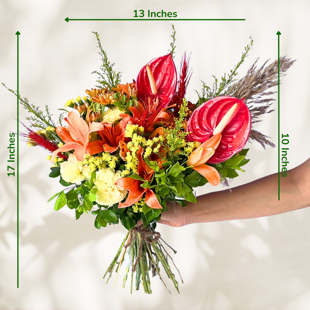 Introducing our "Sunset Glow " bouquet, a vibrant celebration of warm hues inspired by the breathtaking beauty of a sunset. This stunning arrangement features fiery orange lilies, elegant anthuriums, and cheerful yellow carnations, each bloom reflecting the mesmerizing colors of the evening sky. Perfect for brightening any space or expressing heartfelt emotions, the Sunset Radiance bouquet brings a touch of nature's brilliance into your home.