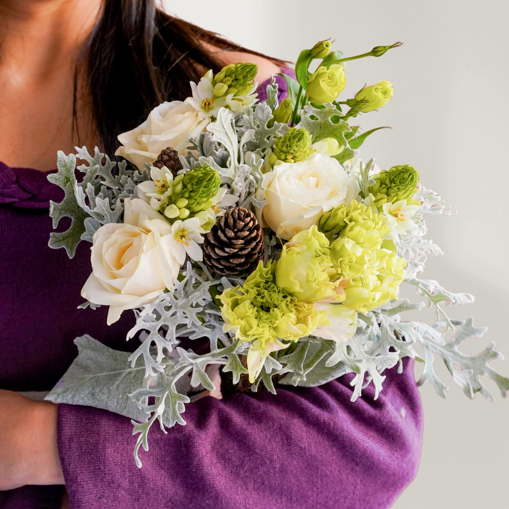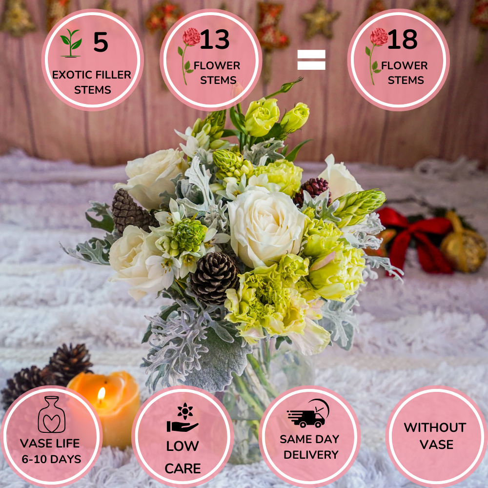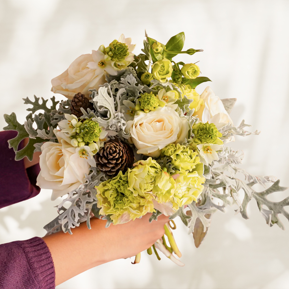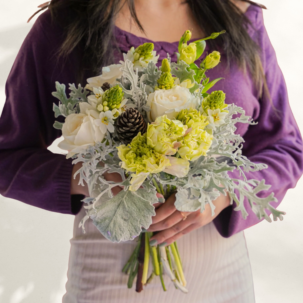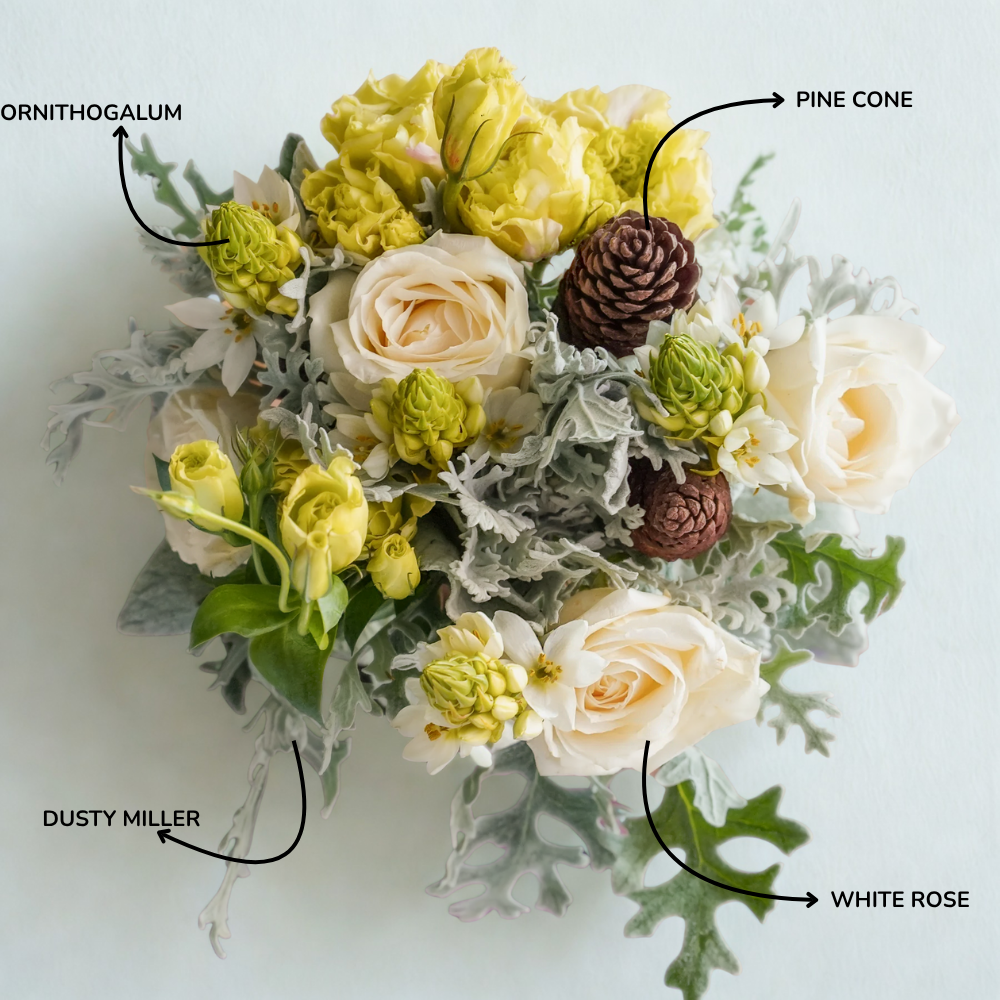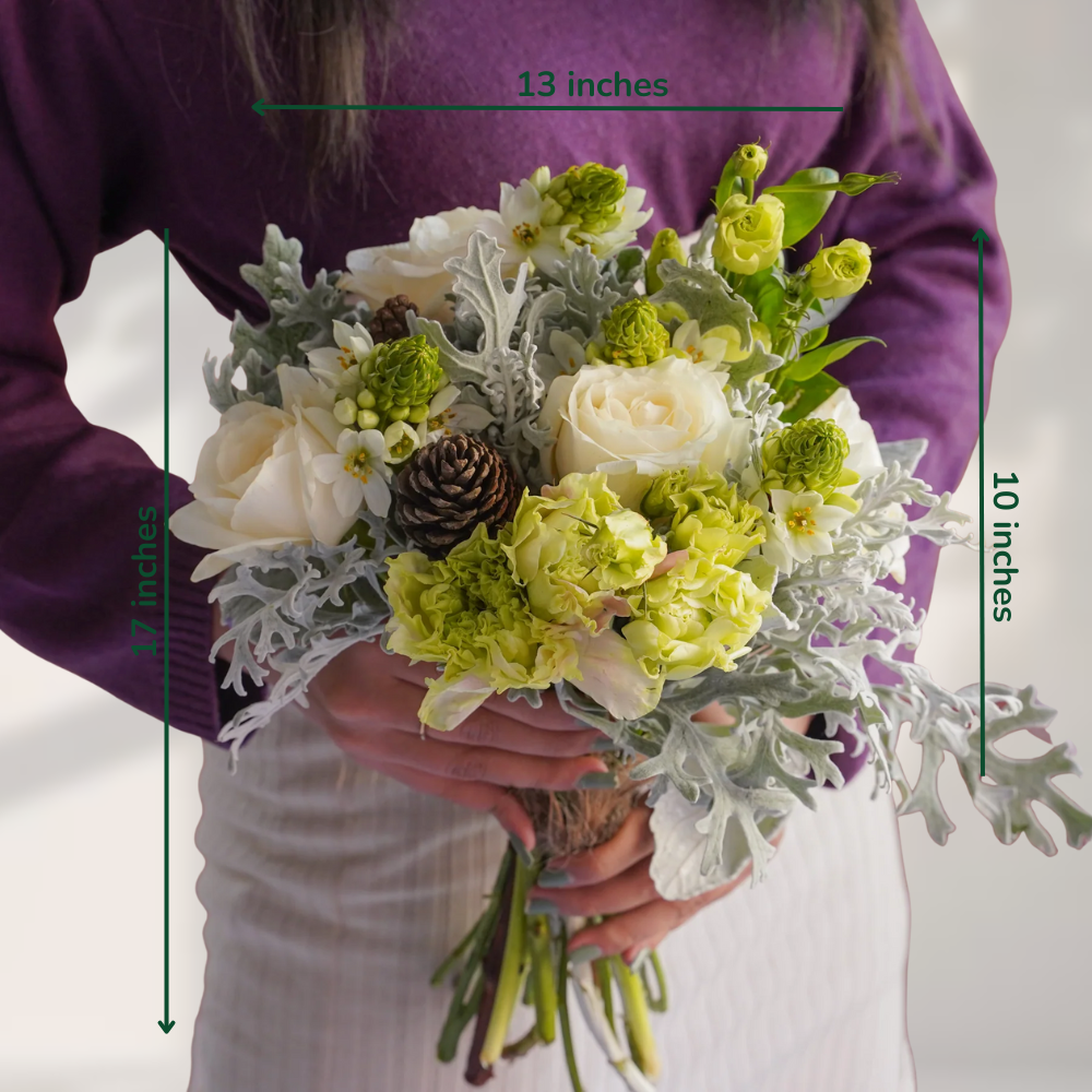 The white floral beauty is a Christmas showstopper, with snow dusted green fillers our mini bouquet embodies the spirit of winter and Christmas celebrations .