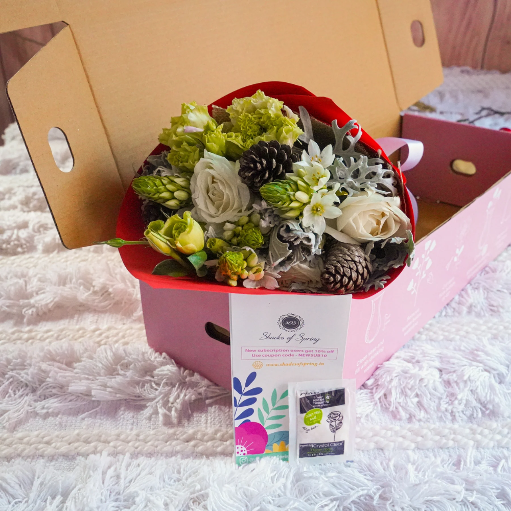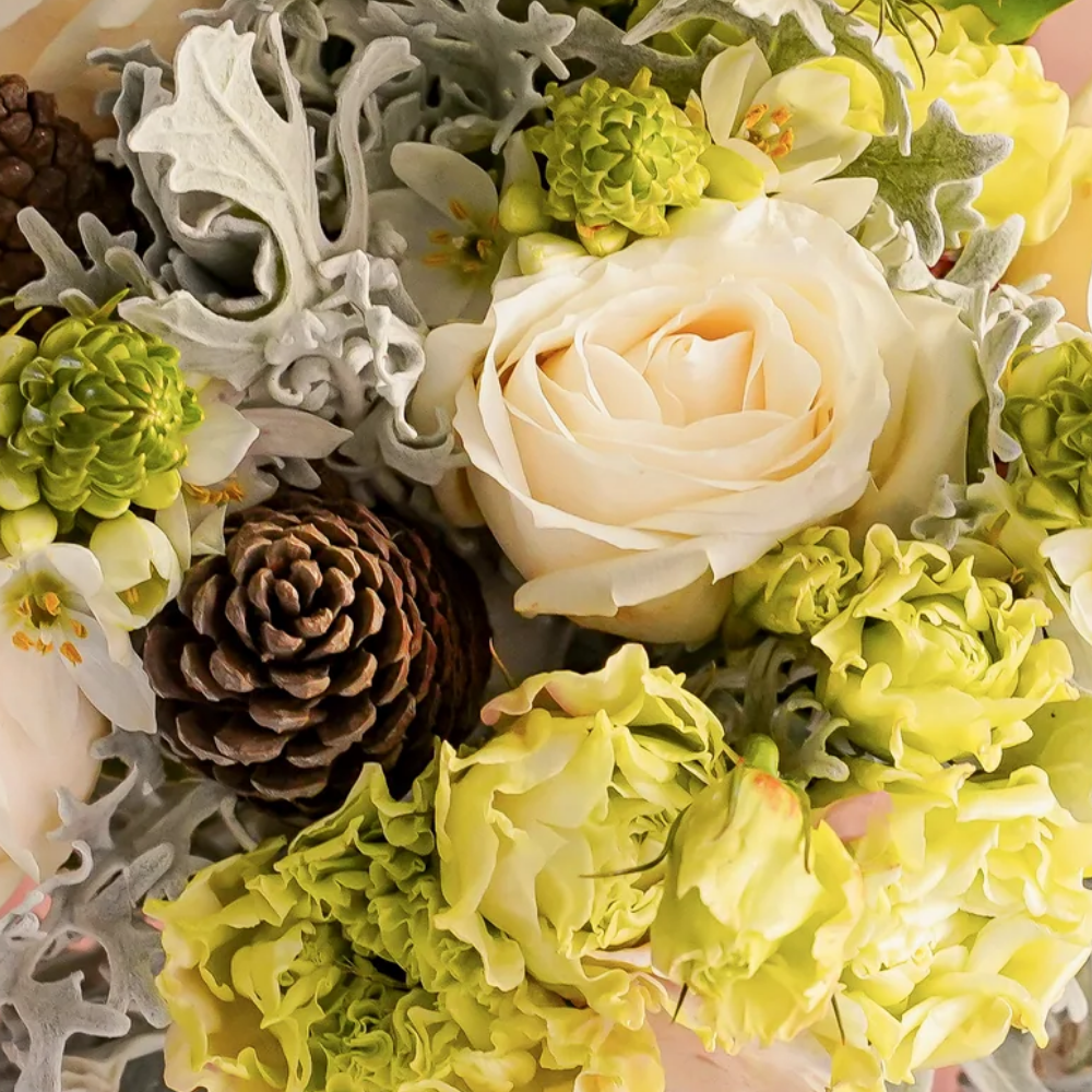 Rose white, Eustoma Green, Pine Cone, Orthohelium