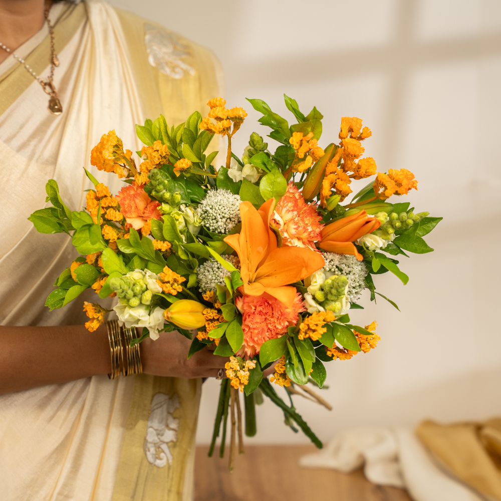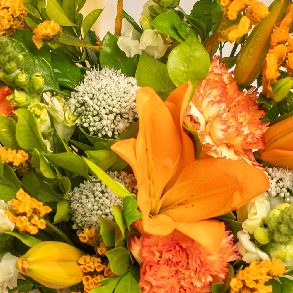 Asiatic Lily orange, Snapdragon yellow, Carnation orange, Alliums, Statice Orange, Kamini