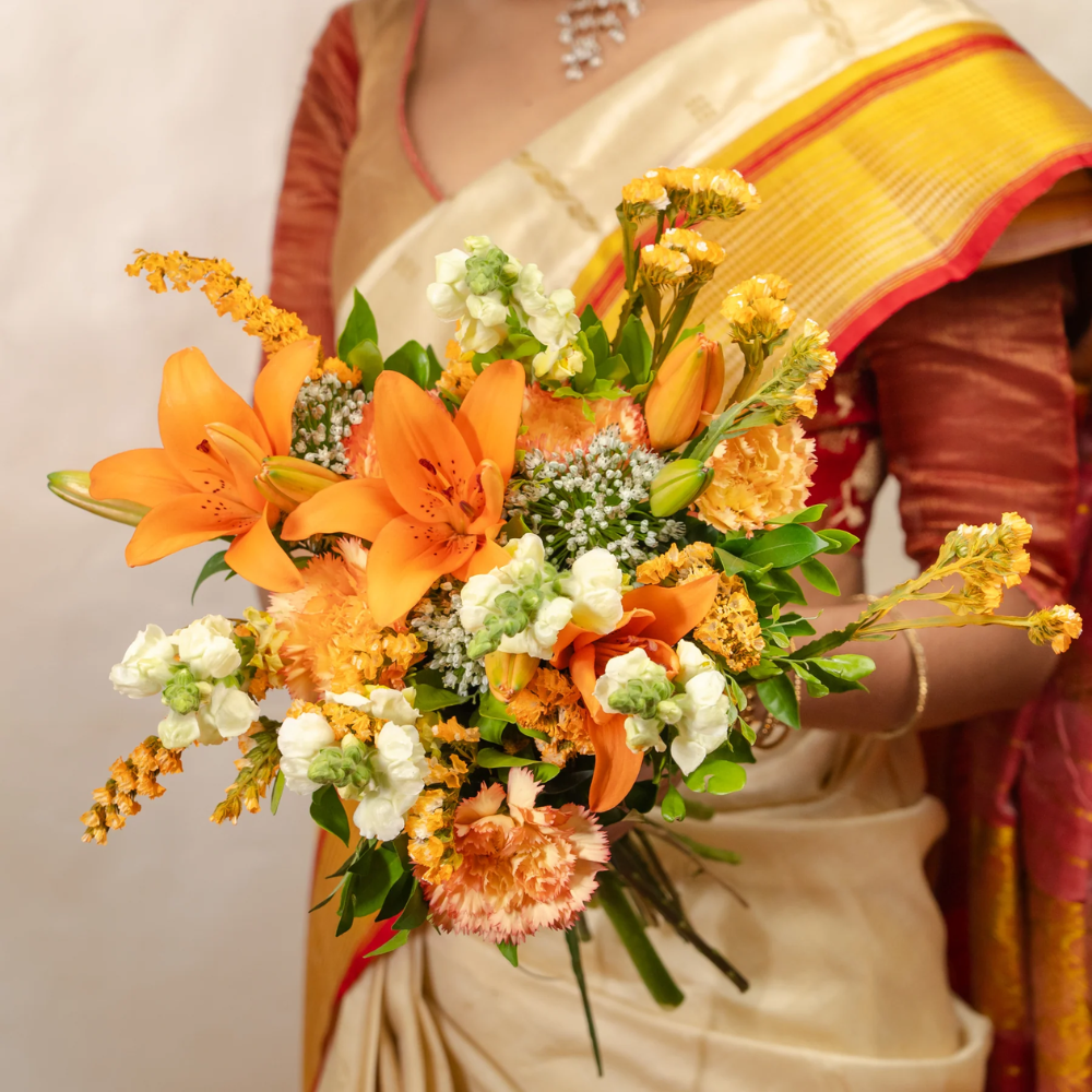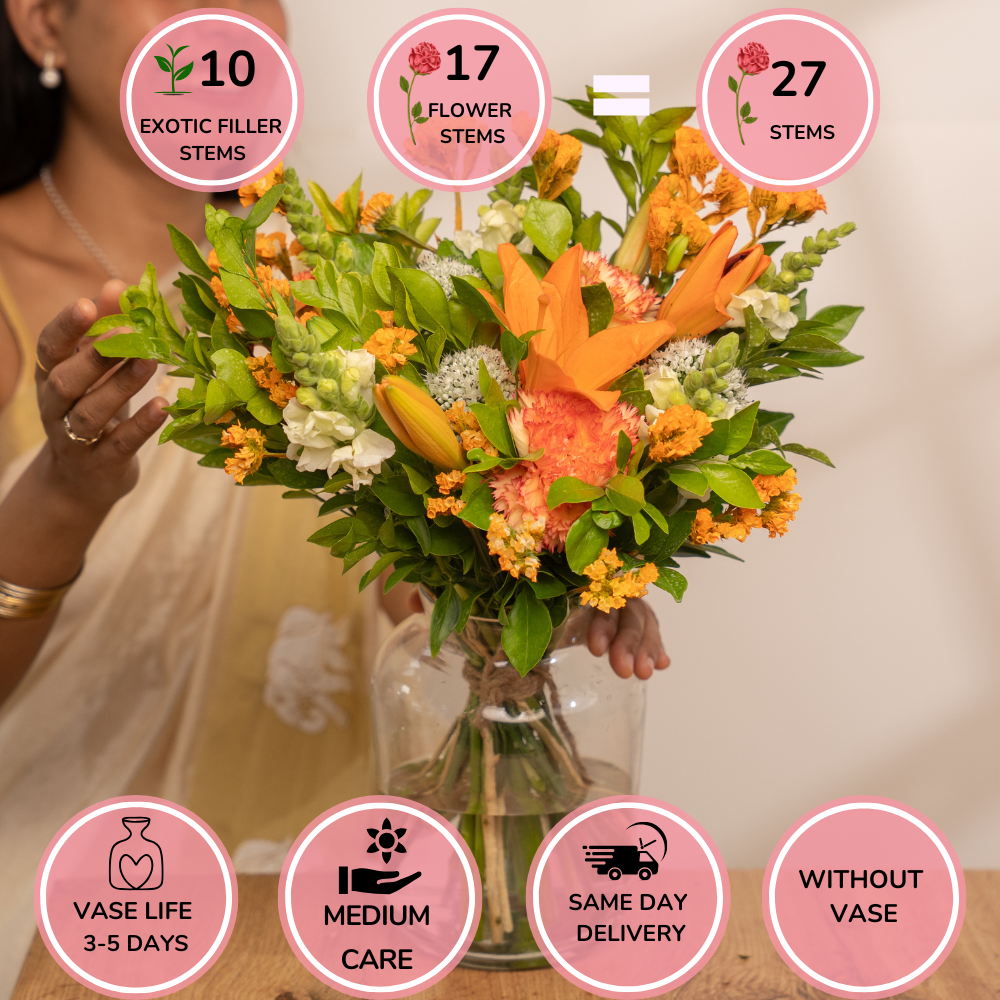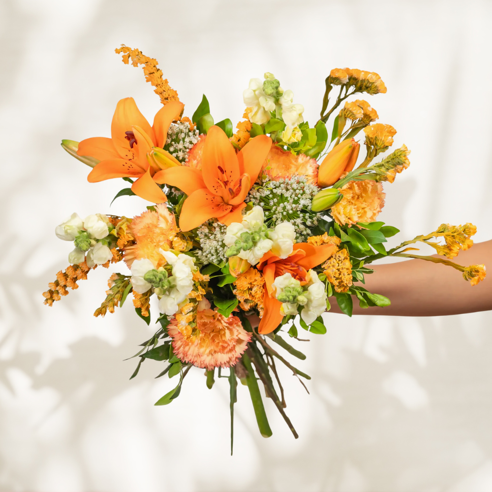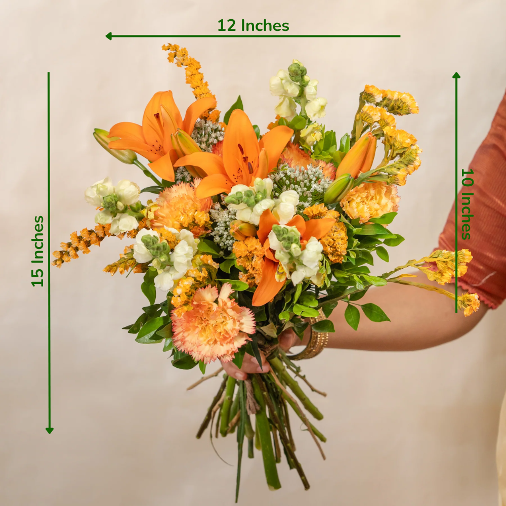 Brighten your day with our Bold Blossom bouquet featuring vibrant Asiatic Lilies, sunny Yellow Snapdragons, bold Orange Carnations, elegant Alliums, and lively Orange Statice, all enhanced by fragrant Kamini flowers. This lively arrangement is a perfect festivals in autumn.