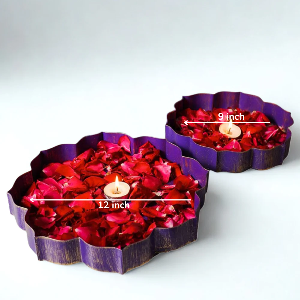 Handcrafted with precision, each urli features layered lotus petals in a royal purple and shimmering gold finish, exuding timeless charm and sophistication. Perfect for festivals, pooja corners, or as a statement centerpiece, these urlis beautifully hold floating candles or fresh flowers to create a warm, inviting ambience.