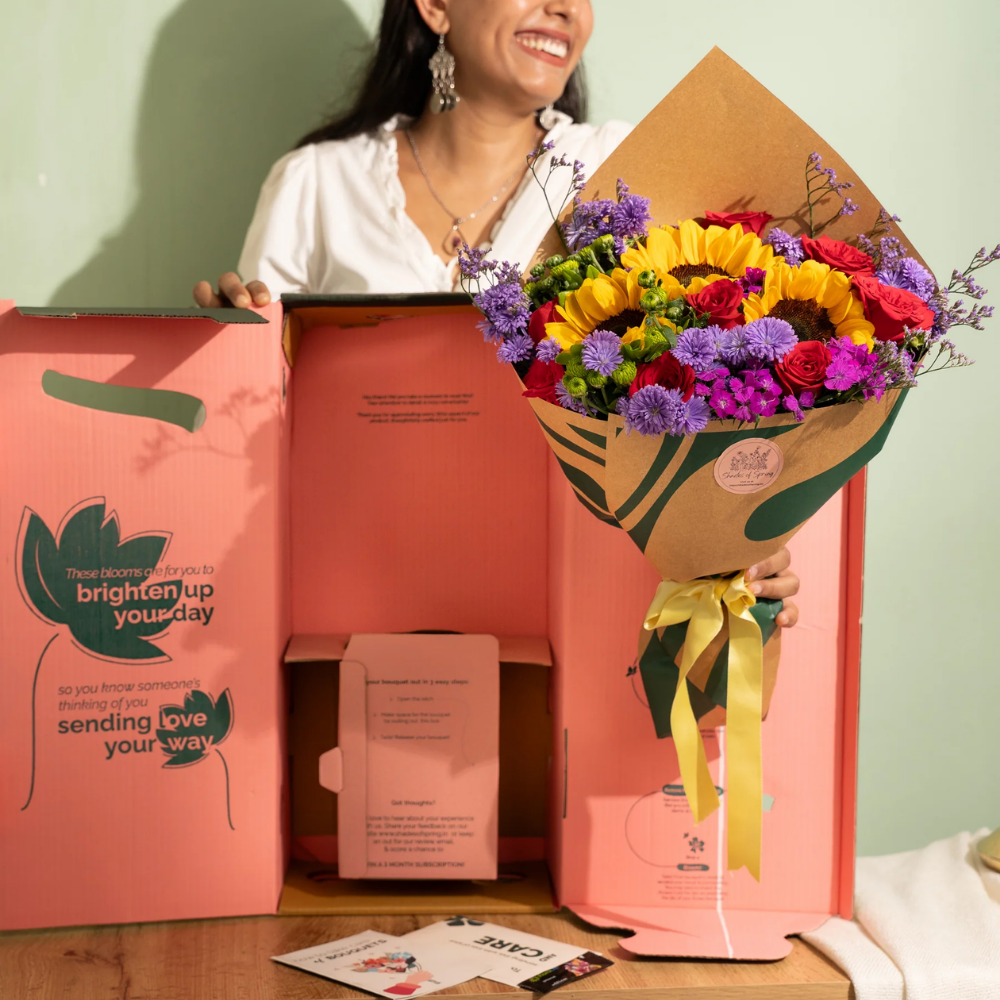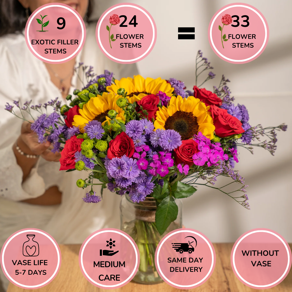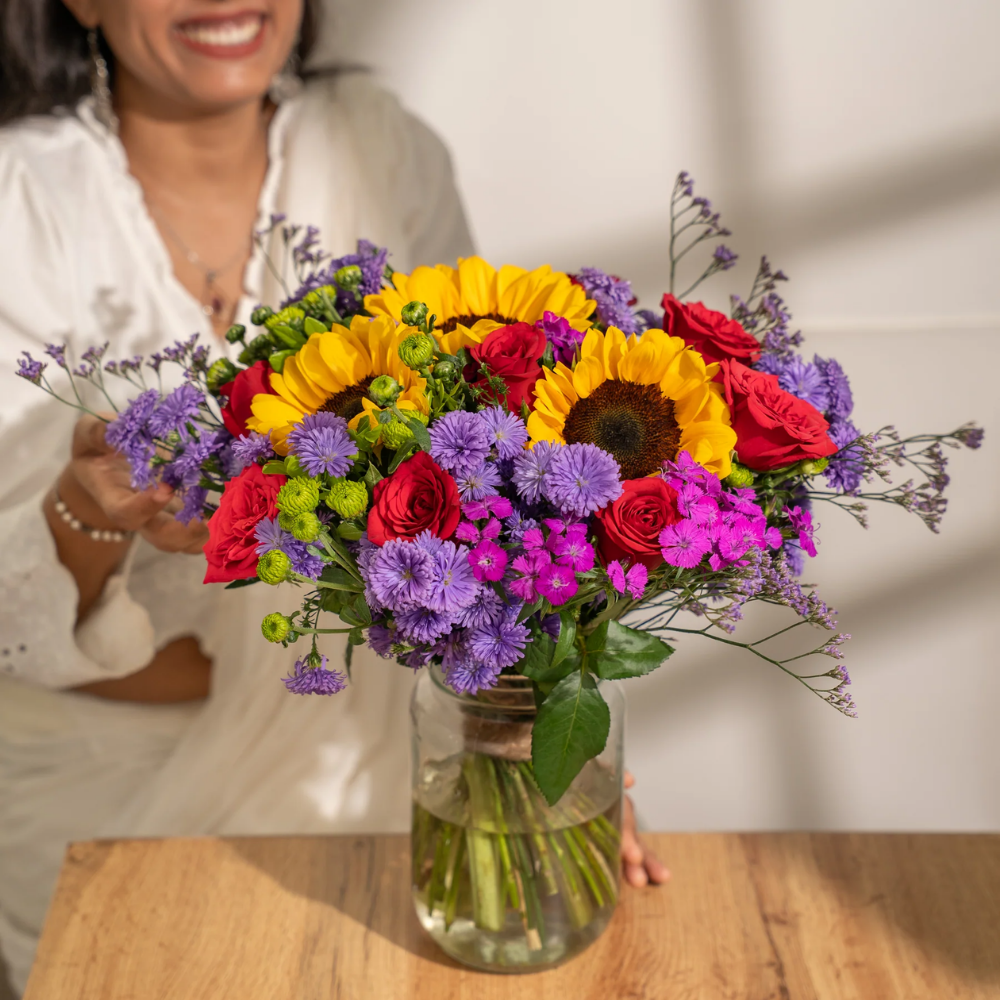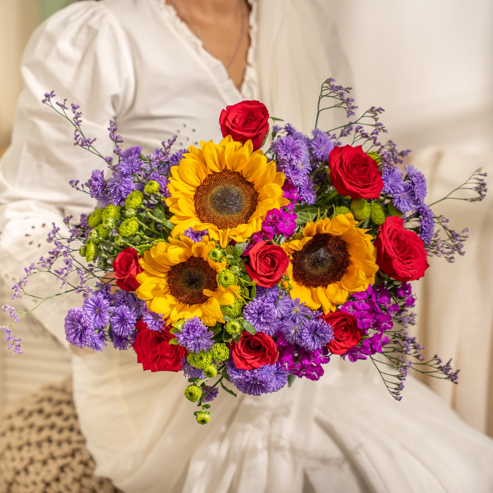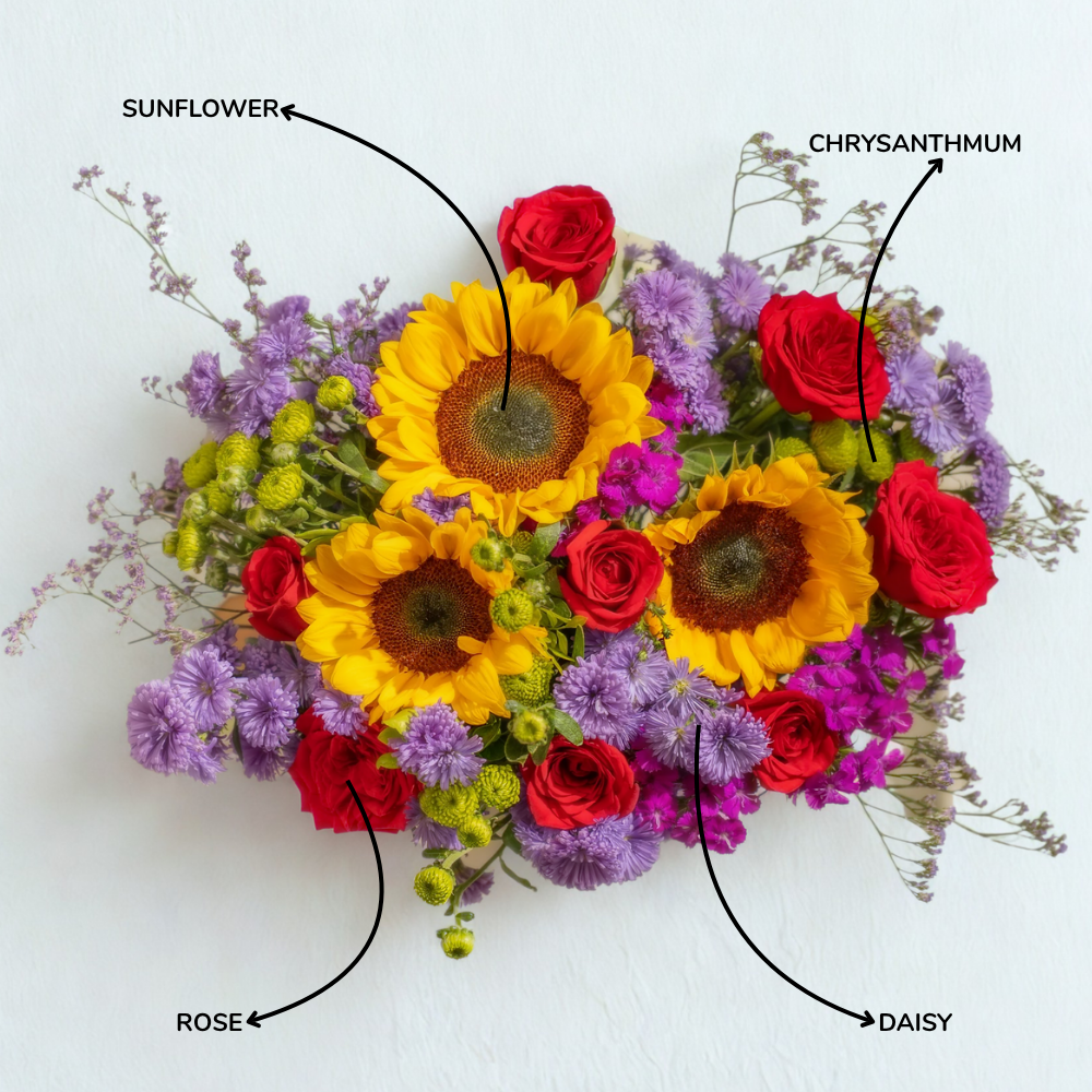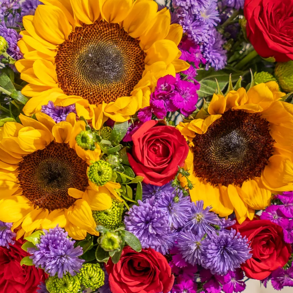 A bold and joyful celebration of color! Featuring radiant sunflowers, fiery red roses, pops of purple asters, lime green button chrysanthemums, and delicate fillers—this bouquet bursts with happiness and cheer. Simply to spread sunshine and smiles.