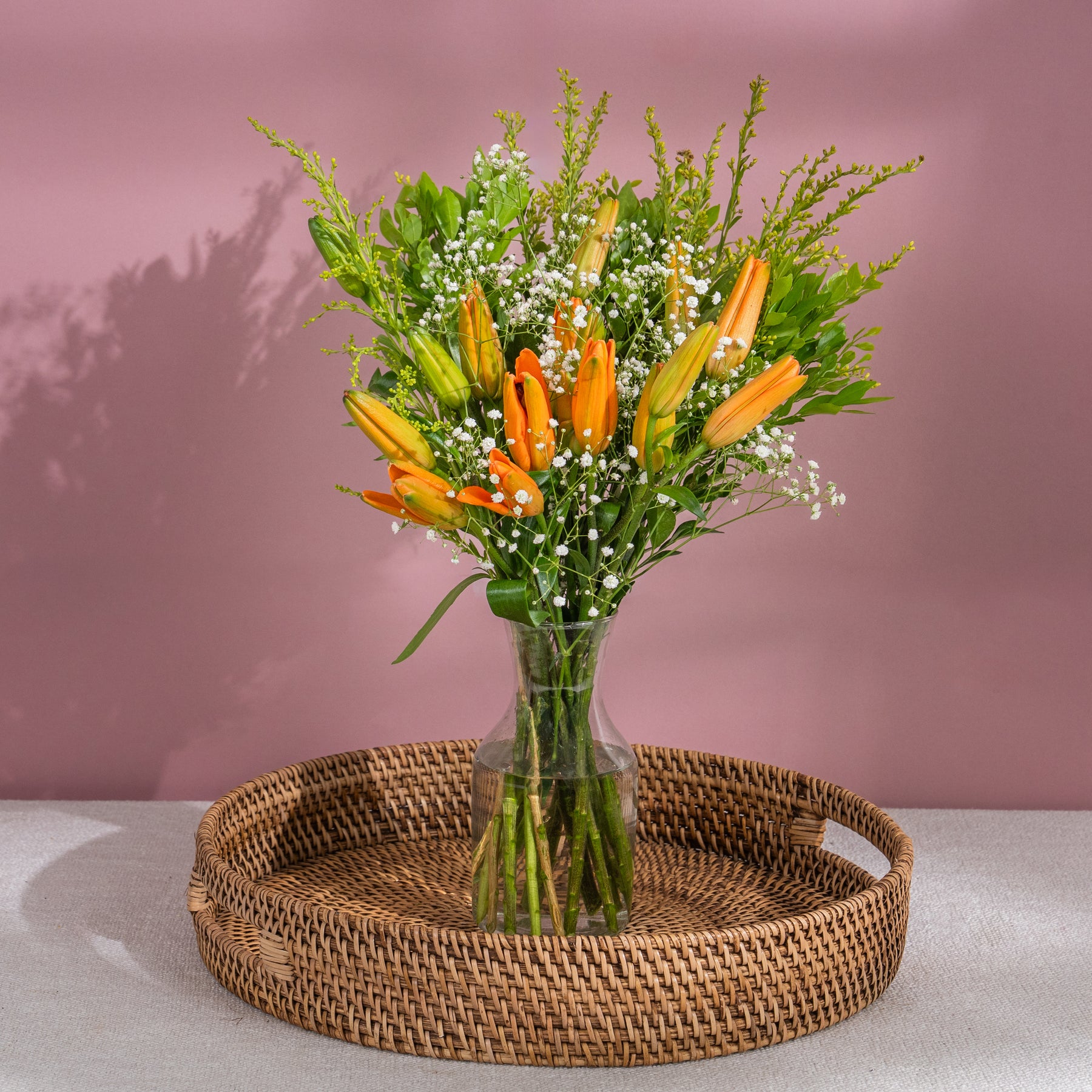 This arrangement features fresh Asiatic orange lily cut stems paired with delicate seasonal fillers for a bold yet balanced floral look. With their striking color and elegant form, orange lilies bring warmth, positivity, and a refreshing burst of brightness to any space.