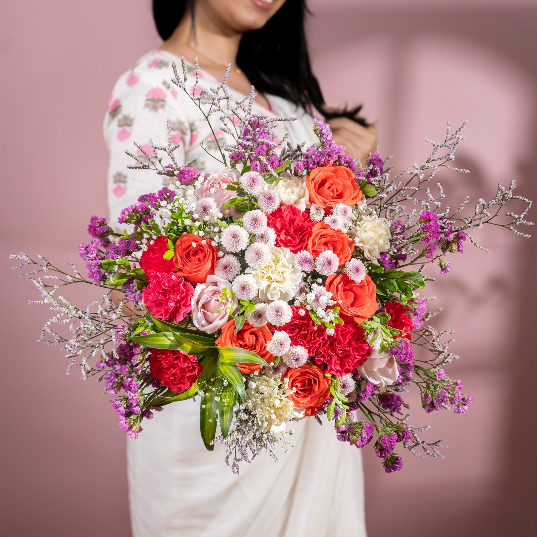 Orange rose, dark pink carnation, sweet rose, white carnation, limonium, calimero light pink, gypsophila, pink statice, song of Jamaica, and kamini.