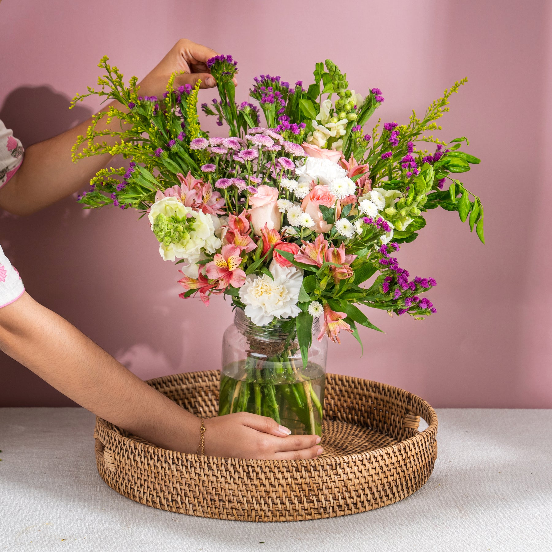 SnapDragon White Jumelia Rose Calimero White Calimero Pink Alstromeria Pink Carnation White Statice Pink Kamini GoldenRod