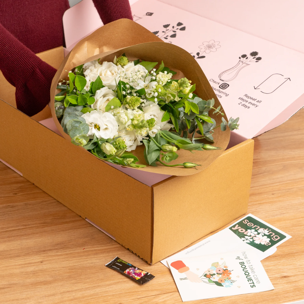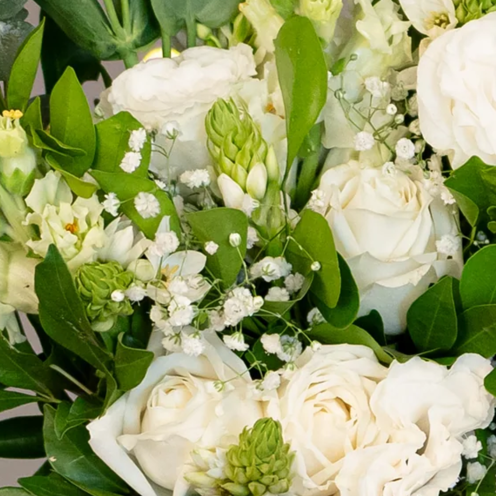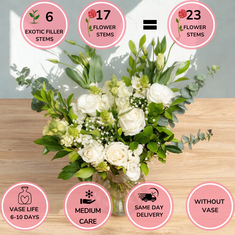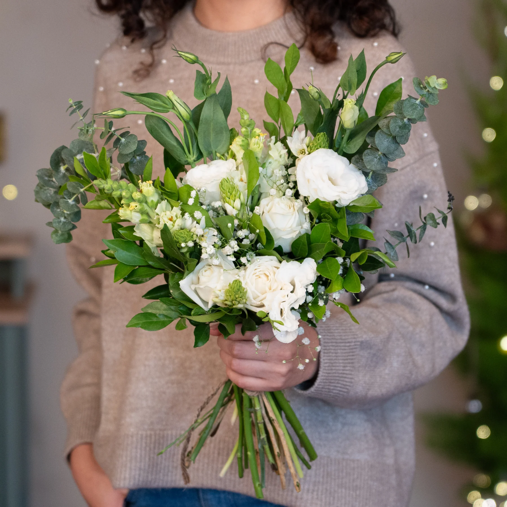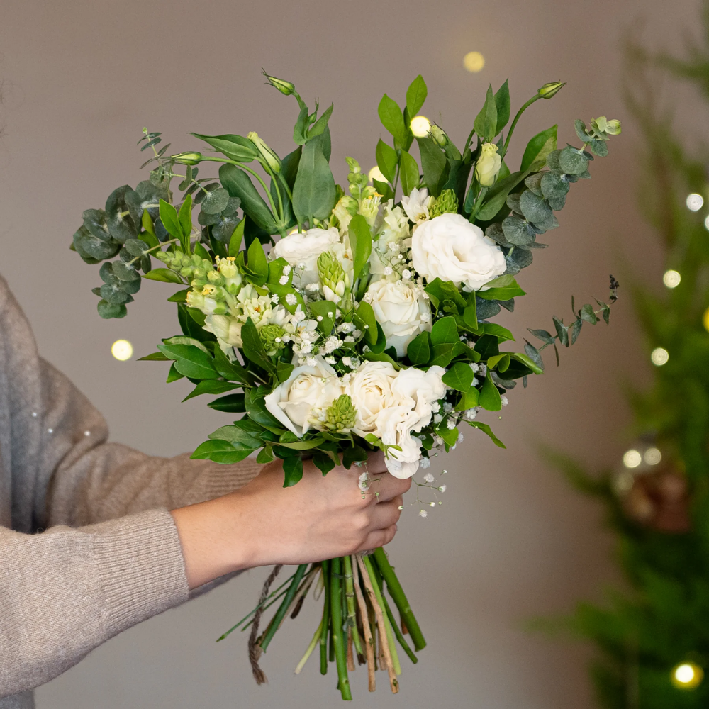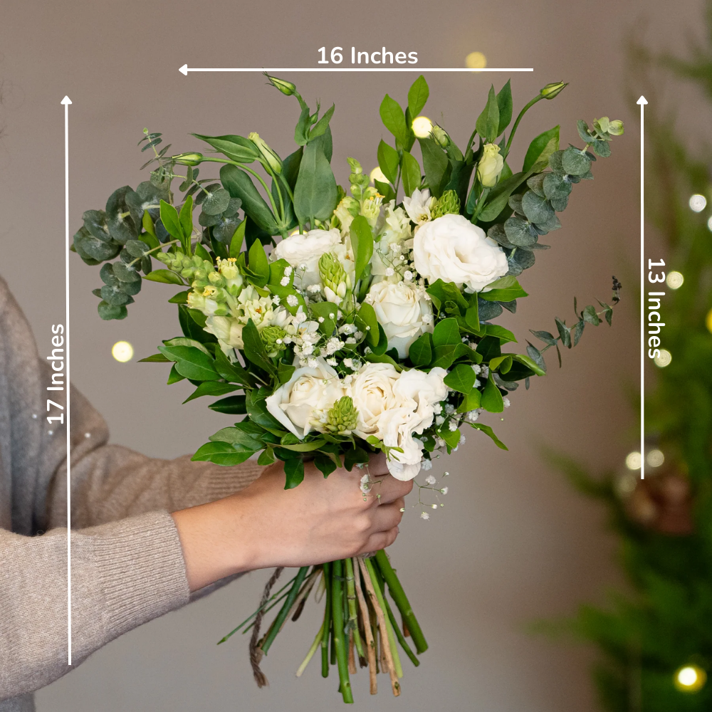 Embrace the serene beauty of the season with this enchanting bouquet of white roses, delicate eustomas, elegant snapdragons, and charming ornithogalum. Accented with airy gypsophila, baby dollar eucalyptus, and fragrant kamini, this arrangement radiates winter's purity and sophistication—perfect for adding a touch of elegance to your holiday celebrations.
