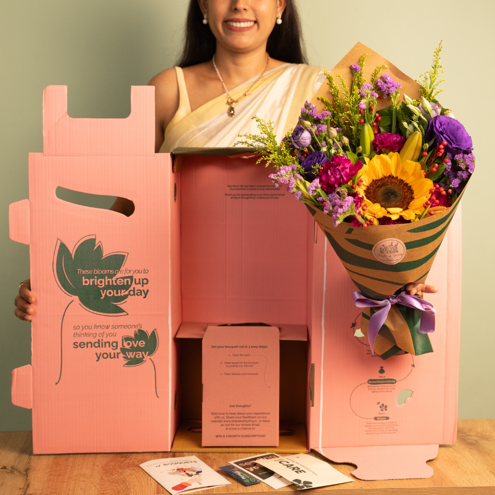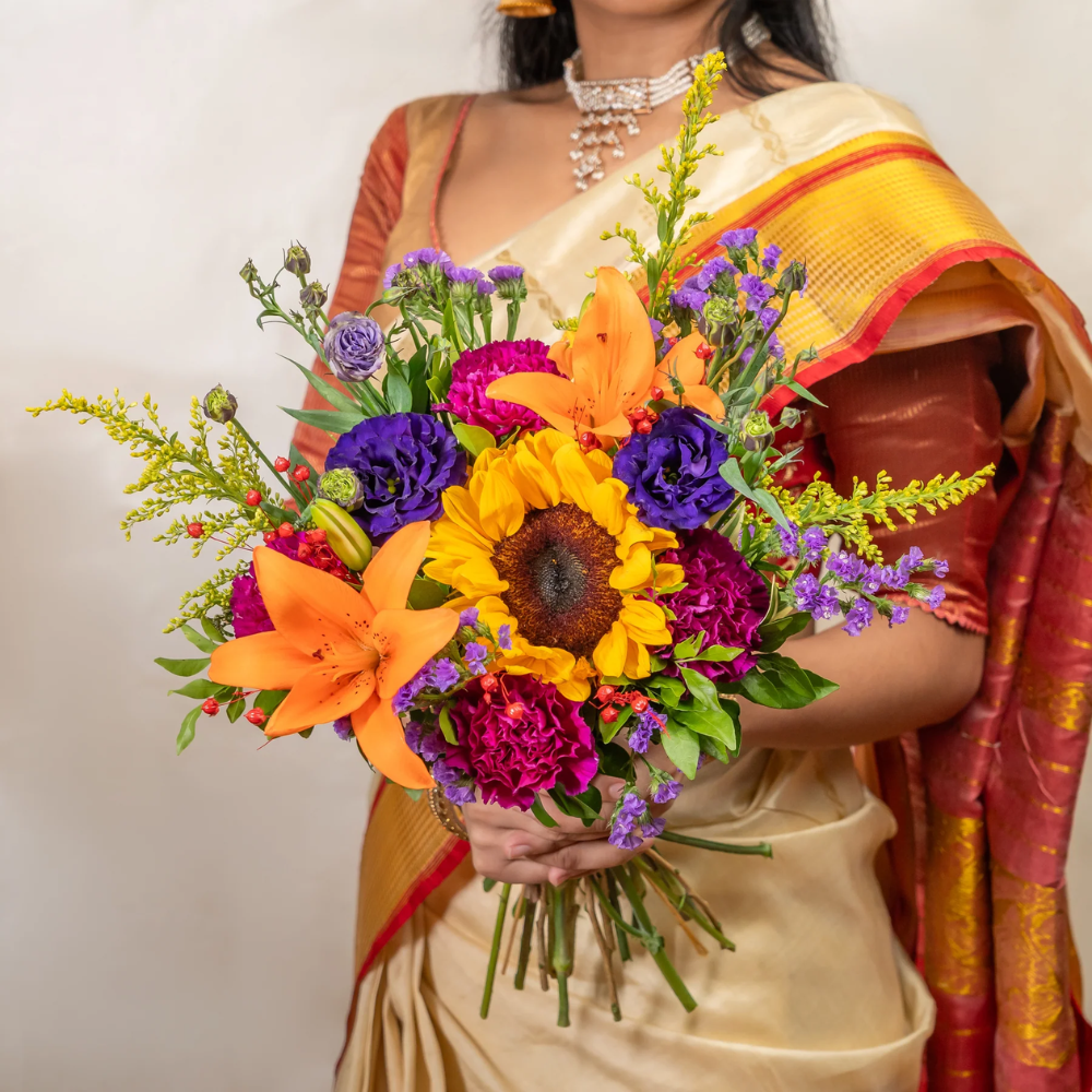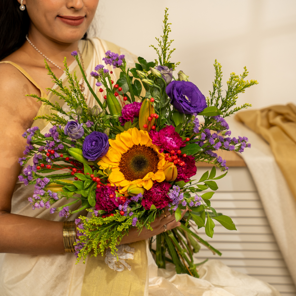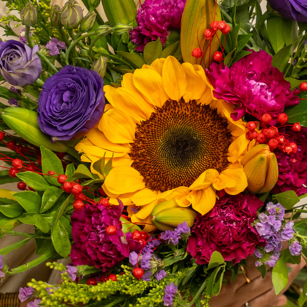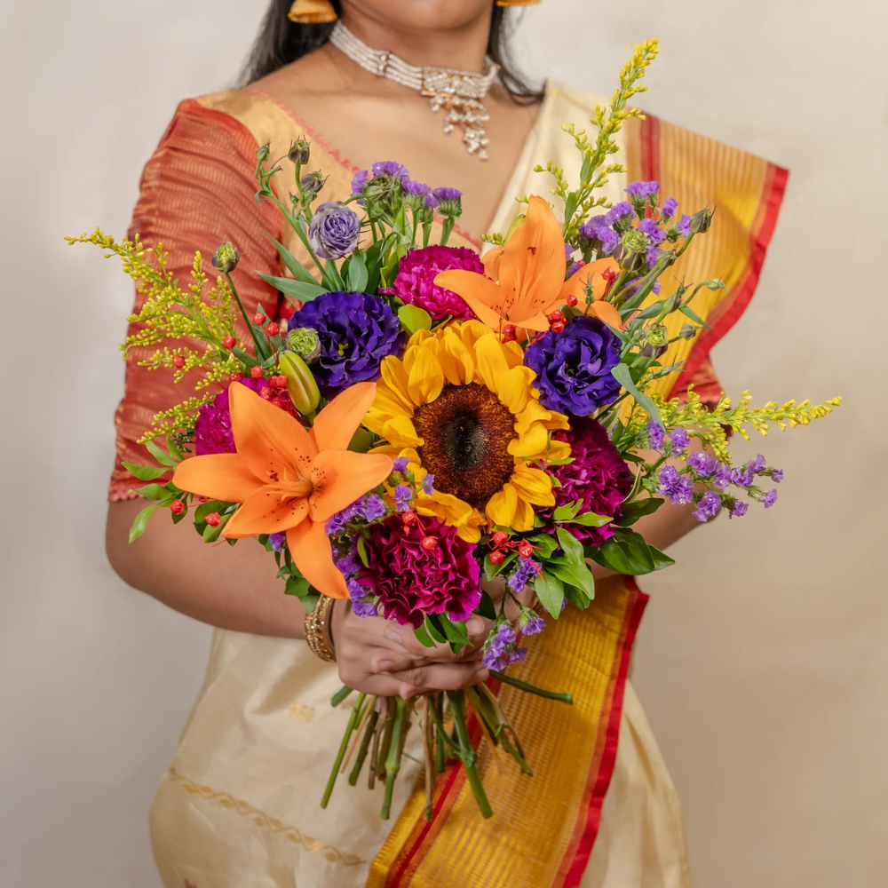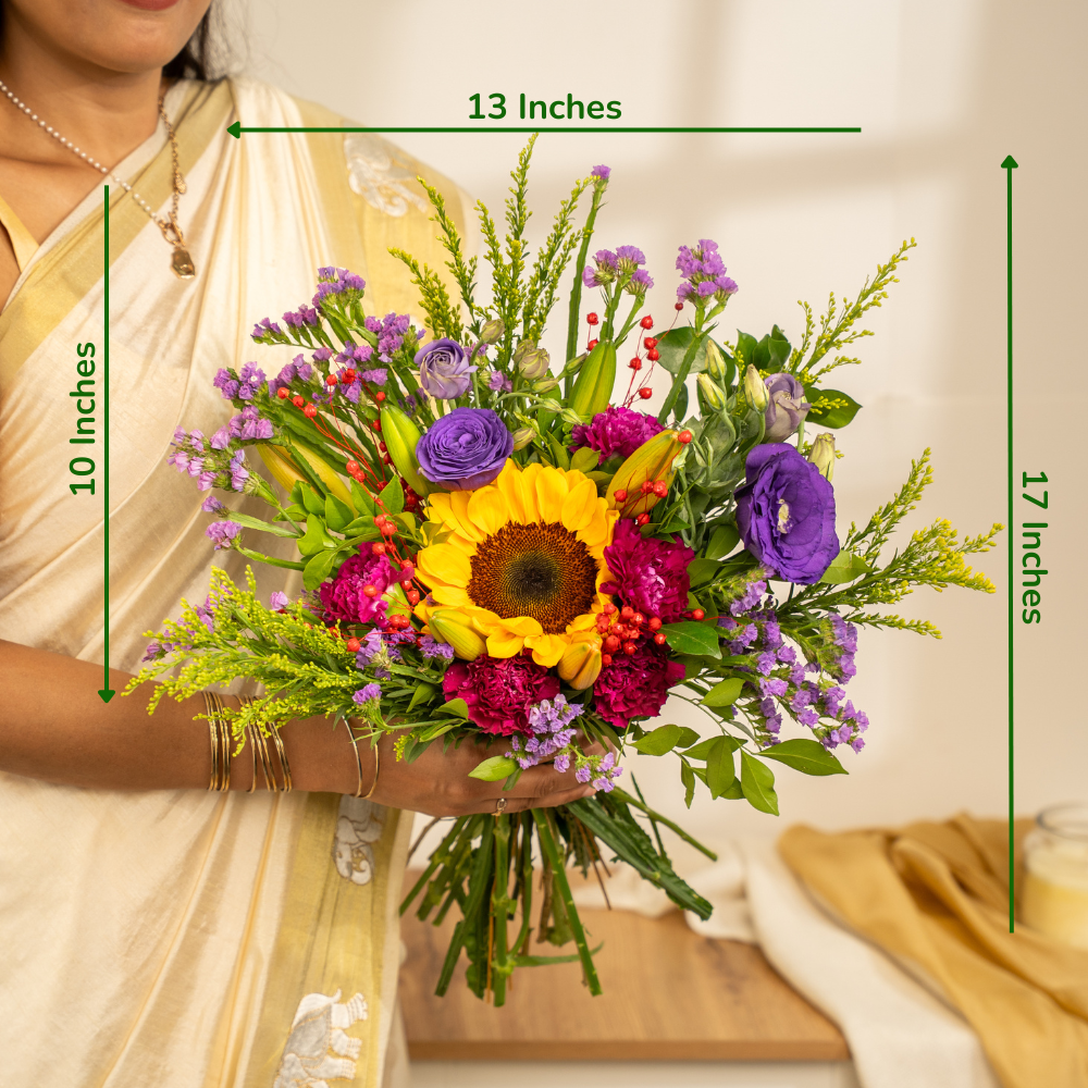 "Illuminate any space with our Floral Fiesta, featuring cheerful Sunflowers, vibrant purple Carnations, and elegant Eustoma. Beautifully complemented by striking orange lilies and whimsical Statice, this arrangement is enhanced with the enchanting fragrance of Kamini, golden accents, and a touch of red flax seed, creating a stunning celebration of color and joy."