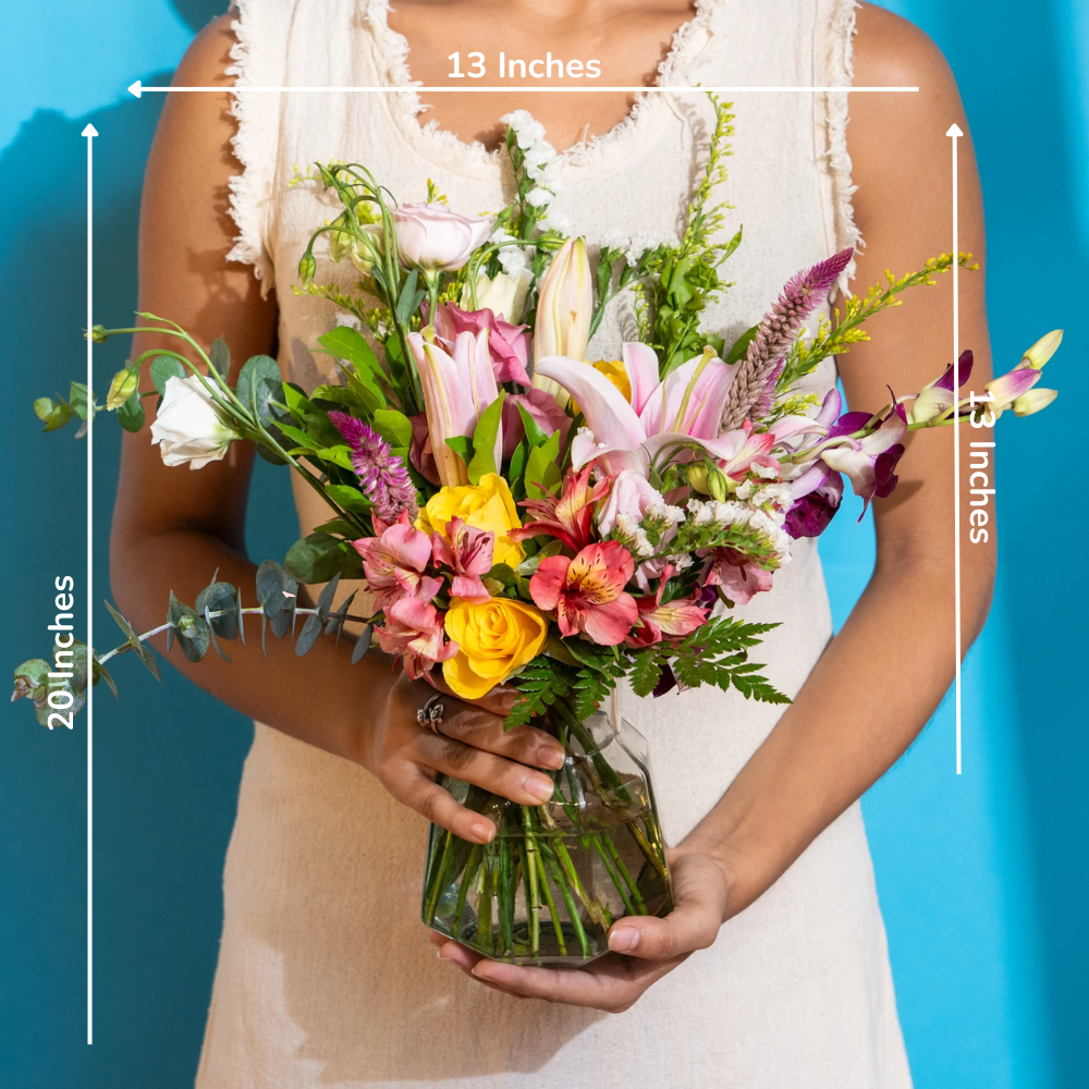 Delicate pink lilies intertwine with majestic purple orchids, creating a mesmerizing blend of color and fragrance. Each bloom radiates with beauty, evoking a sense of admiration and affection. Perfect for expressing love, gratitude, or admiration, Blushing Beauty is a stunning gift that will leave a lasting impression on any recipient.