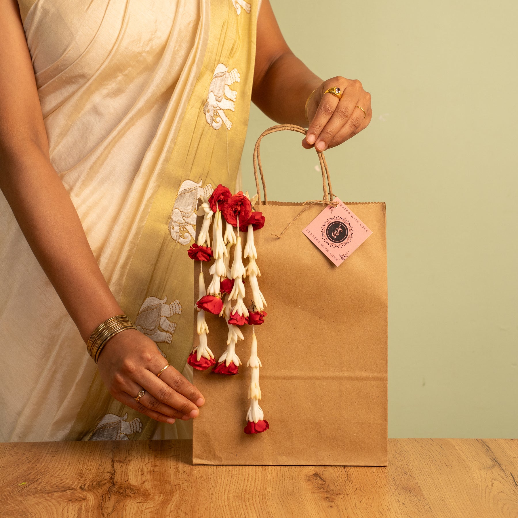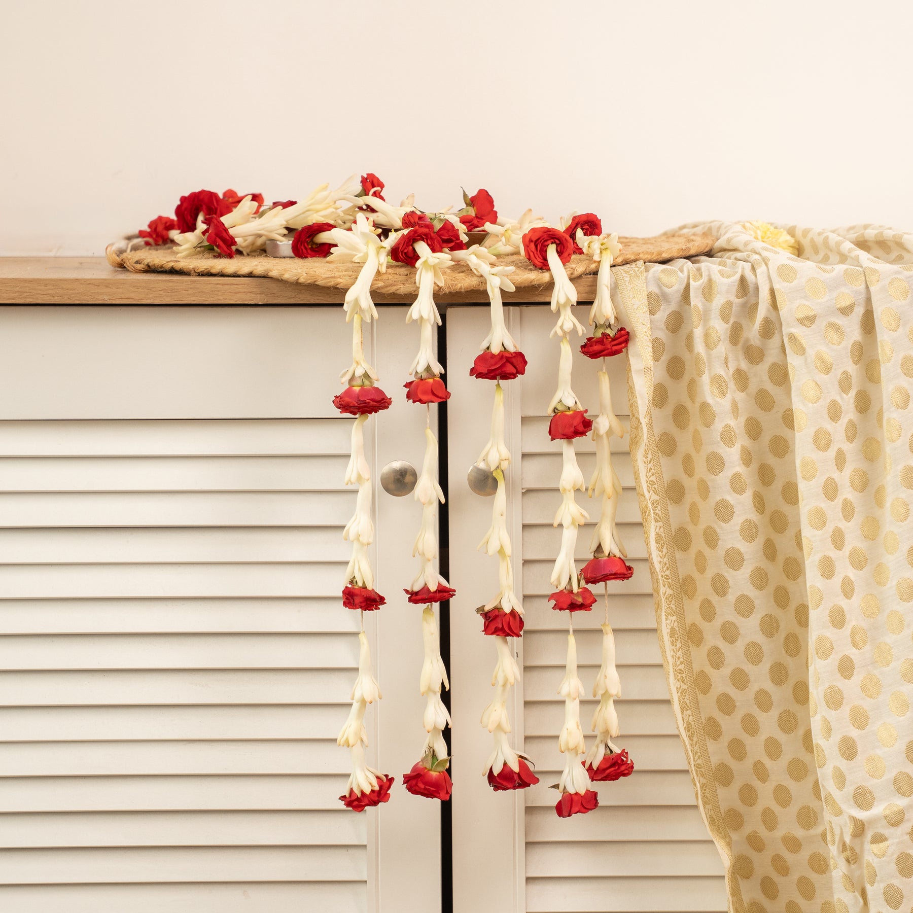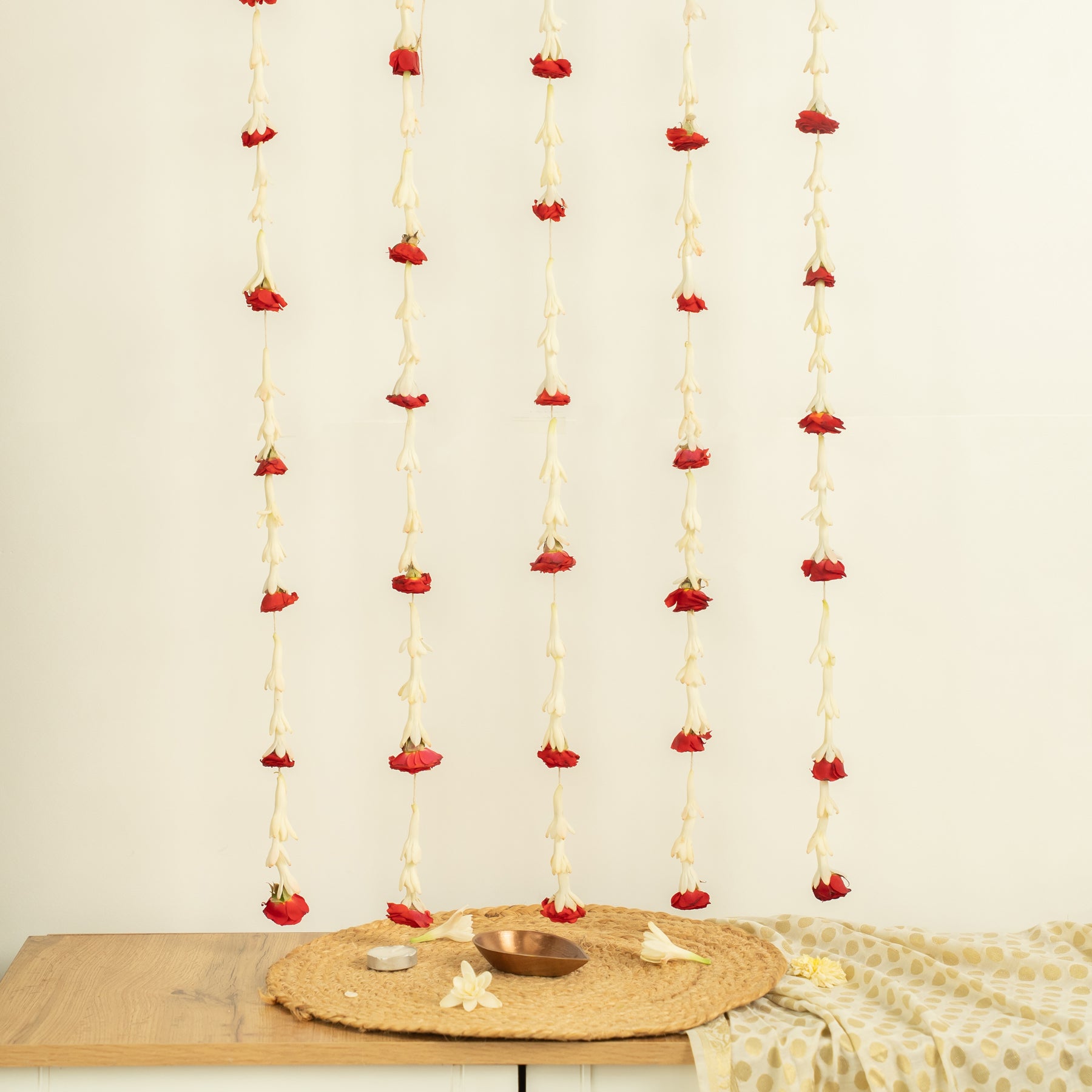 A delicate fusion of purity and romance, this handcrafted set features five floral strings adorned with pristine Rajnigandha blooms, each accented by a single soft-hued rose.